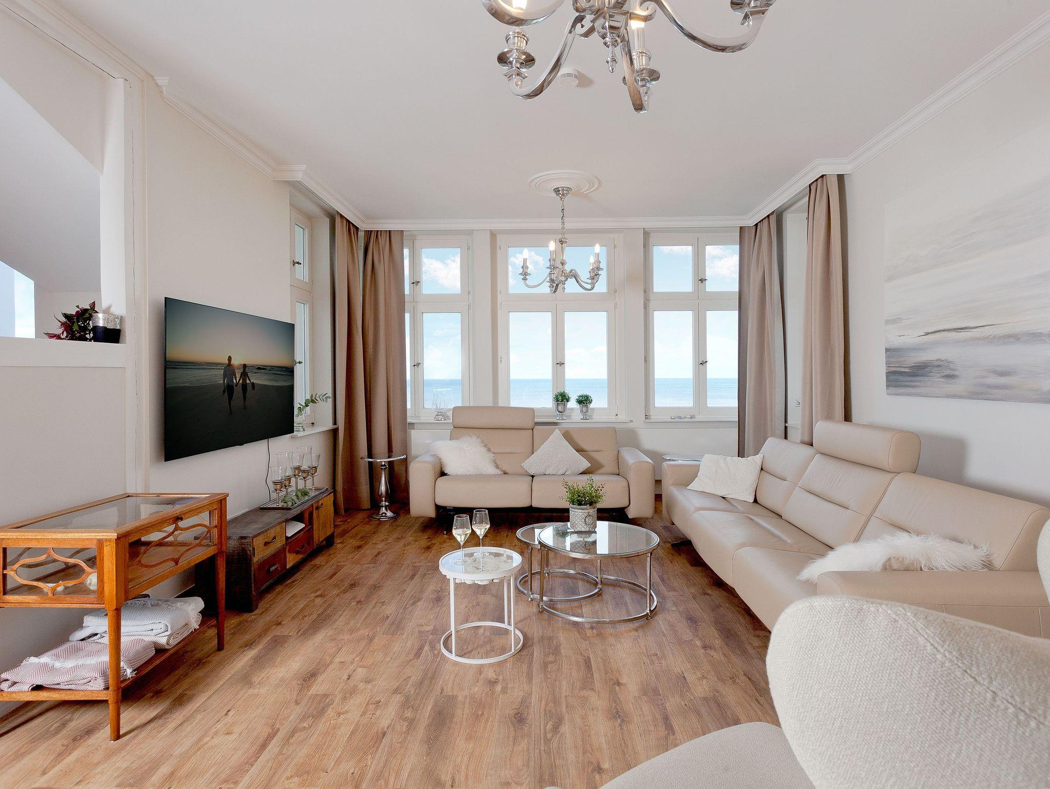 Mehr Meerblick geht nicht! 1. Reihe, zwei Balkone mit grandioser Aussicht auf der Seeseite, ein Sundowner-Balkon auf der Waldseite und dazwischen eine großzügige, lichtdurchflutete Strandvillen-Wohnung, die nur darauf wartet, Ihnen ein ruhiges Refugium hoch über dem fröhlichen Trubel der Strandpromenade zu sein.