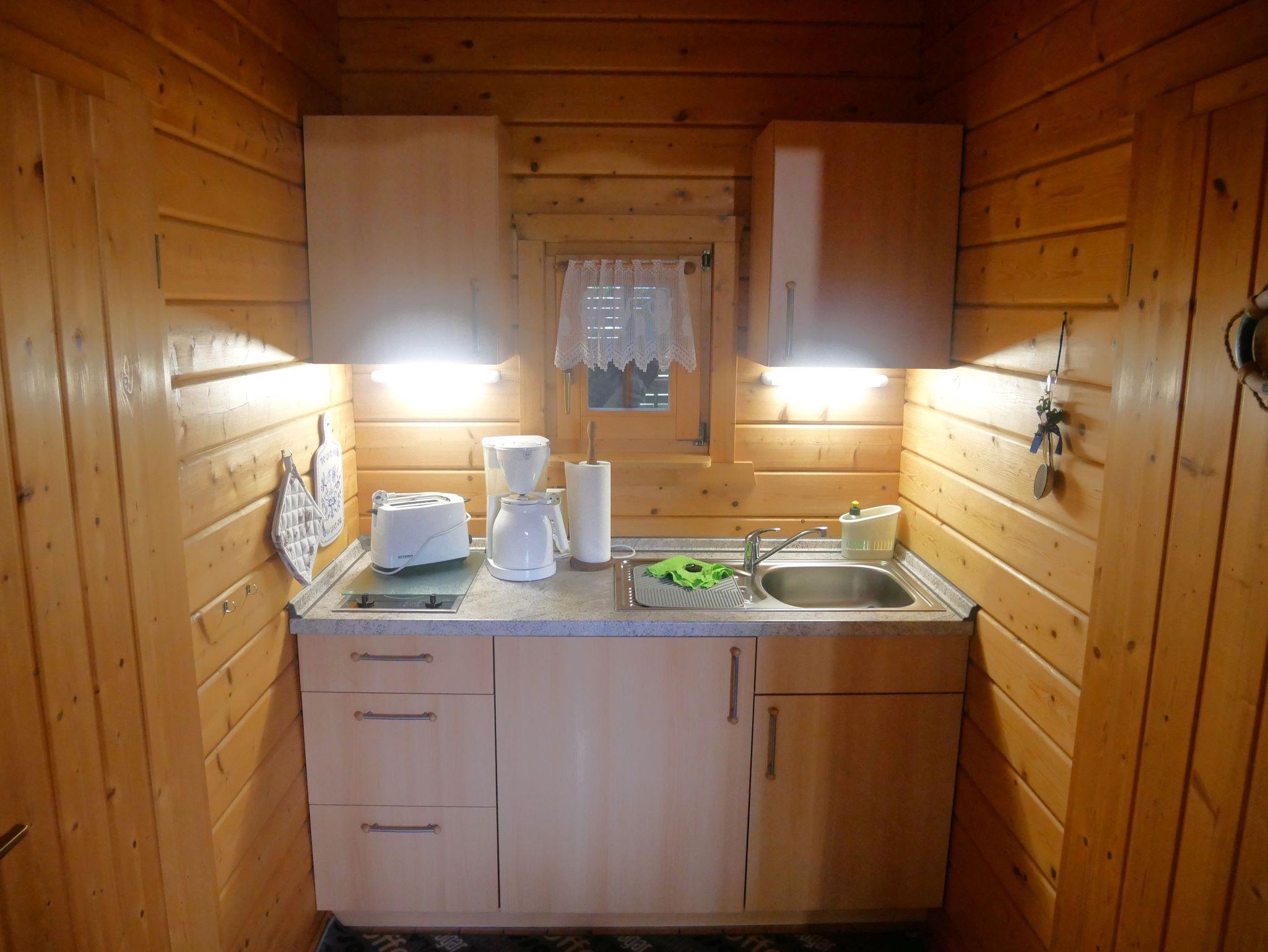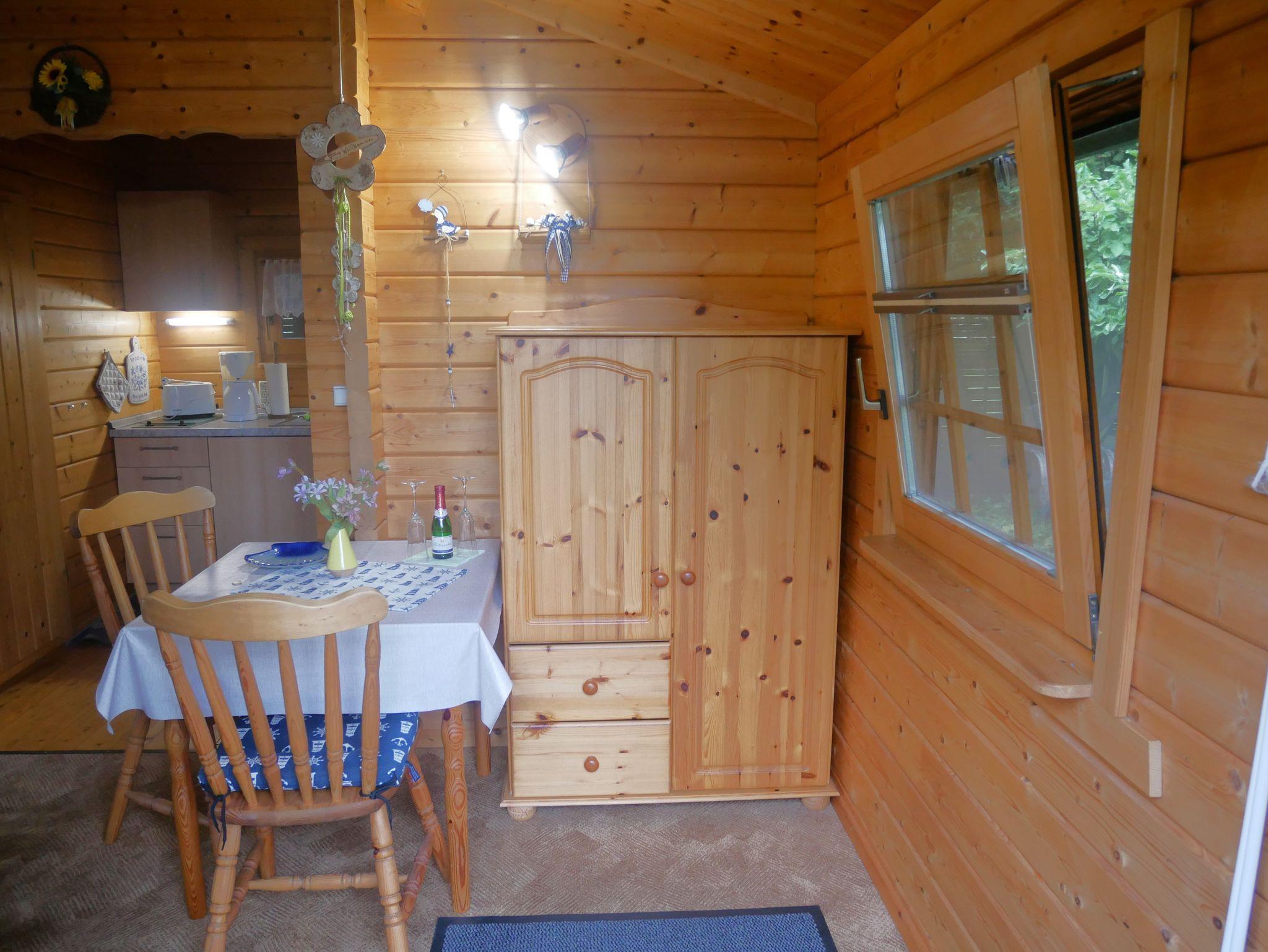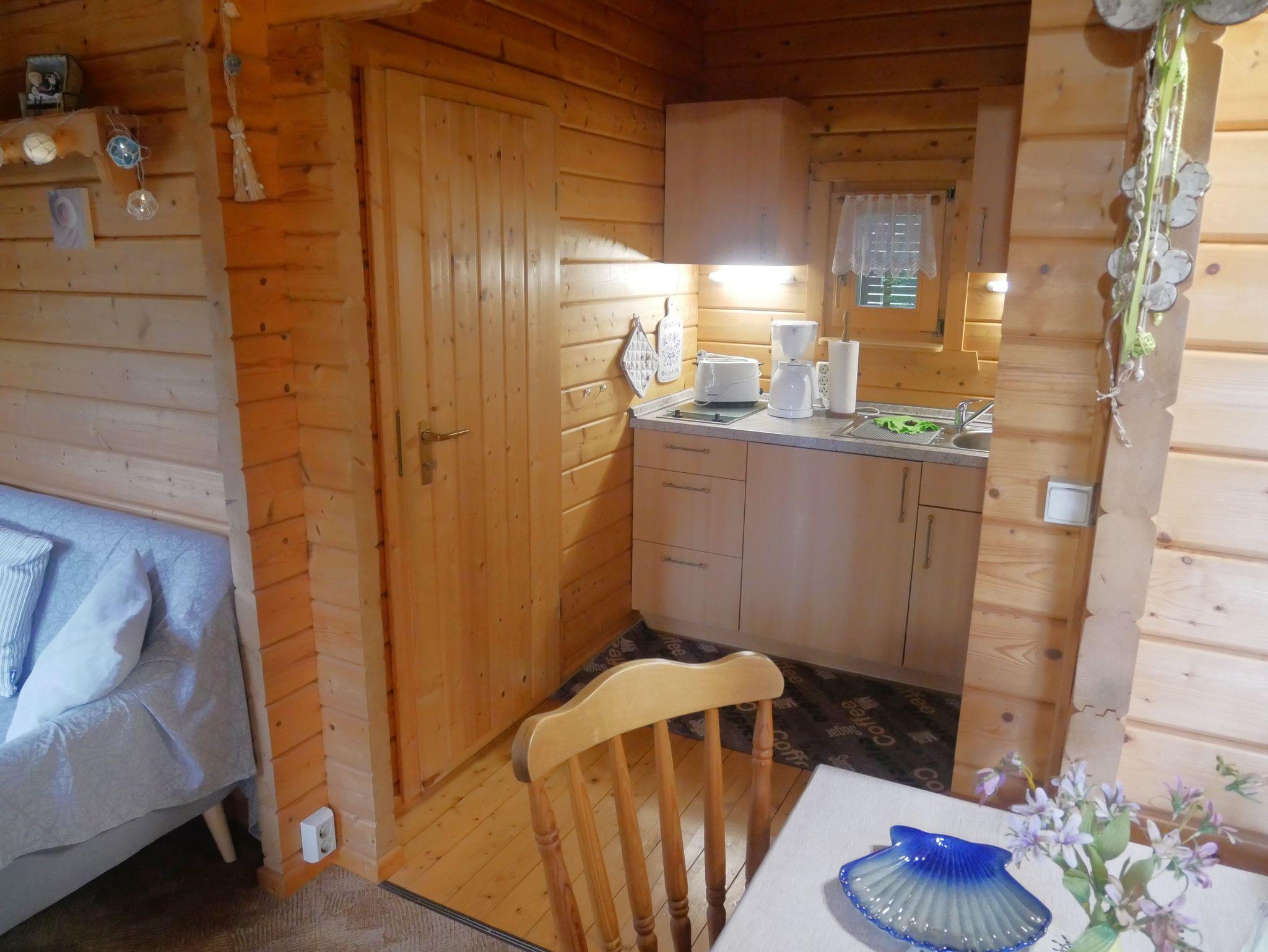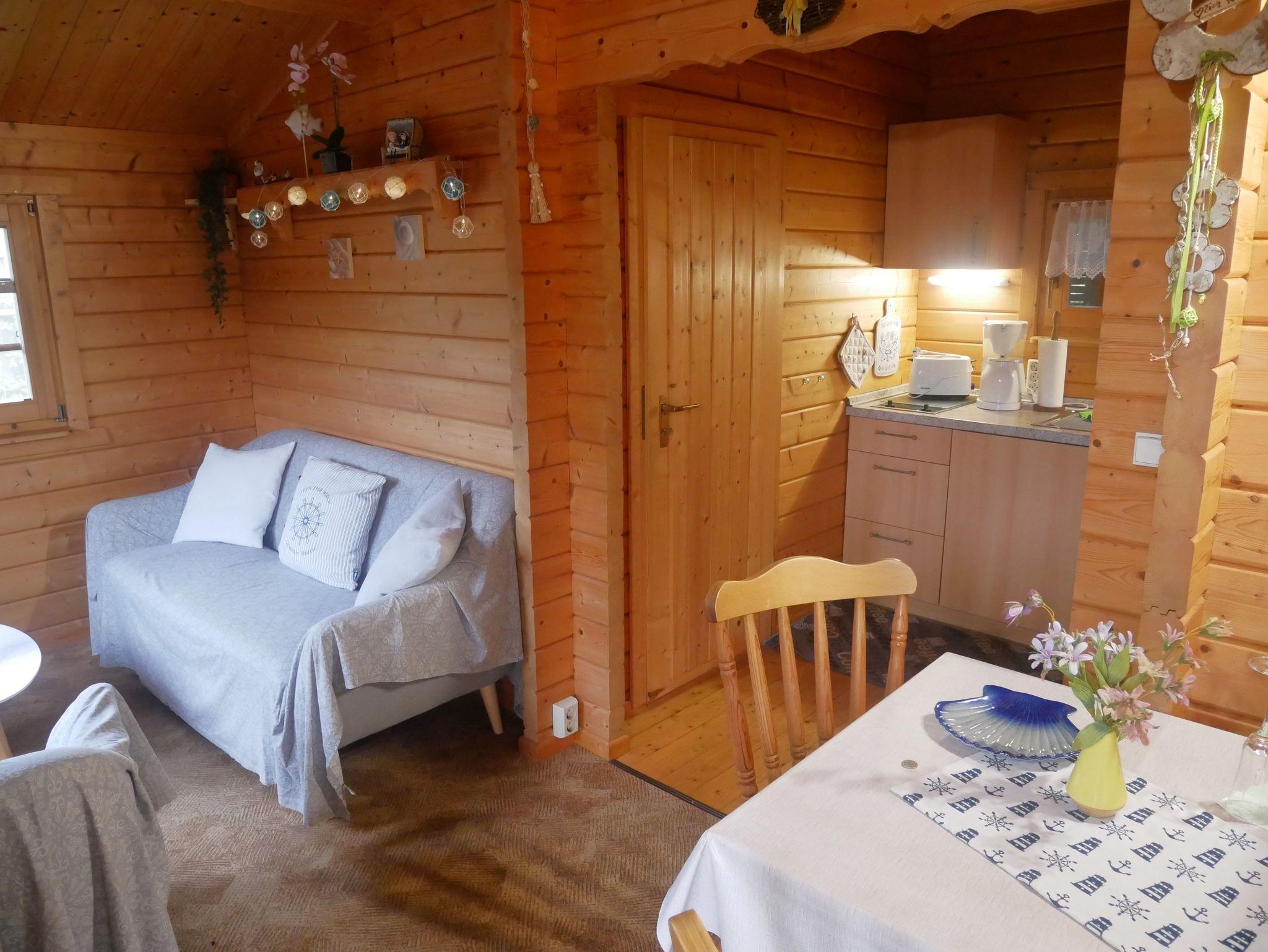 Der gemütliche 24qm große 2-Raum-Bungalow verfügt über einen Wohn-Essbereich mit gemütlicher Couch, Flachbild-TV, Radio, Esstisch und einer offenen Pantry-Küche mit 2-Platten-Cerankochfeld, Spüle, Kühlschrank, Kaffeemaschine, Wasserkocher, Eierkocher und Toaster.