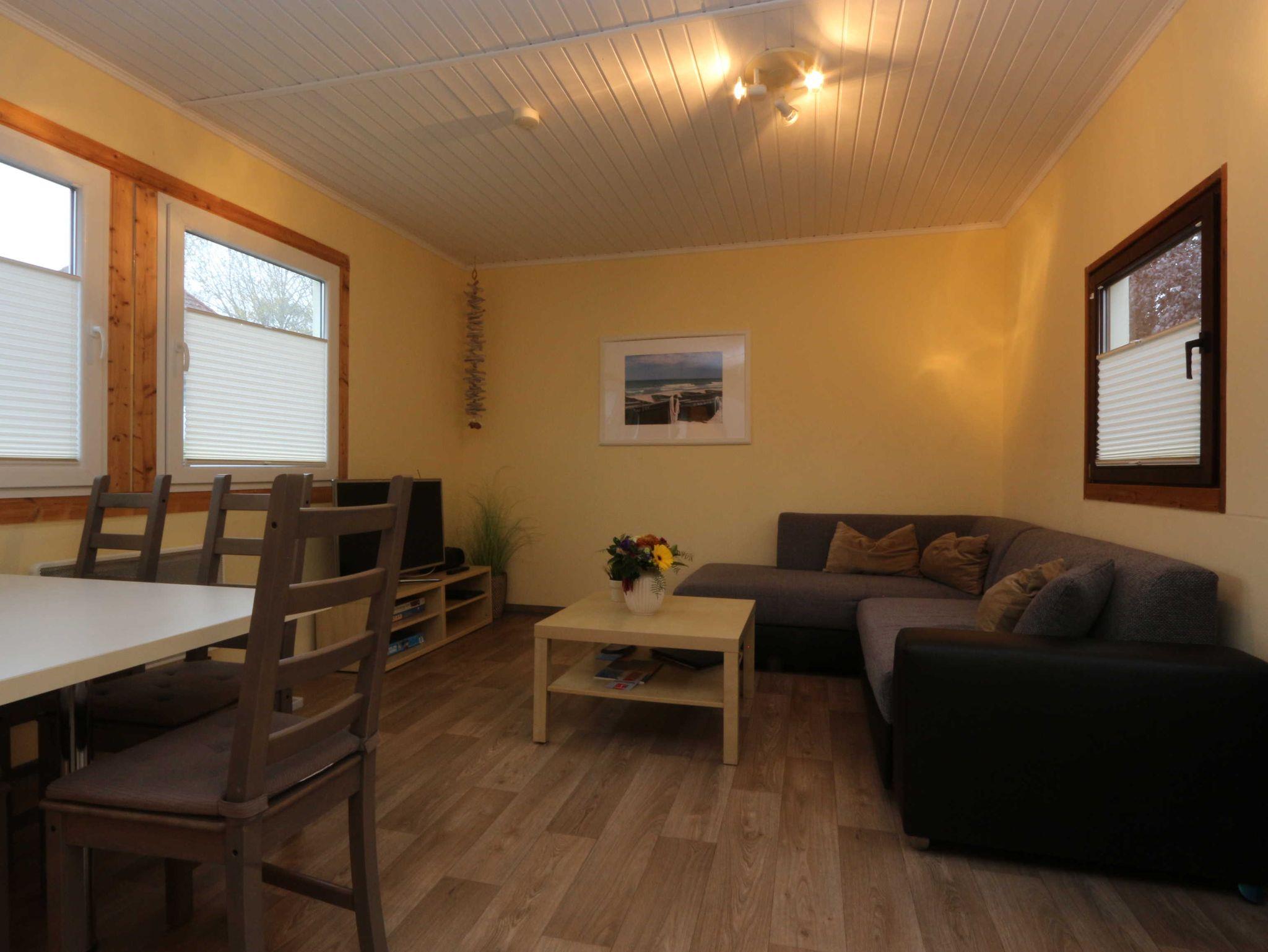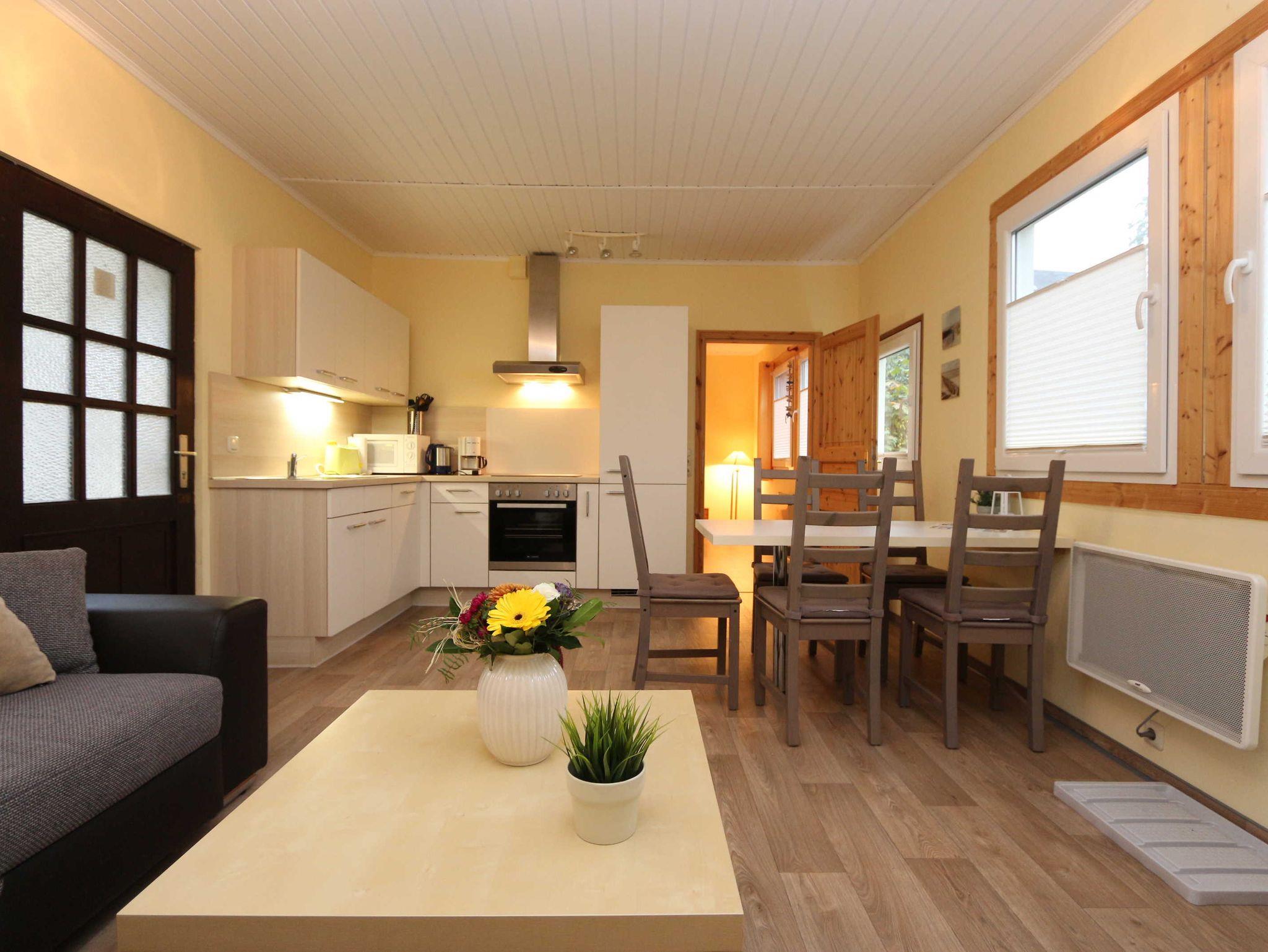 Ferienbungalow (Nr. 4) im Erdgeschoss ist für 2 bis 6 Personen inkl. 1 Kleinkind bis 3 Jahre ausgestattet. Der Bungalow hat cirka eine Größe von 60 qm. Der Eingang zum Bungalow führt direkt von der Terrasse in den kombinierten Wohn- und Essbereich herein.