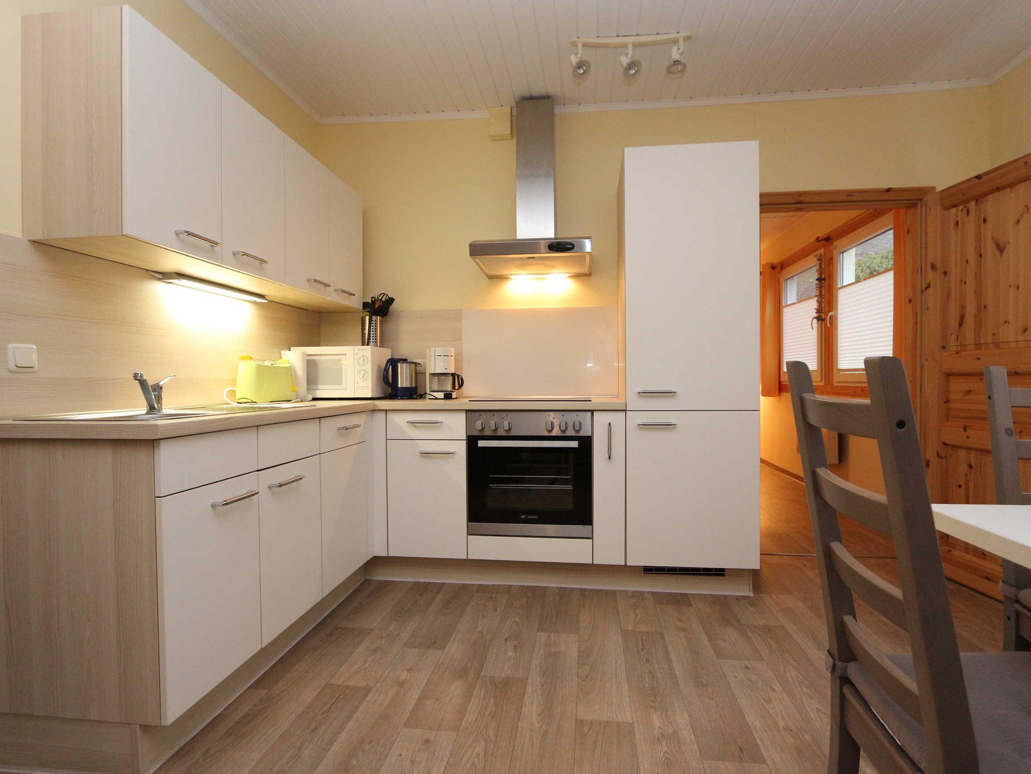 • 1 kombinierten Wohn- und Küchenraum mit Ecksofa, Couchtisch, Flachbildfernseher; Einbauküche mit Kühlschrank und kleinem Gefrierfach, Spülmaschine, Spüle, Backofen, Glaskeramikkochfeld, Mikrowelle, Kaffeemaschine, Toaster, Wasserkocher, Essplatz für 5 Personen;