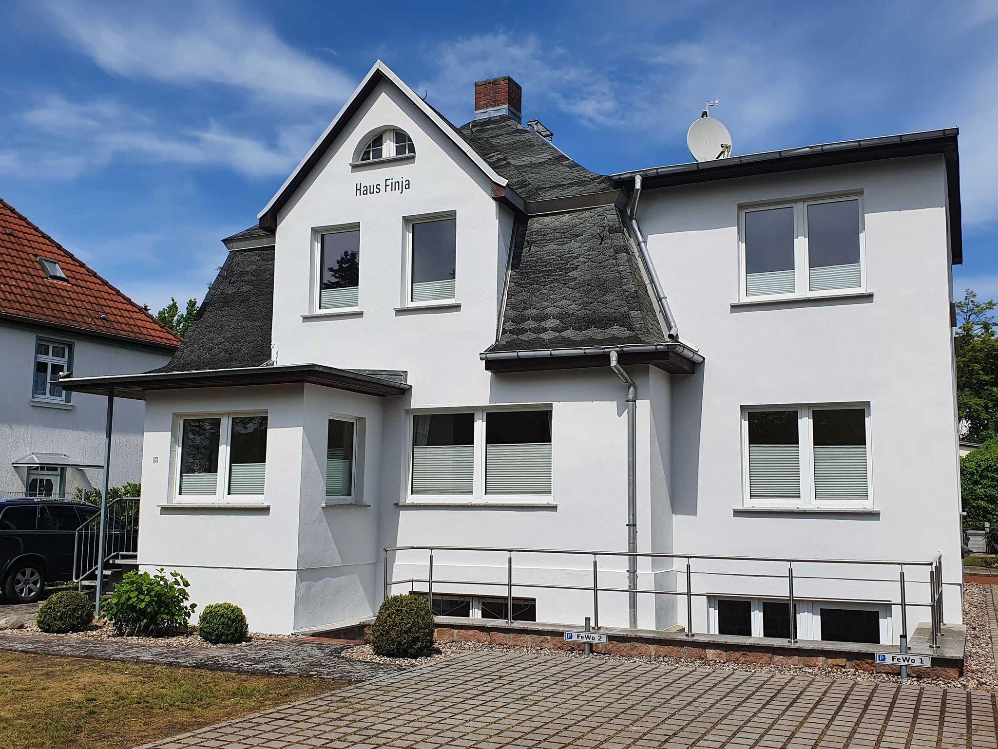 Das Ferienhaus Finja im stil einer Villa verfügt über die Ferienwohnungen 1 und 2 sowie im hinteren Bereich des Grundstücks über einen separaten Bungalow (Vermietung nur im Sommer), hier befindet sich die Ferienwohnung 4.