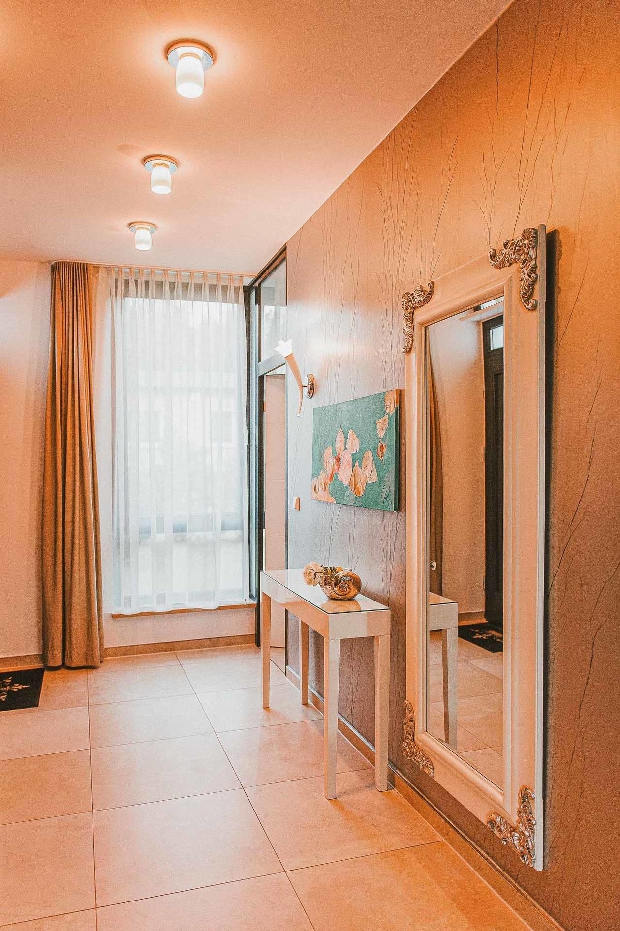 Das Wohnambiente bestimmen ausgewählte Tapeten mit zum Teil exotischen, barocken und floralen Motiven im Kontrast zu unifarbenen silber- und cremefarbenen Tönen, die durch ihre dreidimensionale Strukturierung beleben.