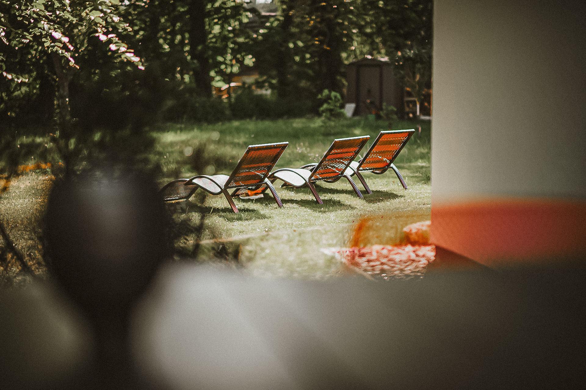 Die Sonne wandert in diesem Haus mit. Beginnen Sie Ihren Tag mit einem ausgedehnten Frühstück auf der an die Küche angrenzenden Sonnenterrasse neben einer stattlichen Buche mit Blick in den nahen Wald. Die farbigen Loungestühle der Terrasse vermitteln einen aufmunternden belebenden Eindruck. Auf der Hauptterrasse, die auf das Grundstück ausgerichtet ist, verfolgt Sie die Sonne bis in die späteren Nachmittagsstunden. Die etwas gediegenerenTerrassenmöbel laden mit angenehm höheren Polsterauflagen zum Verweilen ein. Hier steht ein großzügiger Grillofen bereit, an dem Sie sich zu fortgeschrittener Stunde auch erwärmen können.