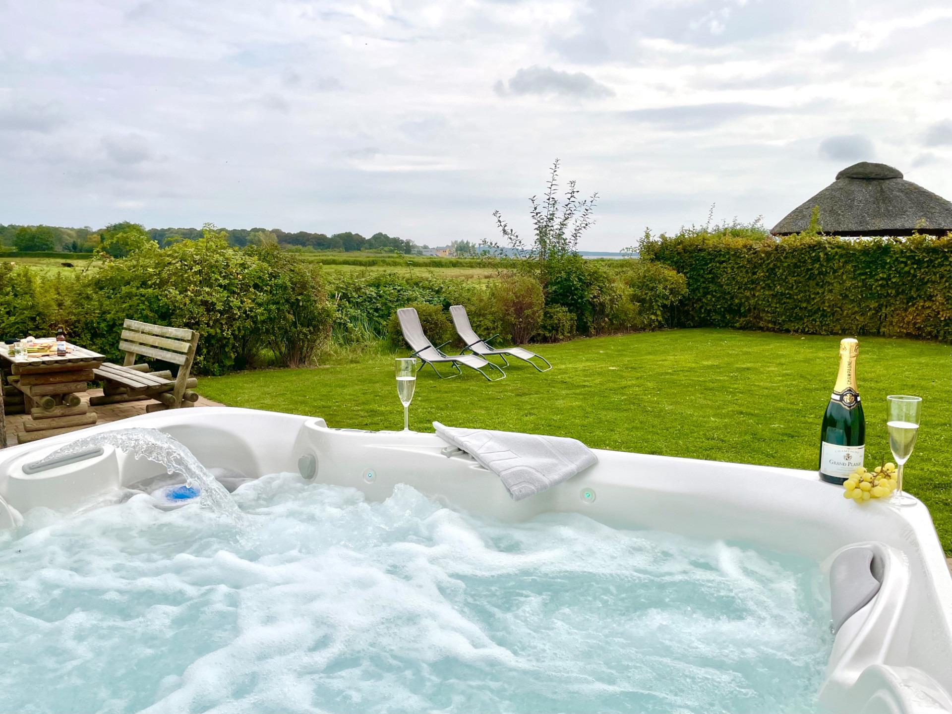 Die luxuriös ausgestattete Einbauküche lässt im Urlaub das gemeinsame Kochen zum Vergnügen werden. Das Wellnessbad mit Dusche und Sauna und ein weiteres Duschbad lassen den Tag schon entspannt beginnen. Das Highlight ist unser Außen-Whirlpool mit Blick auf Achterwasser, der ganzjährig (Wasser 36 Grad) genutzt werden kann.