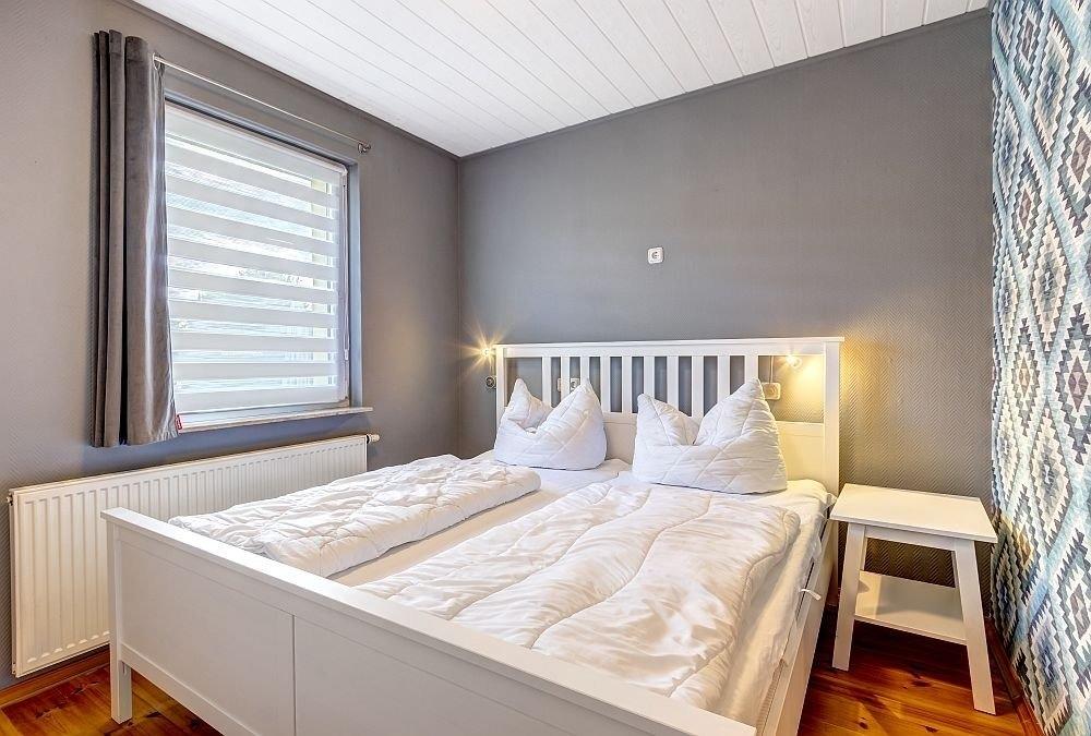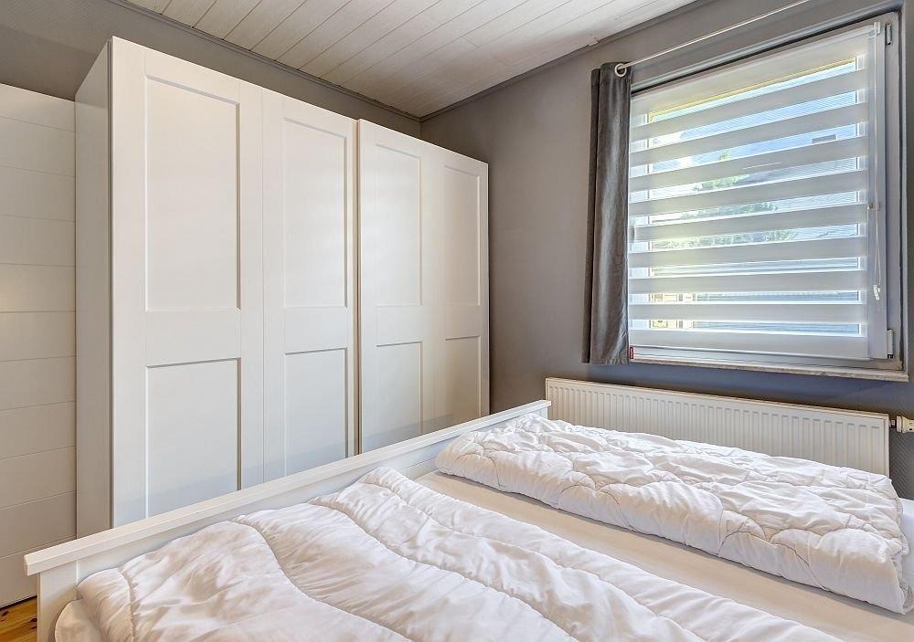 Die mit 80 qm sehr große komfortable Ferienwohnung verfügt über ein helles Wohn- und Esszimmer (mit einem ausziehbaren Hemnes-Bett 200 x 180 cm sowie einer möglichen Aufklapp-Aufbettung 200 x 90 cm), ein großes Schlafzimmer (mit Doppelbett 200 x 180 cm), ein kleines Schlafzimmer (mit Einzelbett 200 x 90 cm), eine zum Wohnzimmer hin offene Küche, ein Bad mit ebenerdiger Dusche und eine Terrasse. Im geräumigen Wohn-/Essbereich sind ausreichend Sitzgelegenheiten vorhanden, um das in der voll ausgestatteten Küchenzeile (Backofen, Spülmaschine, Spüle, Kaffeemaschine) zubereitete Essen zu sich zu nehmen.