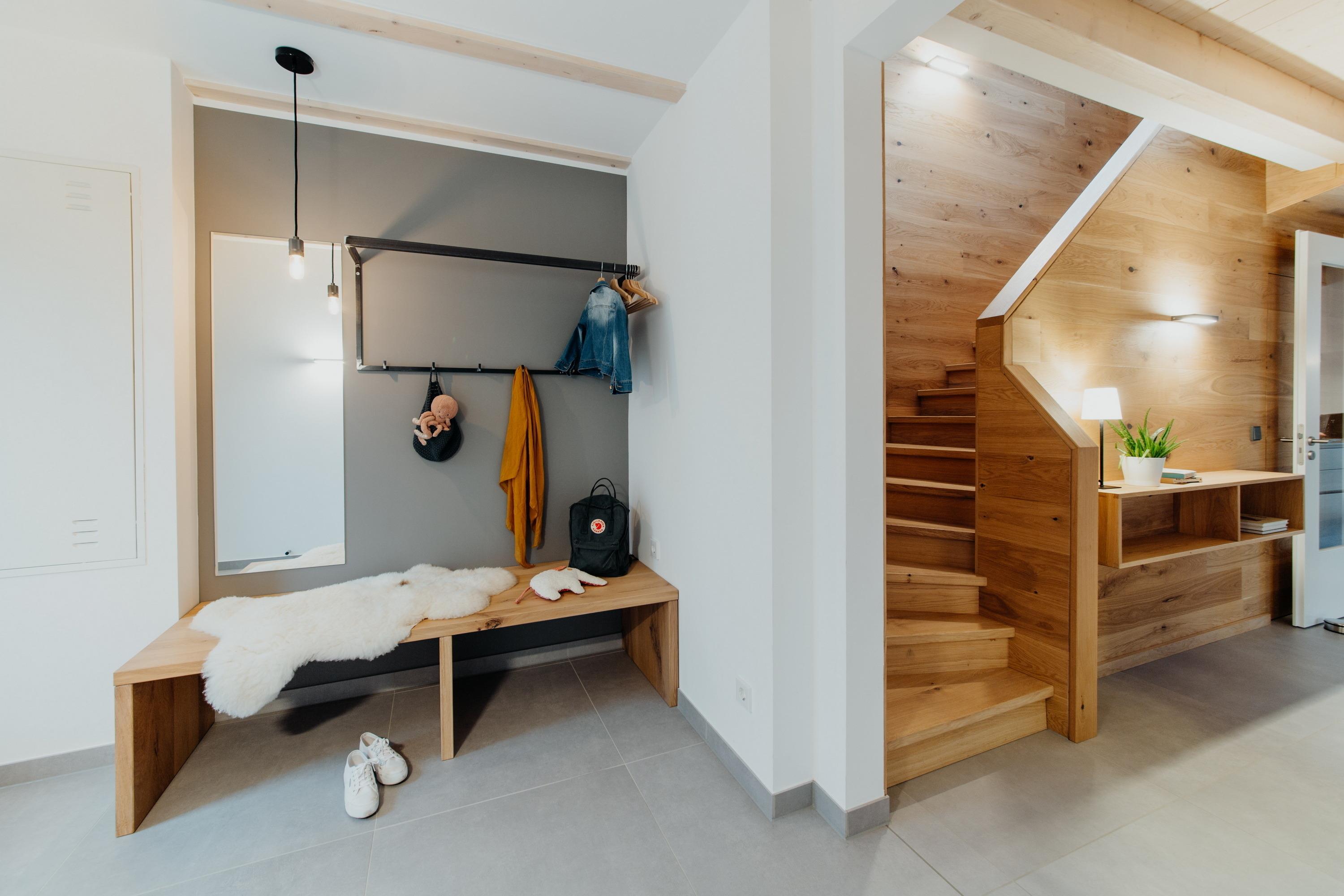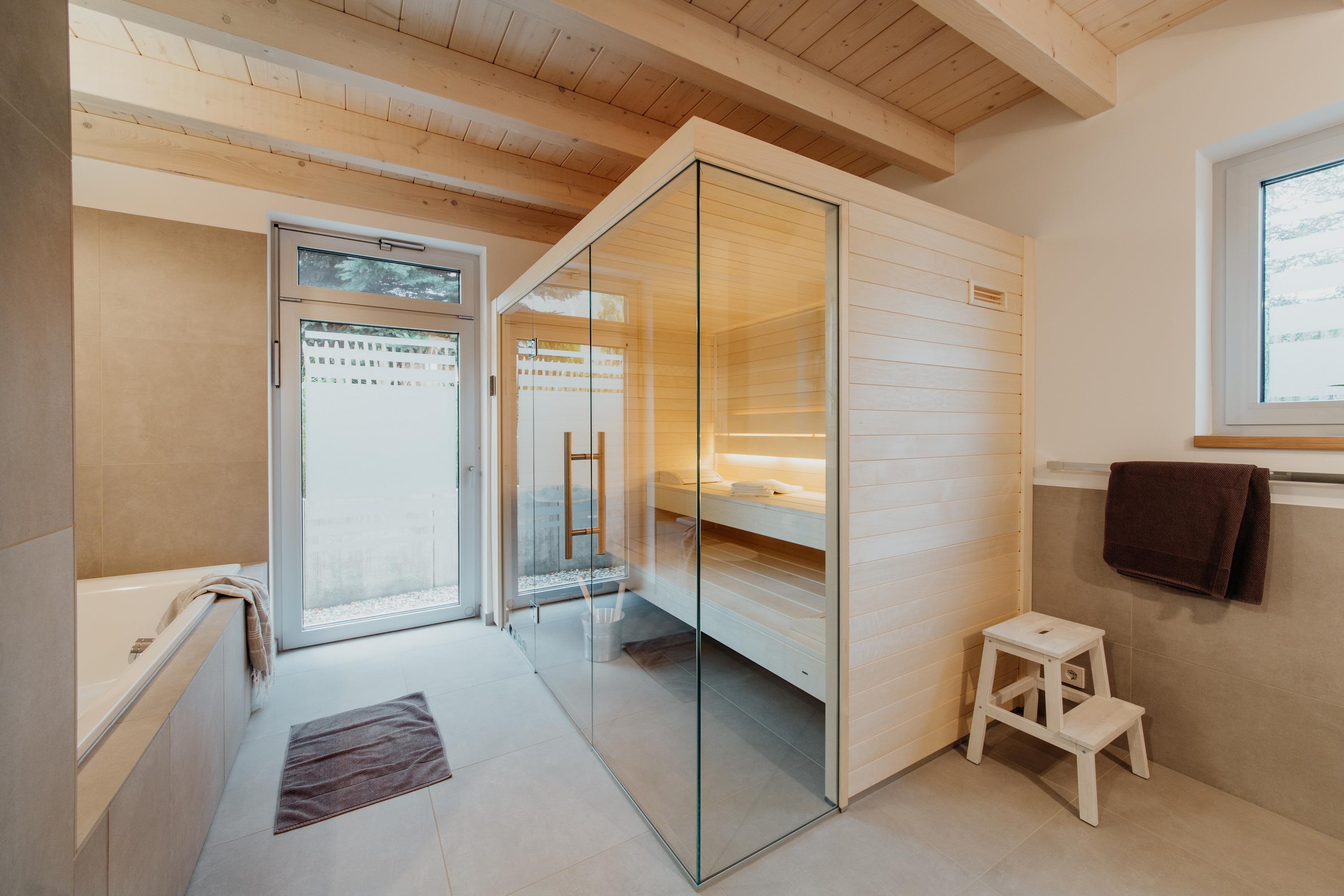 Im Erdgeschoss befinden sich die Küche, der Essbereich, das Wohnzimmer sowie das Wellnessbad mit Sauna, Wellnessbadewanne mit Skin Touch und Dusche. Vom Essbereich gelangen Sie direkt auf die überdachte Terrasse und in den dazugehörigen Garten.