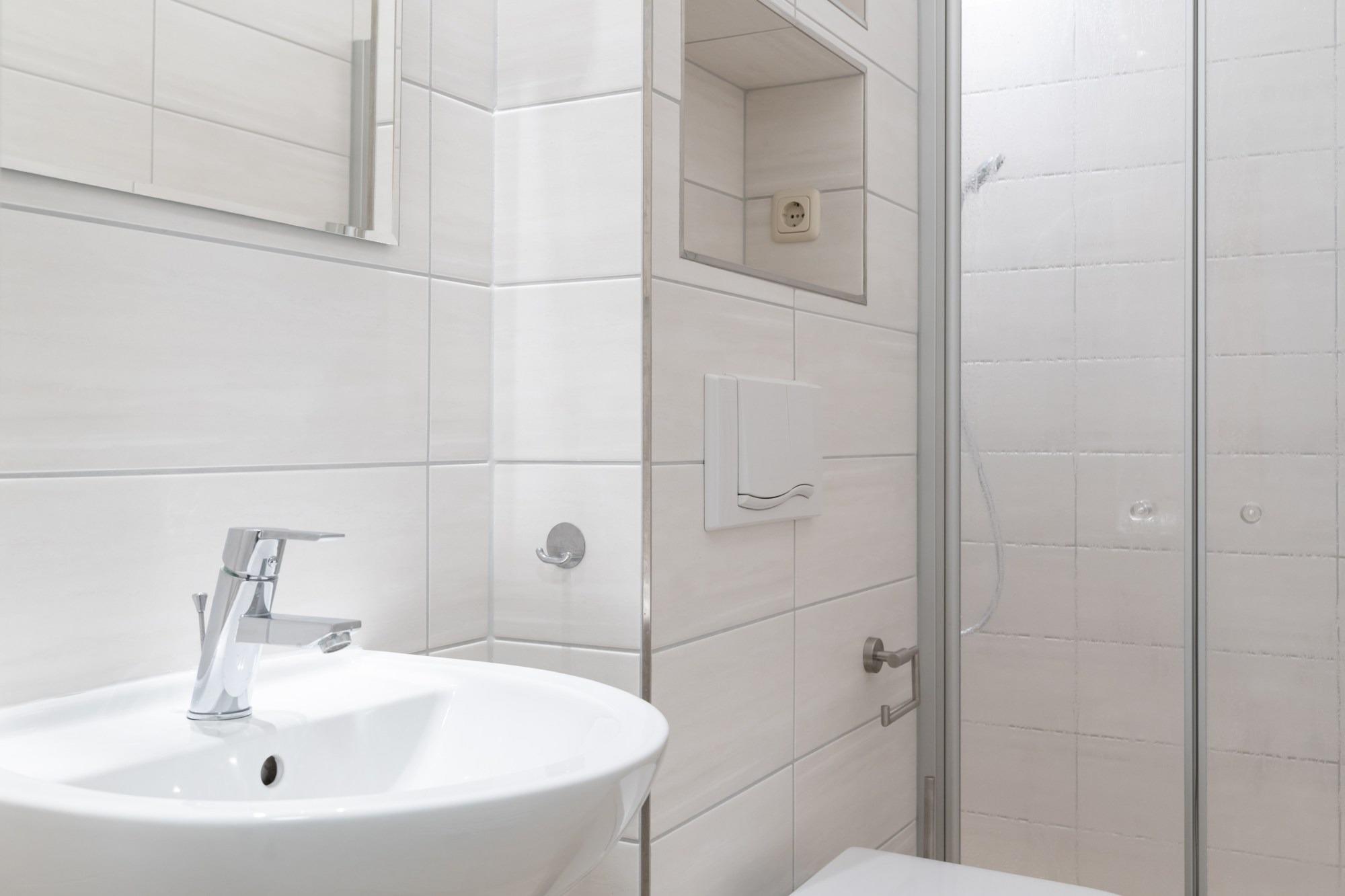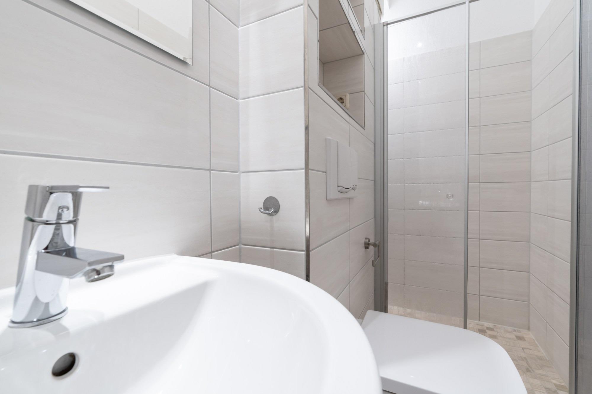 Das Badezimmer verfügt über eine Dusche (ebenerdig) und WC.