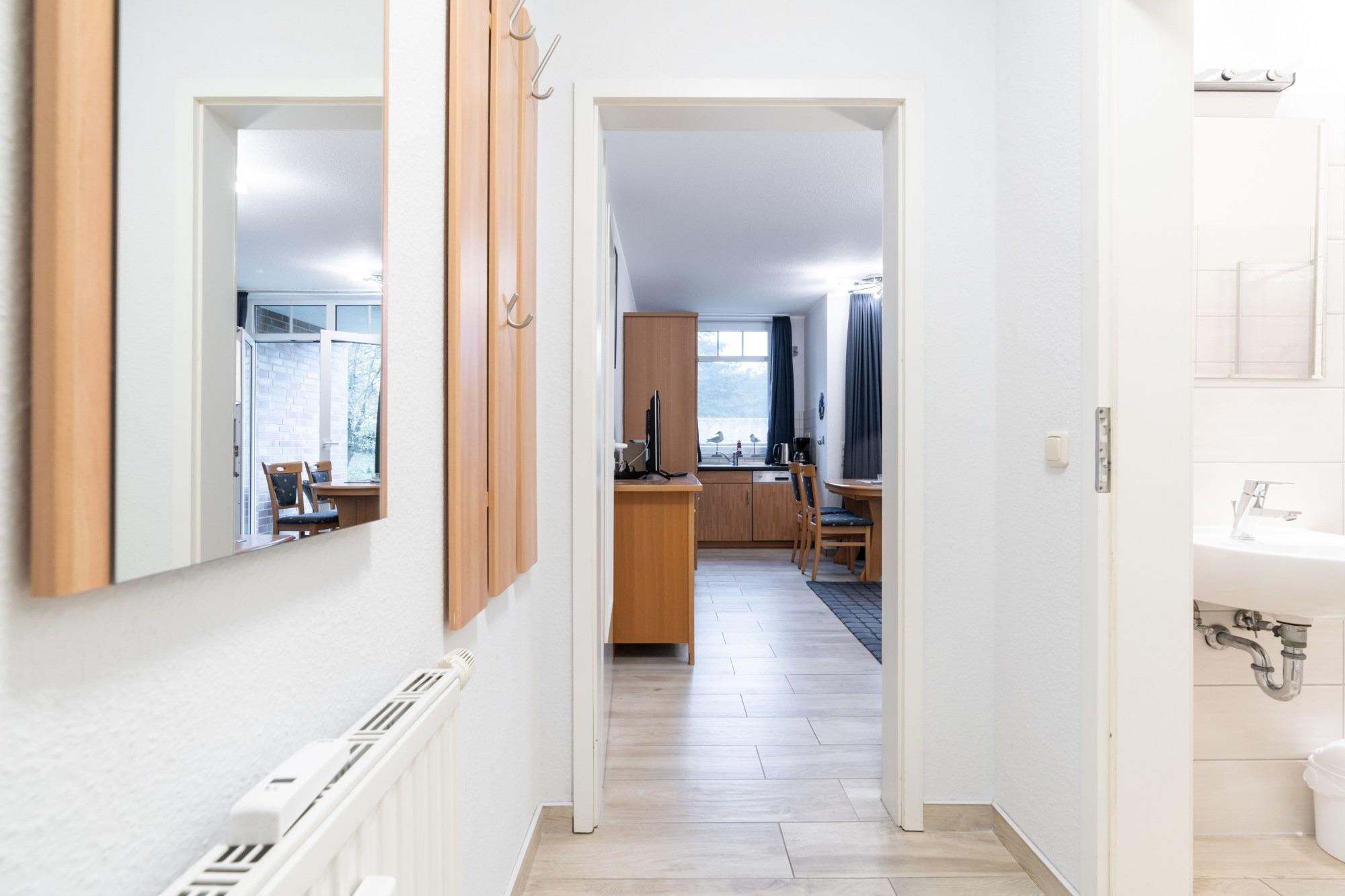 Die 36 m ² große Ferienwohnung 02 befindet sich im Erdgeschoss im Haus Roland (rechtes Gebäude vom Parkplatz aus gesehen). Sie bietet mit ihren zwei Zimmern ausreichend Platz für bis zu 3 Personen.