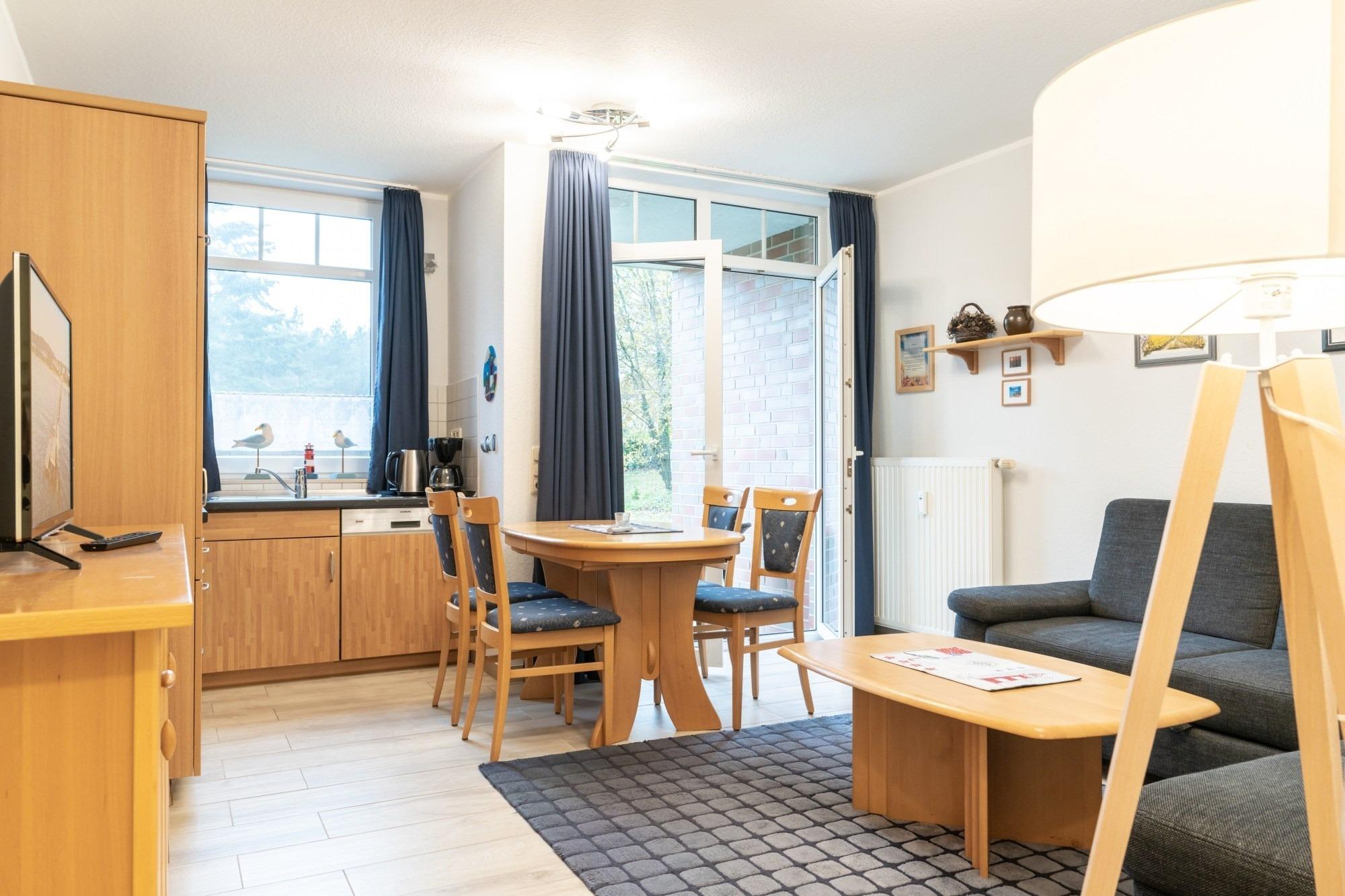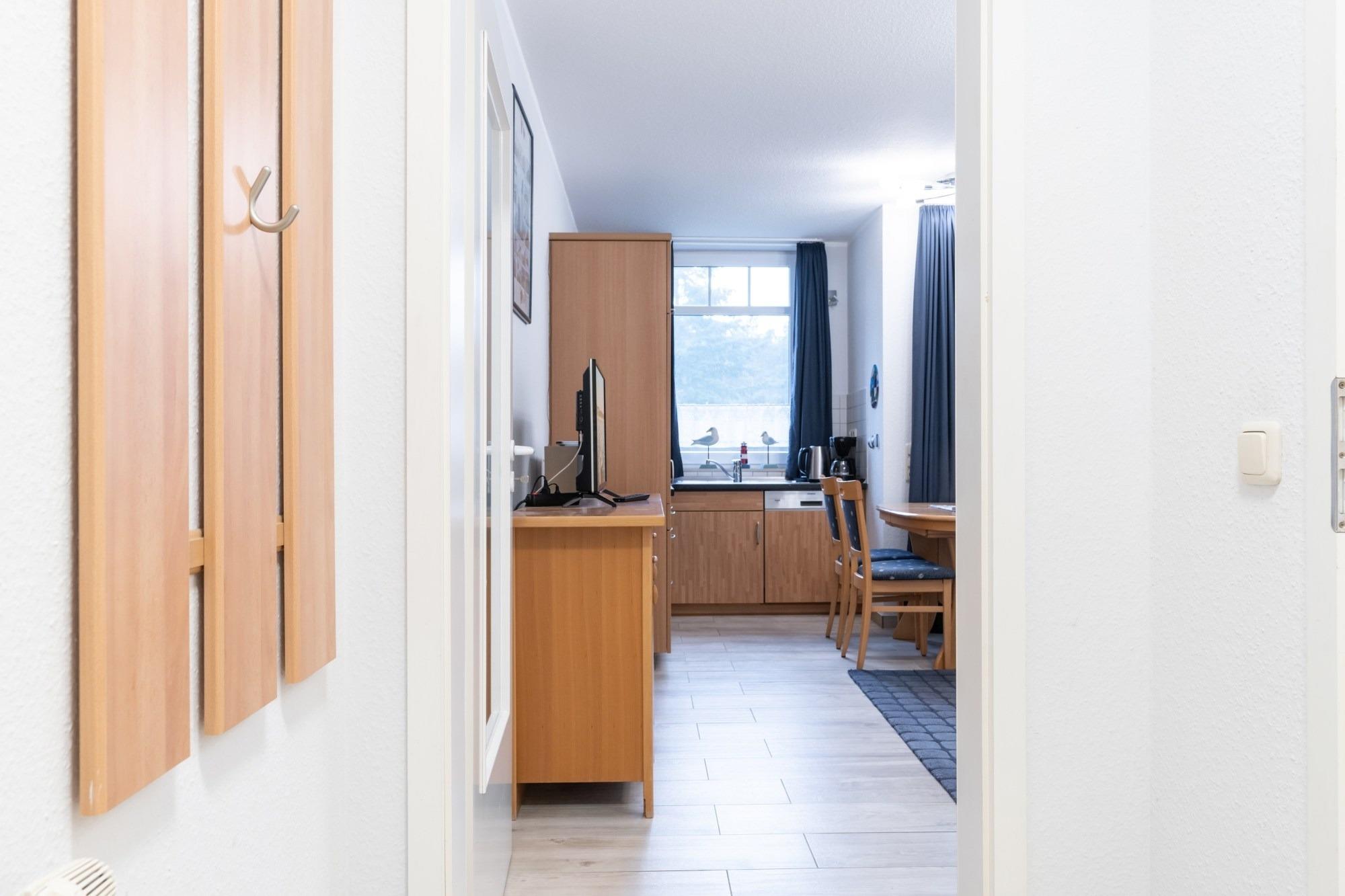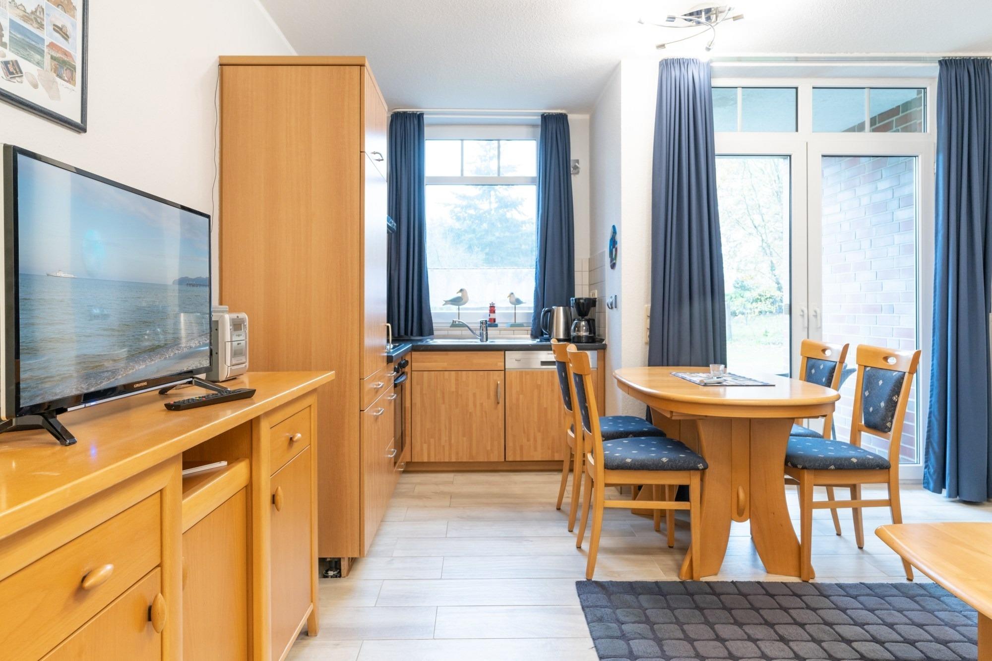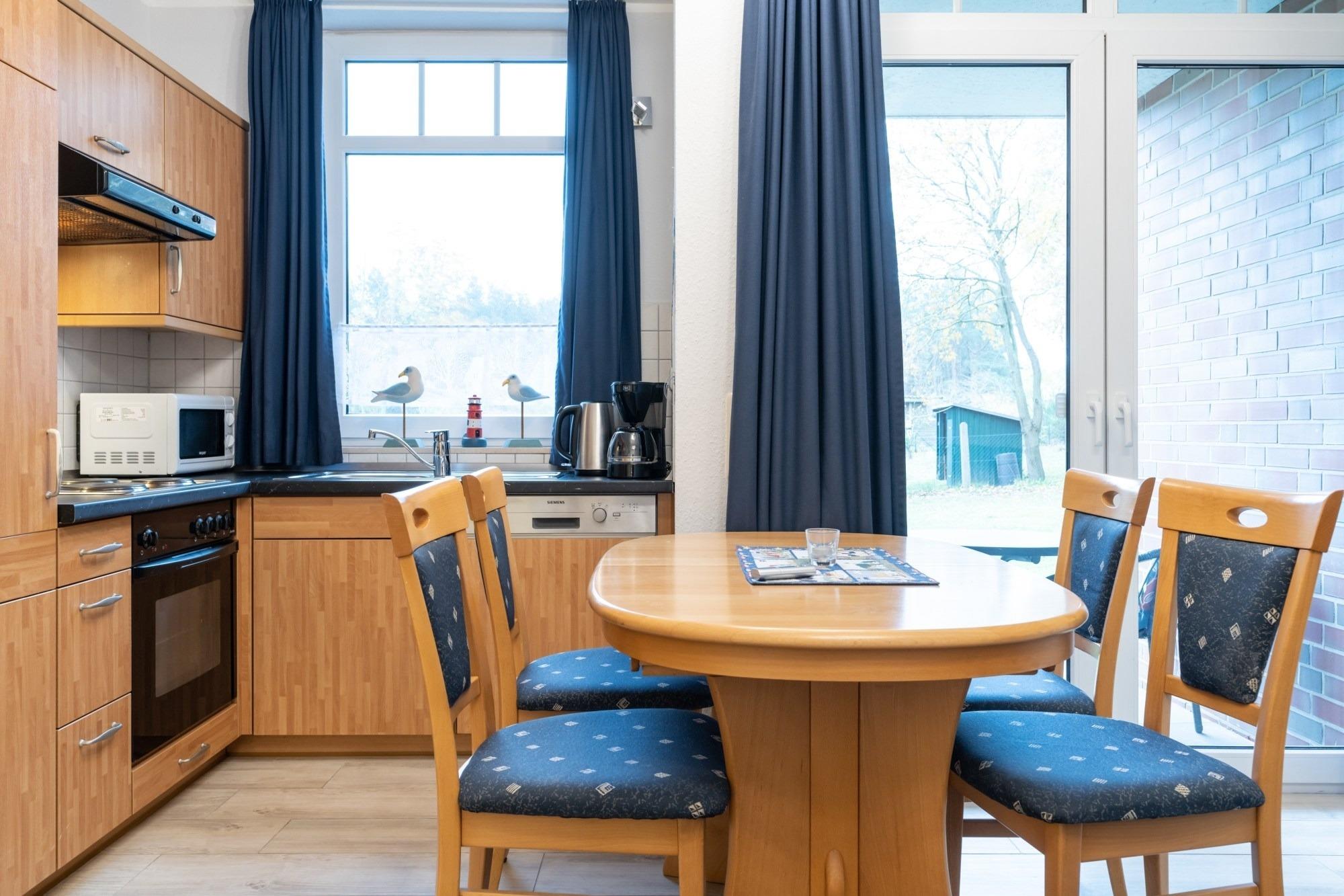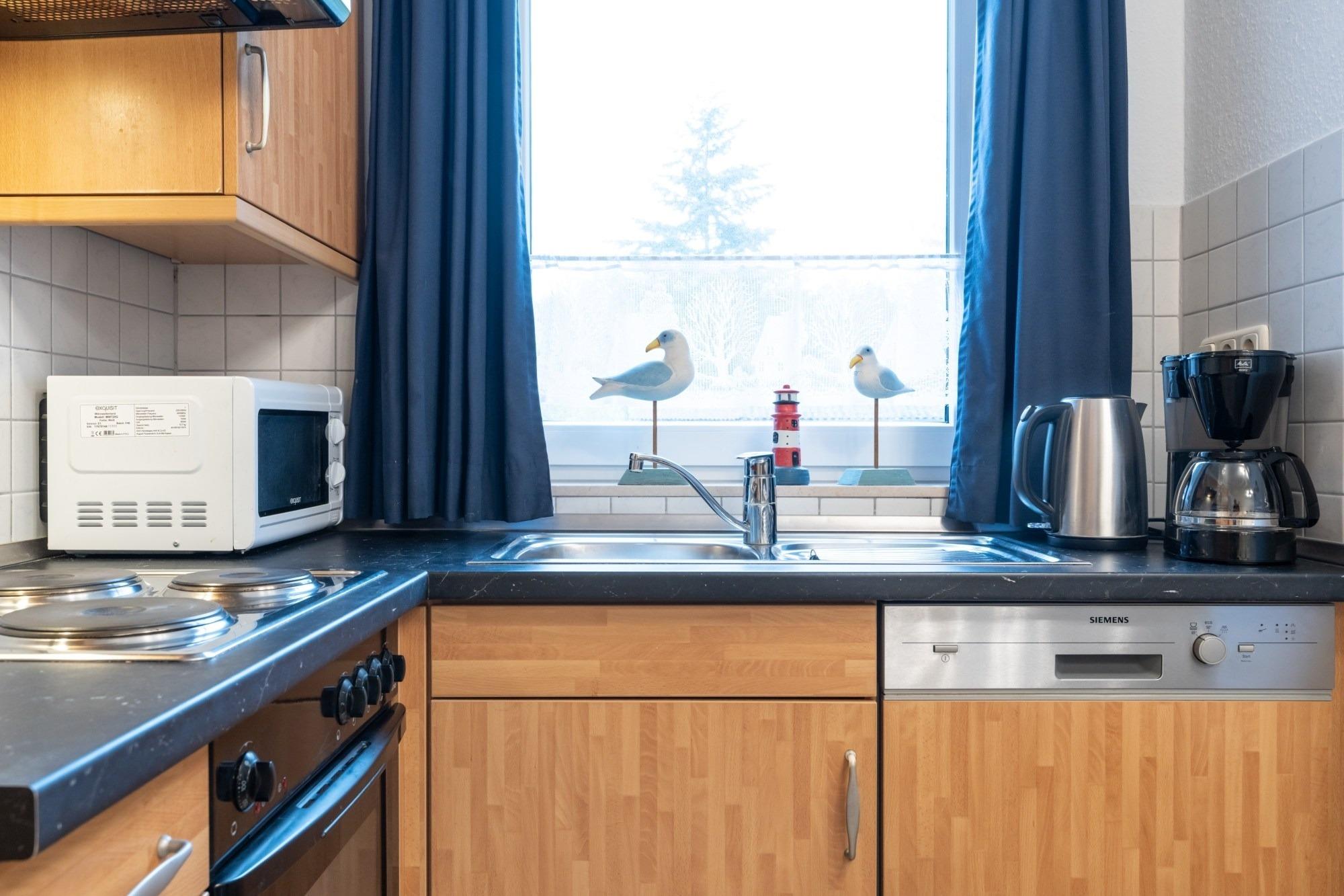 Die hier angrenzende Küchenzeile ist mit einem Kühlschrank mit Gefrierfach, einem Geschirrspüler und einem Backofen mit Cerankochfeld ausgestattet. Eine Kaffeemaschine, ein Toaster und ein Wasserkocher stehen Ihnen hier selbstverständlich zur Verfügung.