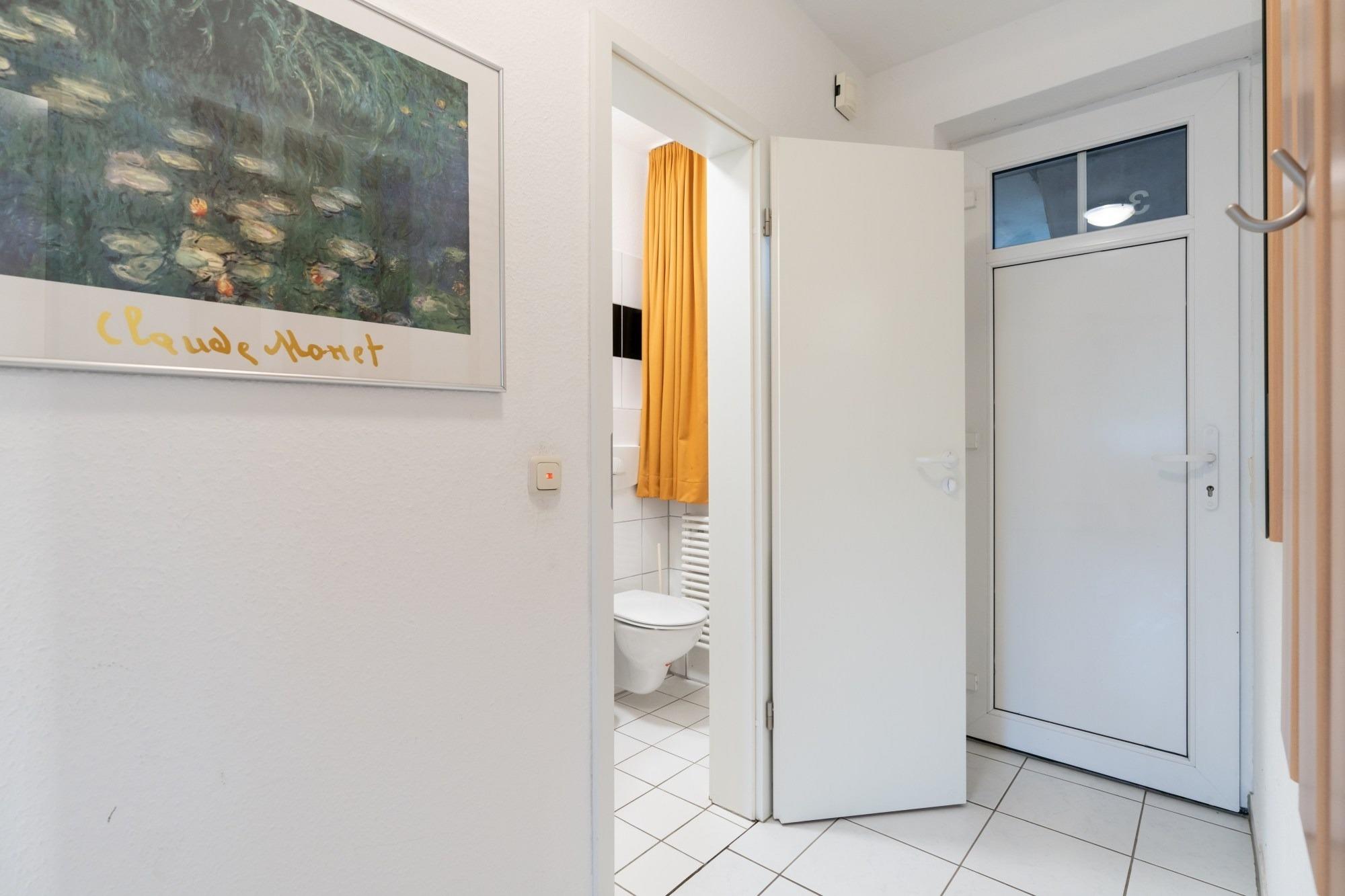 Die hier angrenzende Küchenzeile ist mit einem Kühlschrank mit Gefrierfach, einem Geschirrspüler und einem Backofen mit Cerankochfeld ausgestattet. Eine Kaffeemaschine, ein Toaster und ein Wasserkocher stehen Ihnen hier selbstverständlich zur Verfügung.