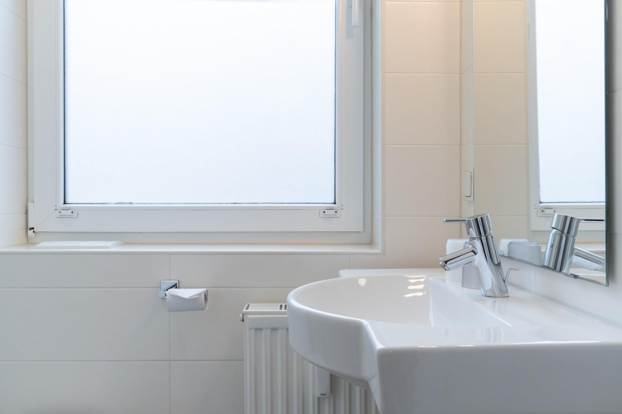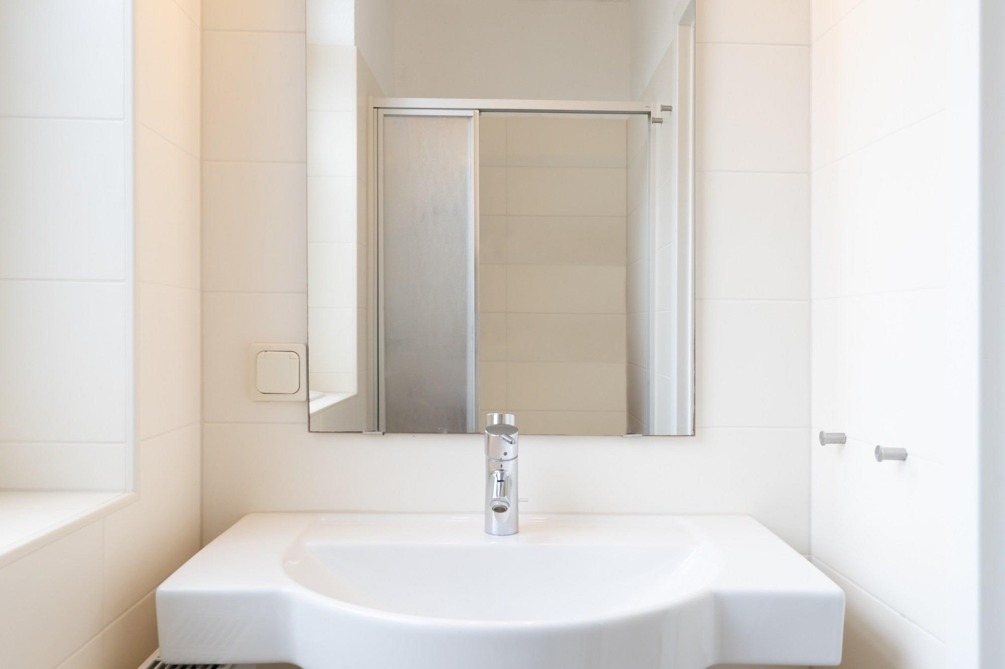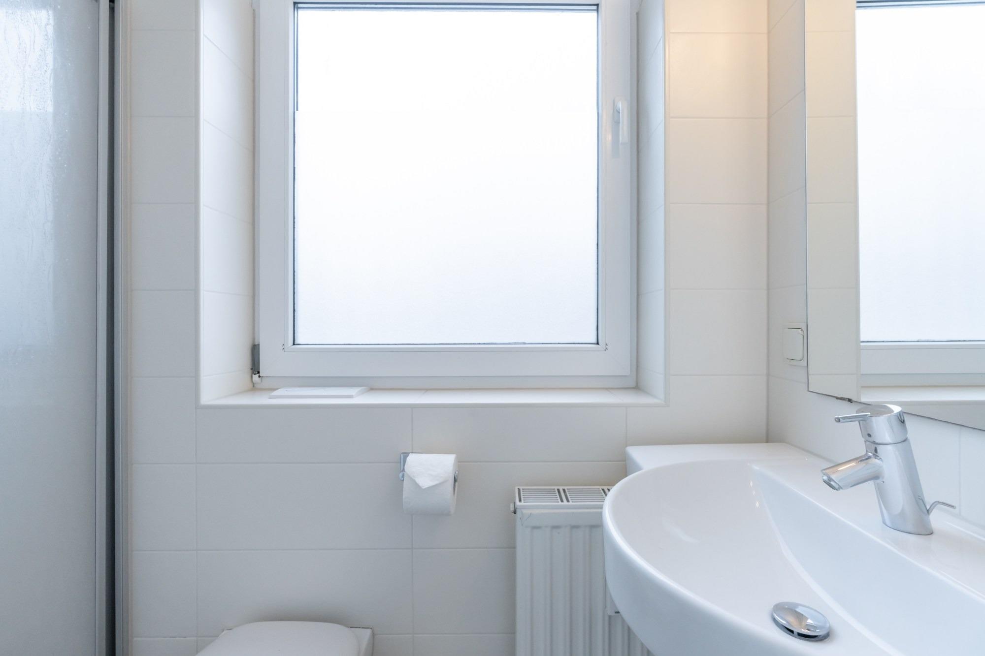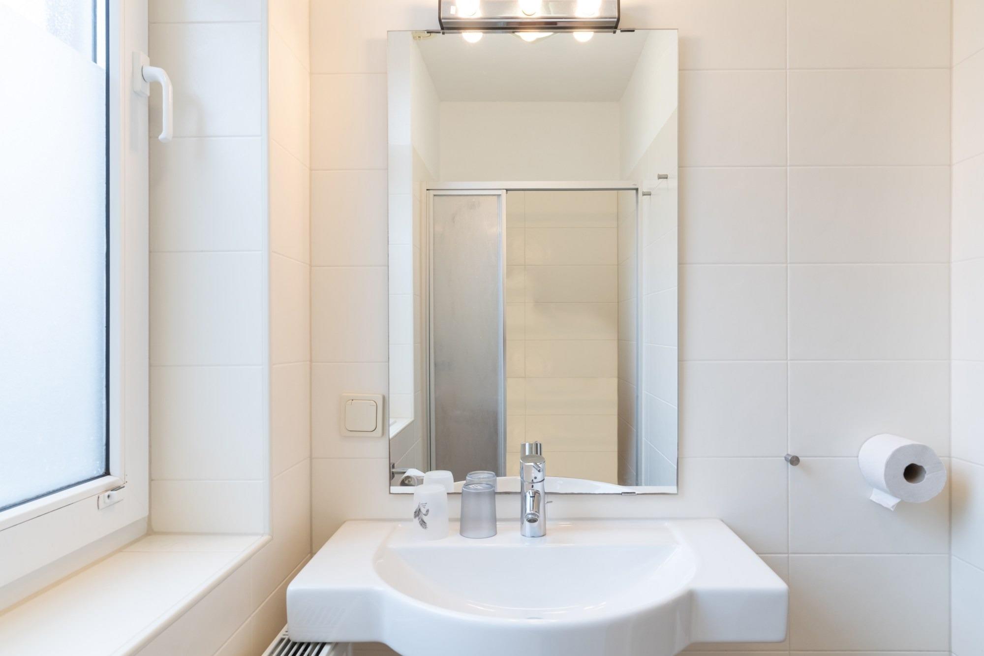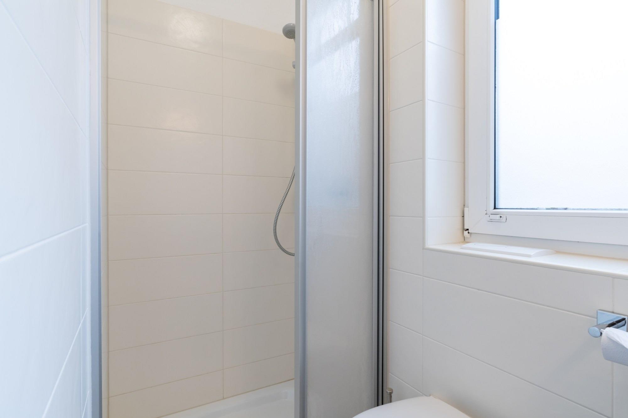 Das Badezimmer verfügt über eine Dusche und WC.