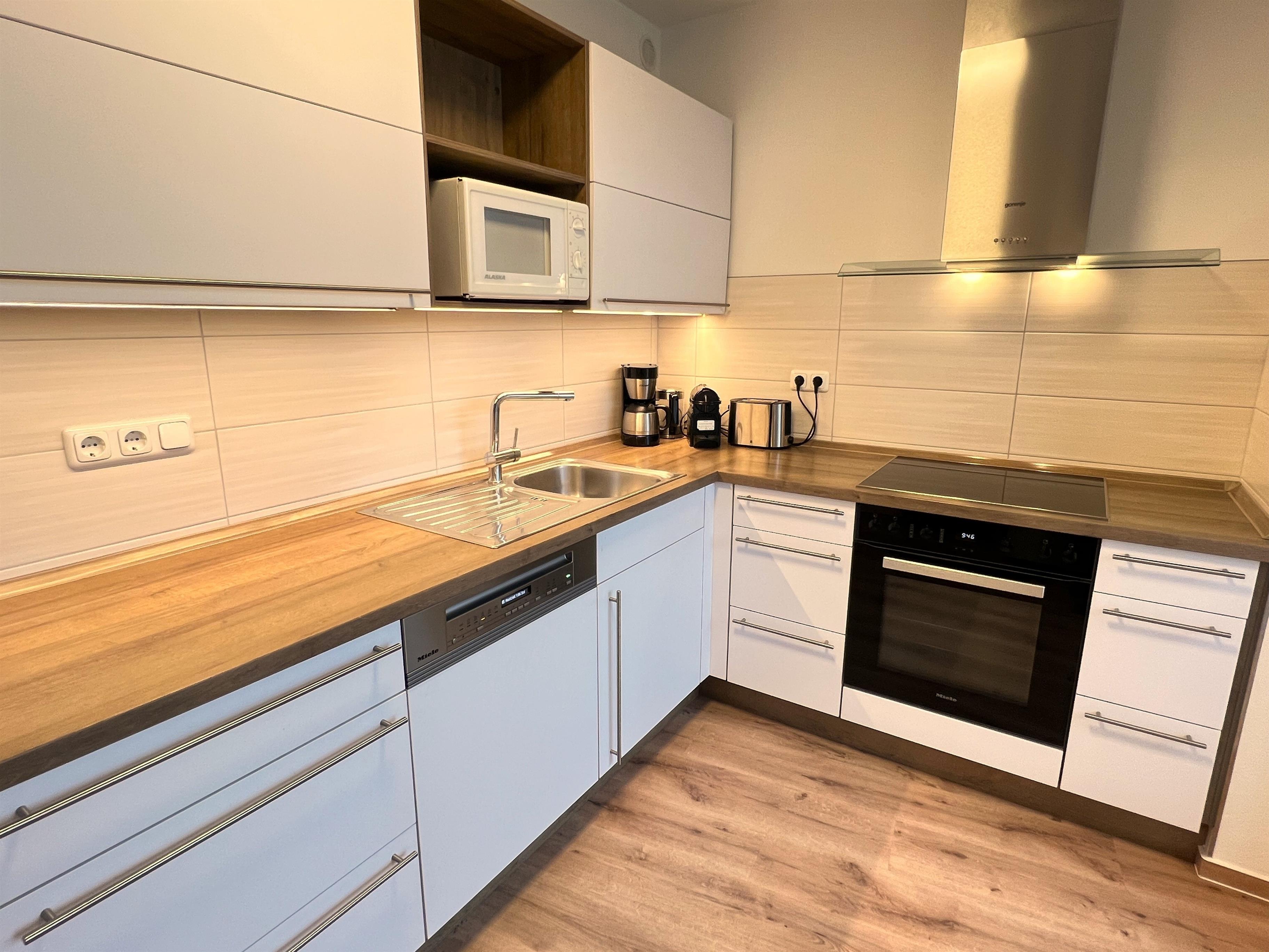 Separate Küche mit modernen Miele-Einbaugeräten: Induktionskochfeld, Backofen, Geschirrspüler und großer Kühlschrank mit drei Tiefkühlfächern.