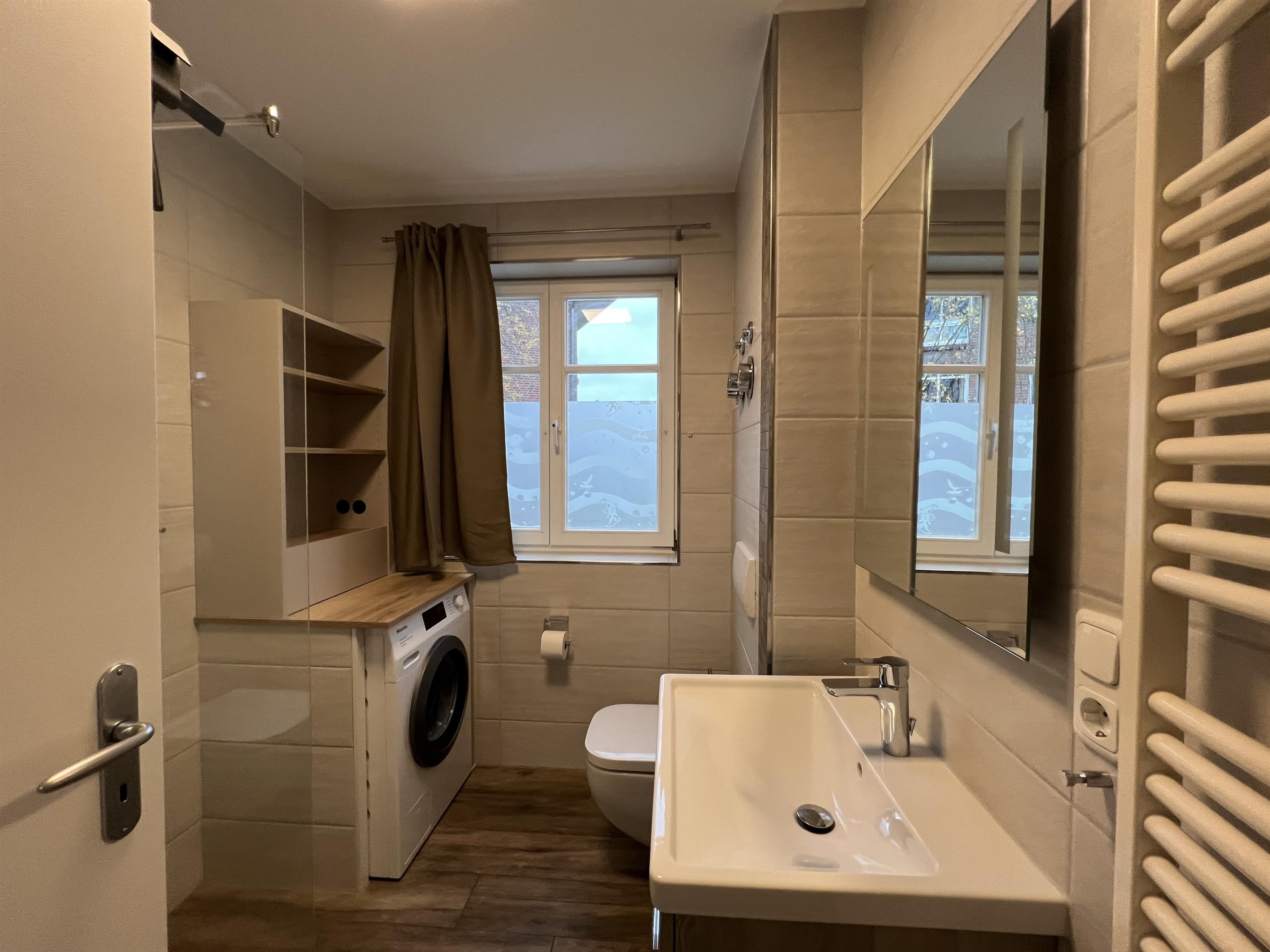 Miele-Waschmaschine vorhanden; passender Trockner im Einbauschrank im Schlafzimmer.