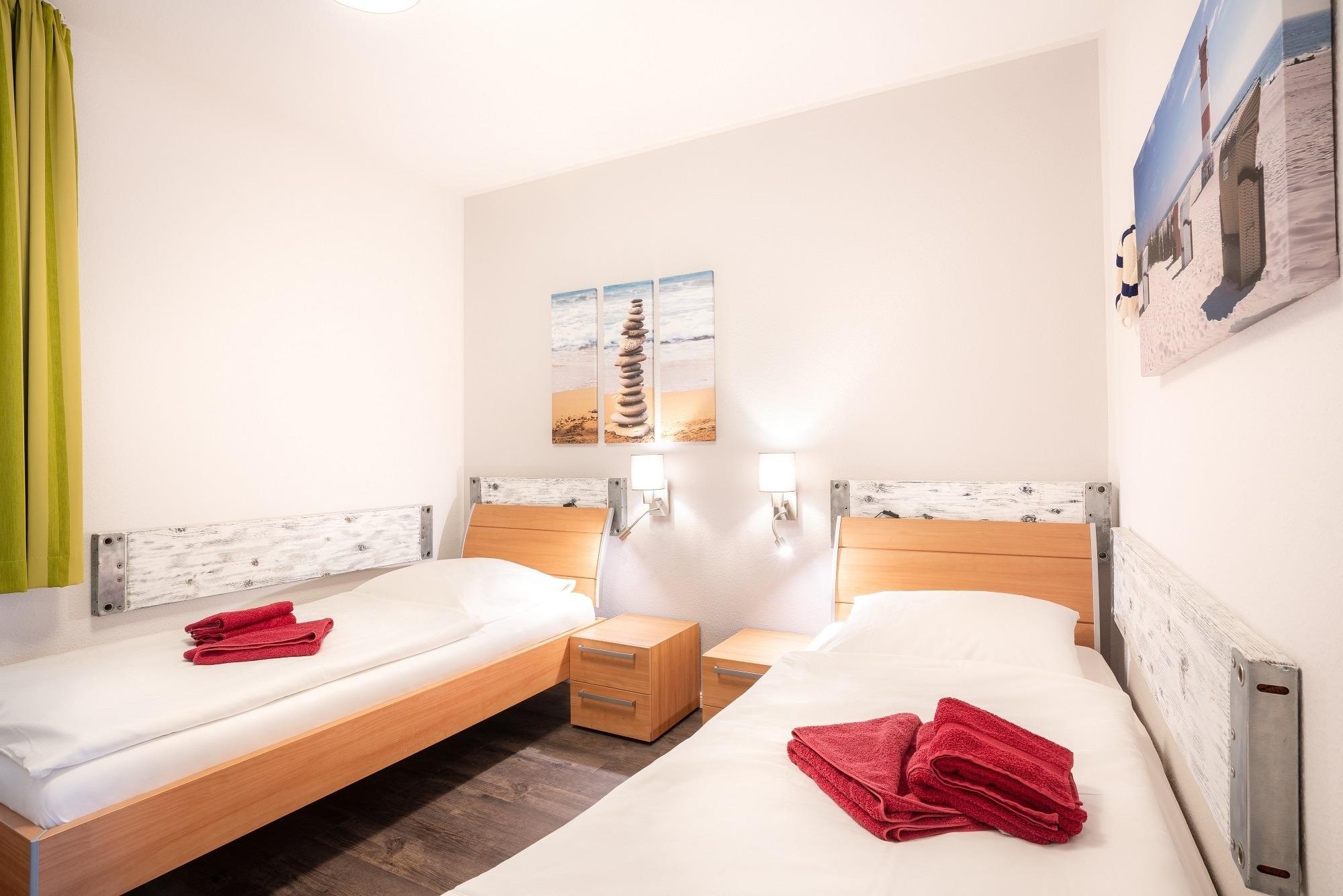 Das zweite Schlafzimmer ist mit zwei Einzelbetten ausgestattet und verfügt über eine Stereoanlage und einen Flachbildfernseher.
