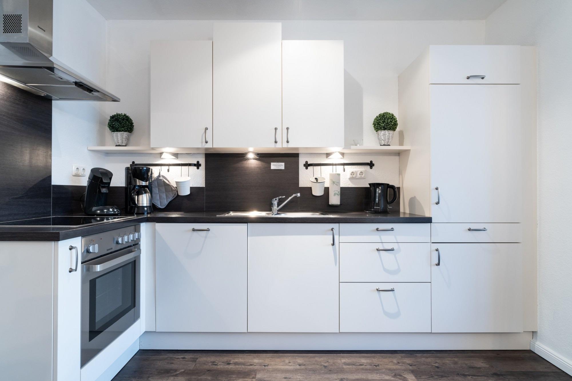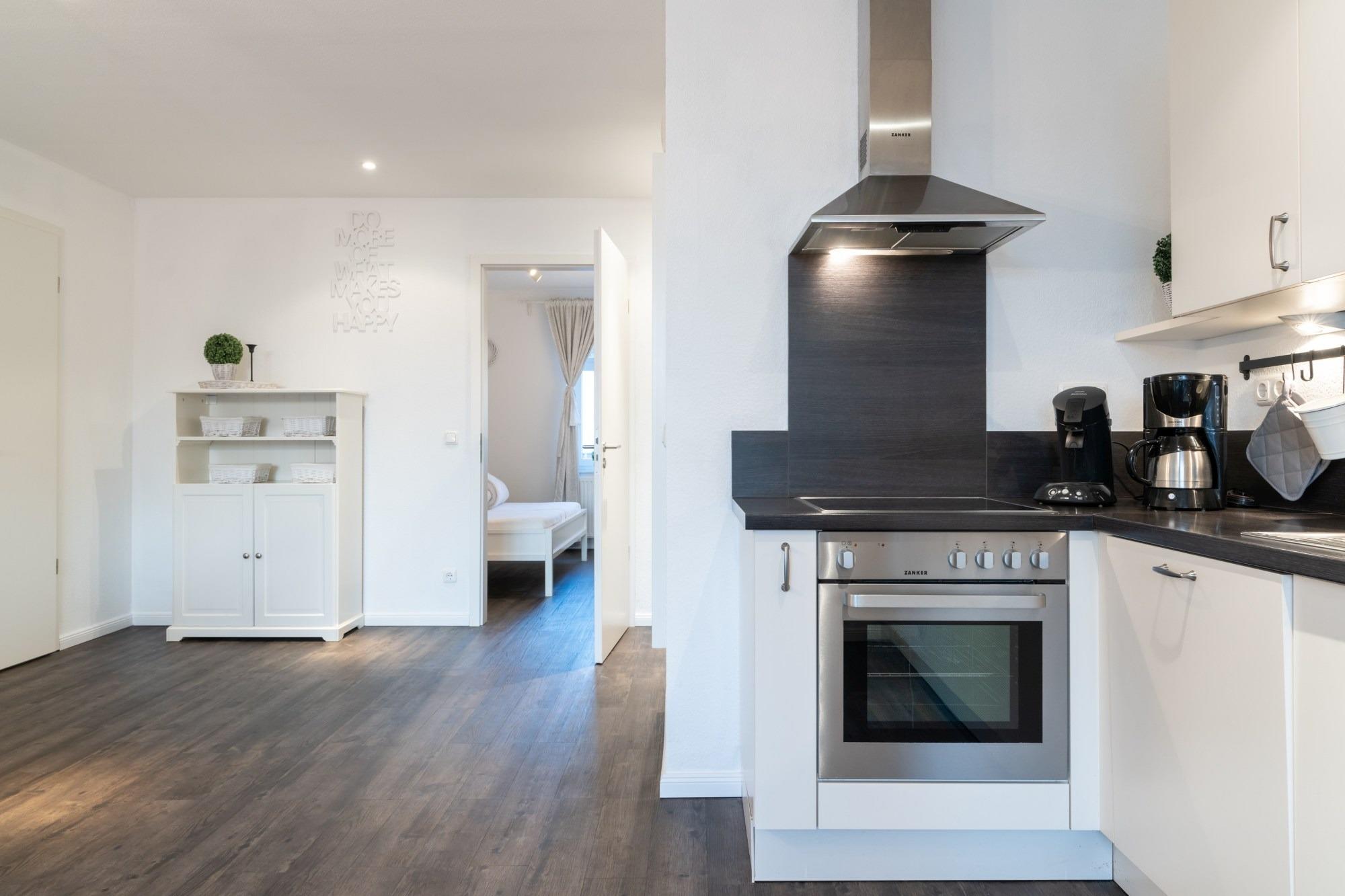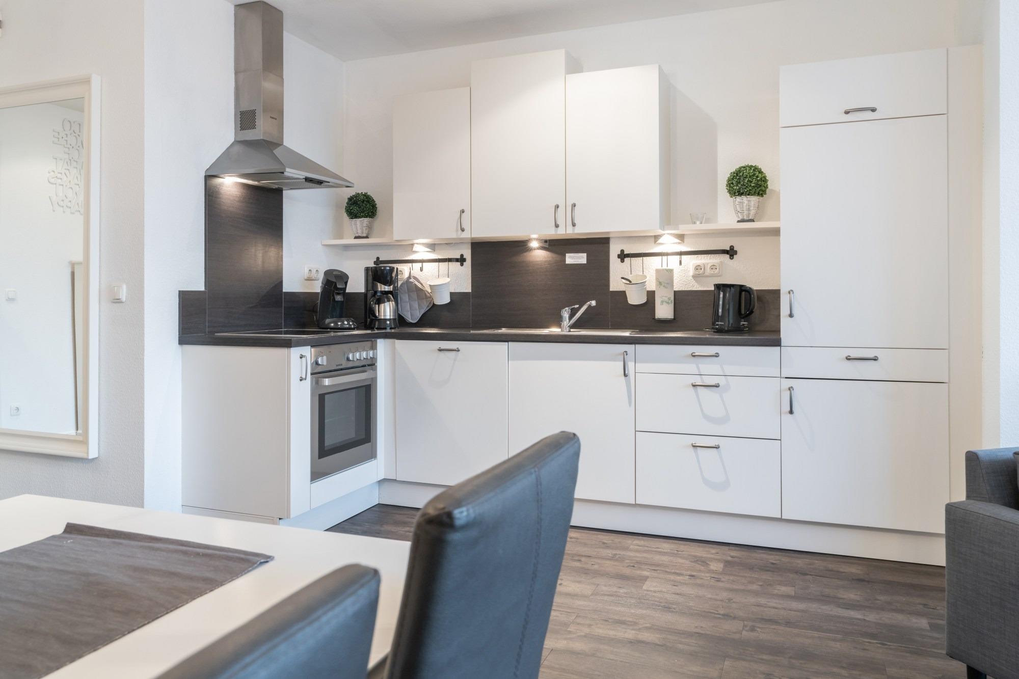 Die hier angrenzende Küchenzeile ist mit einem Kühlschrank mit Gefrierfach, einem Geschirrspüler und einem Backofen mit Cerankochfeld ausgestattet. Eine Kaffeemaschine, ein Toaster und ein Wasserkocher stehen Ihnen hier selbstverständlich zur Verfügung.
