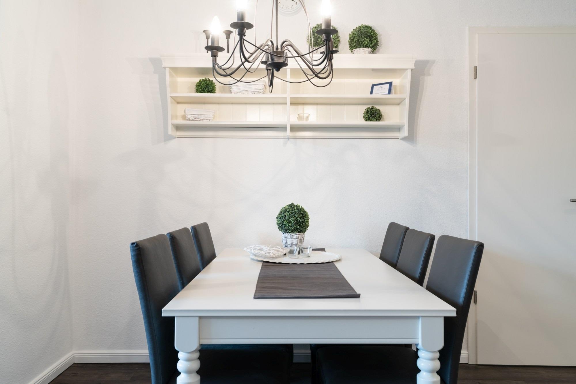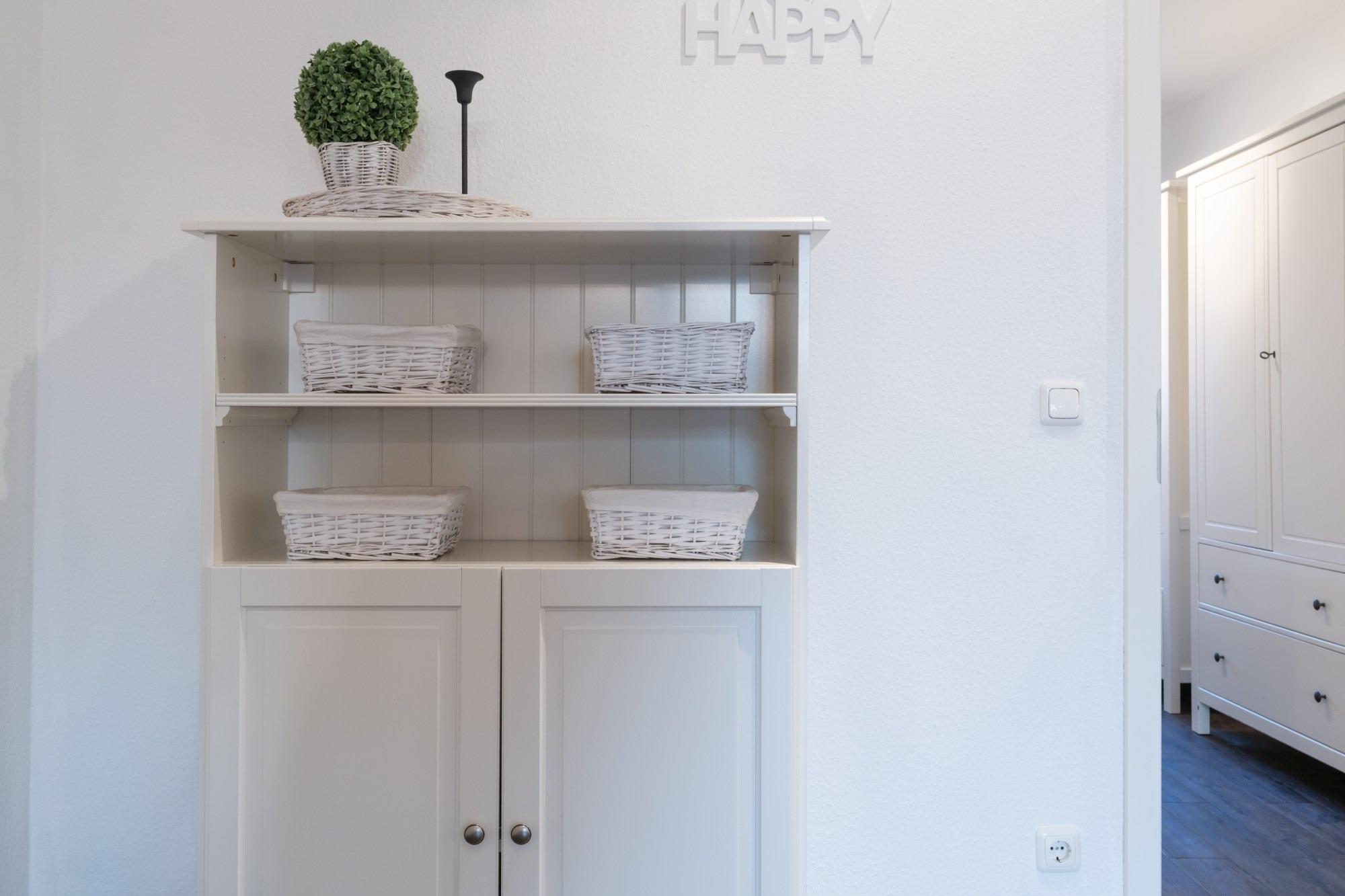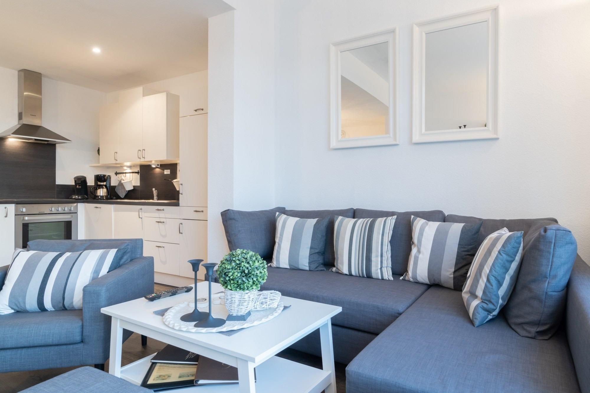 Die hier angrenzende Küchenzeile ist mit einem Kühlschrank mit Gefrierfach, einem Geschirrspüler und einem Backofen mit Cerankochfeld ausgestattet. Eine Kaffeemaschine, ein Toaster und ein Wasserkocher stehen Ihnen hier selbstverständlich zur Verfügung.