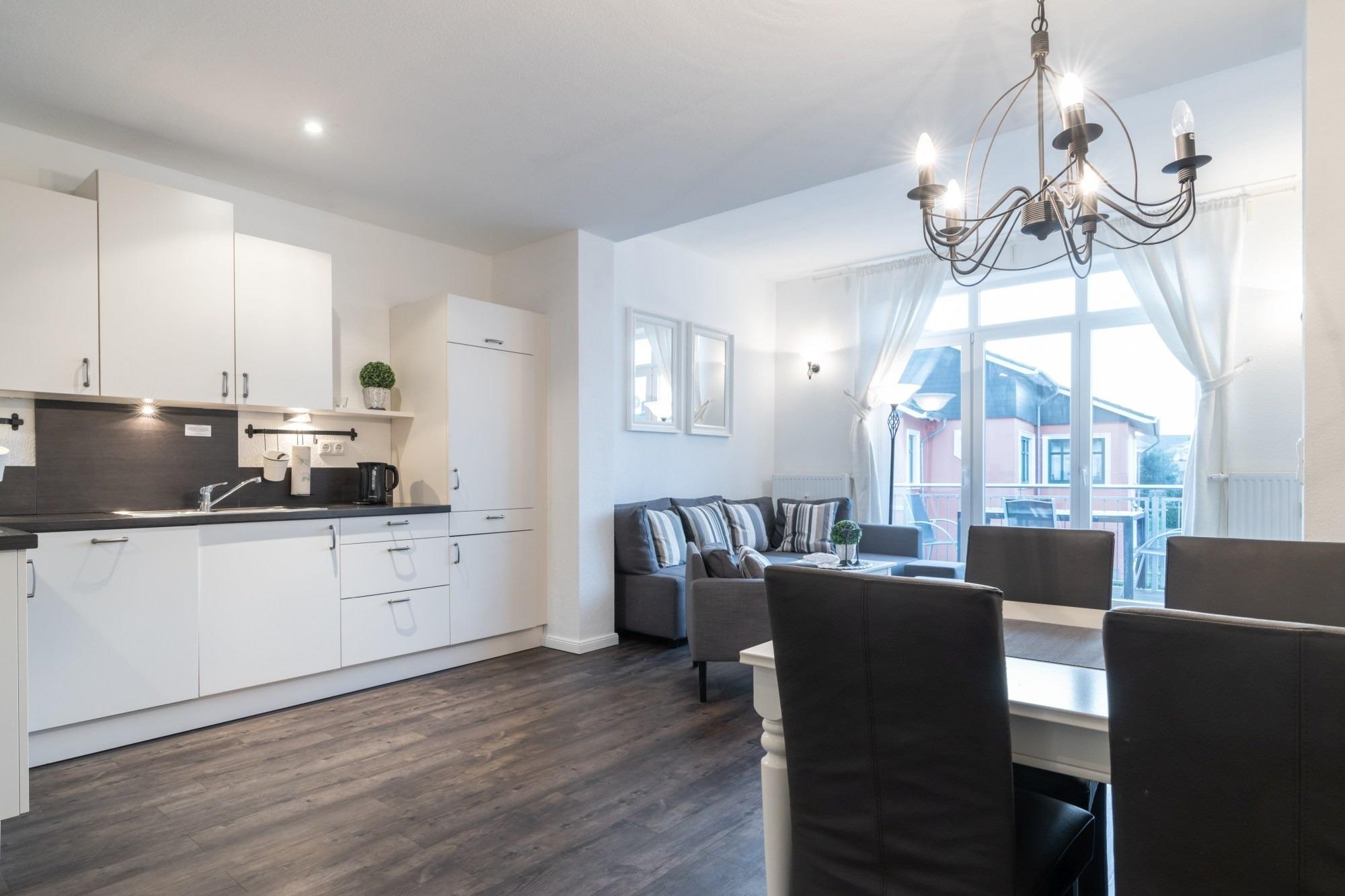 Die Ferienwohnung verfügt über einen Wohnbereich mit offener Küche, zwei Schlafzimmer, ein Bad mit Dusche und einen Balkon.