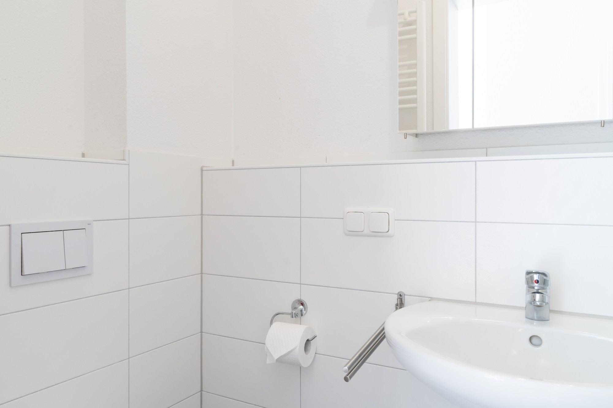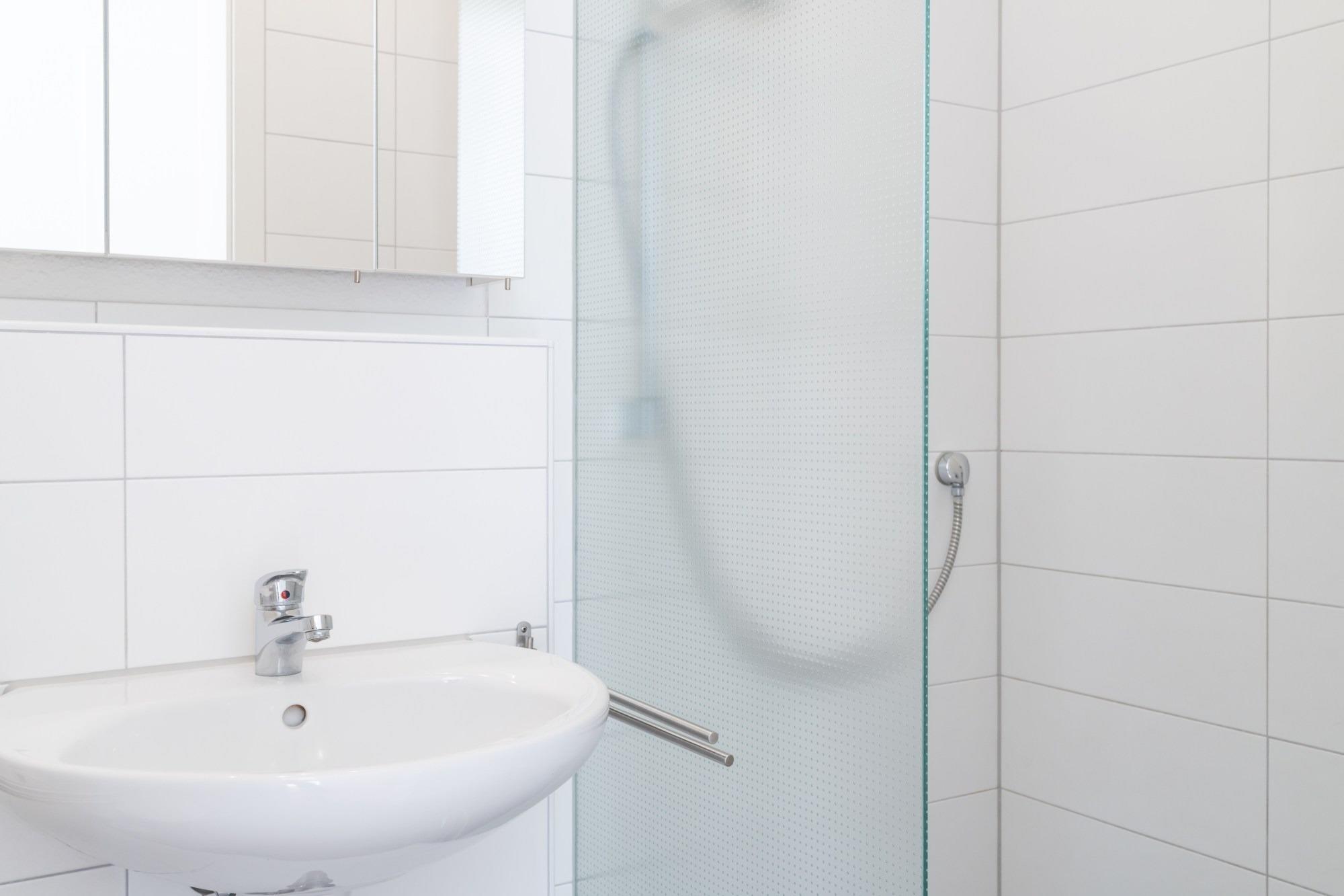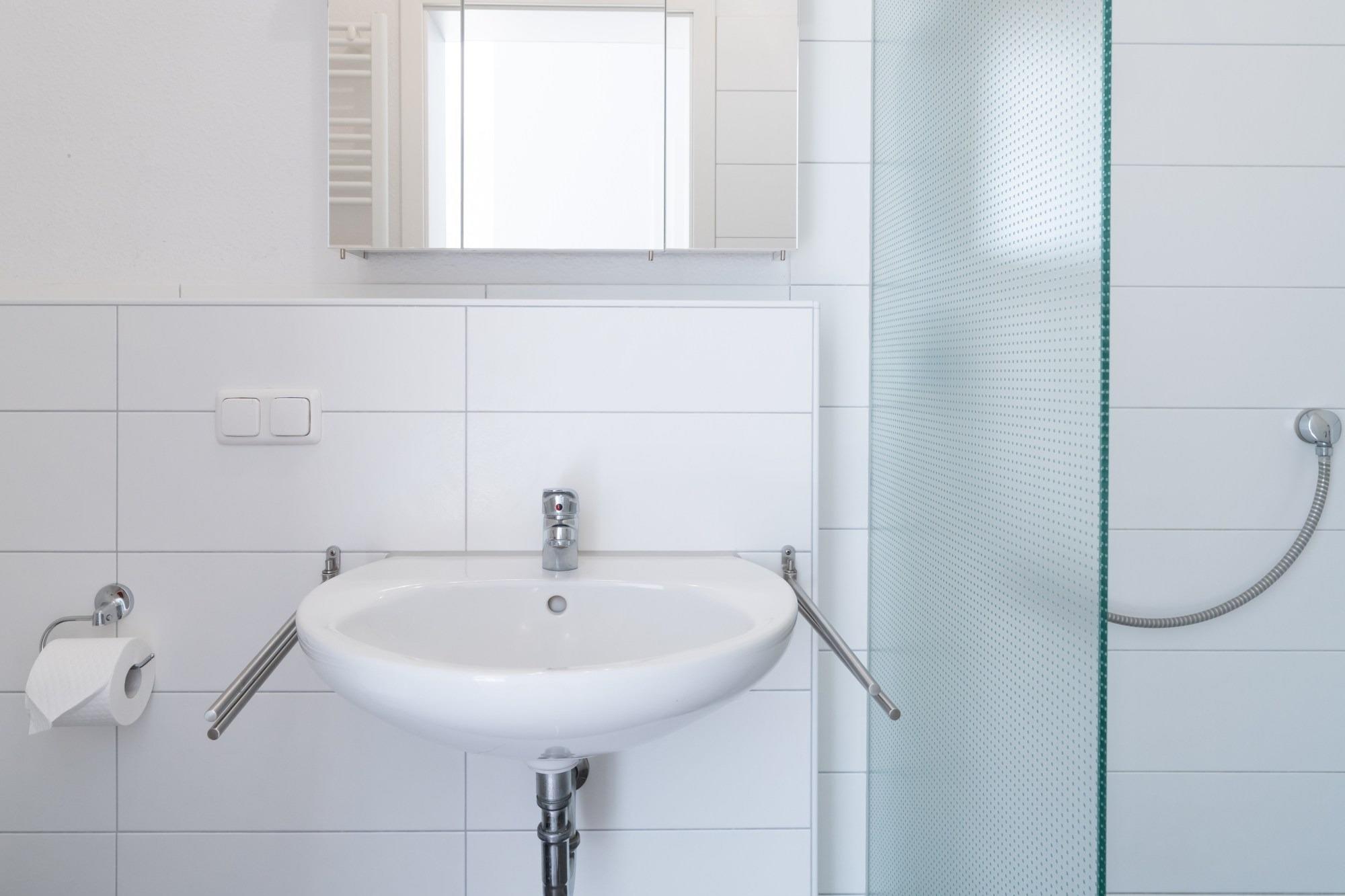 Das Badezimmer verfügt über eine Dusche (mit Absatz) und WC.
