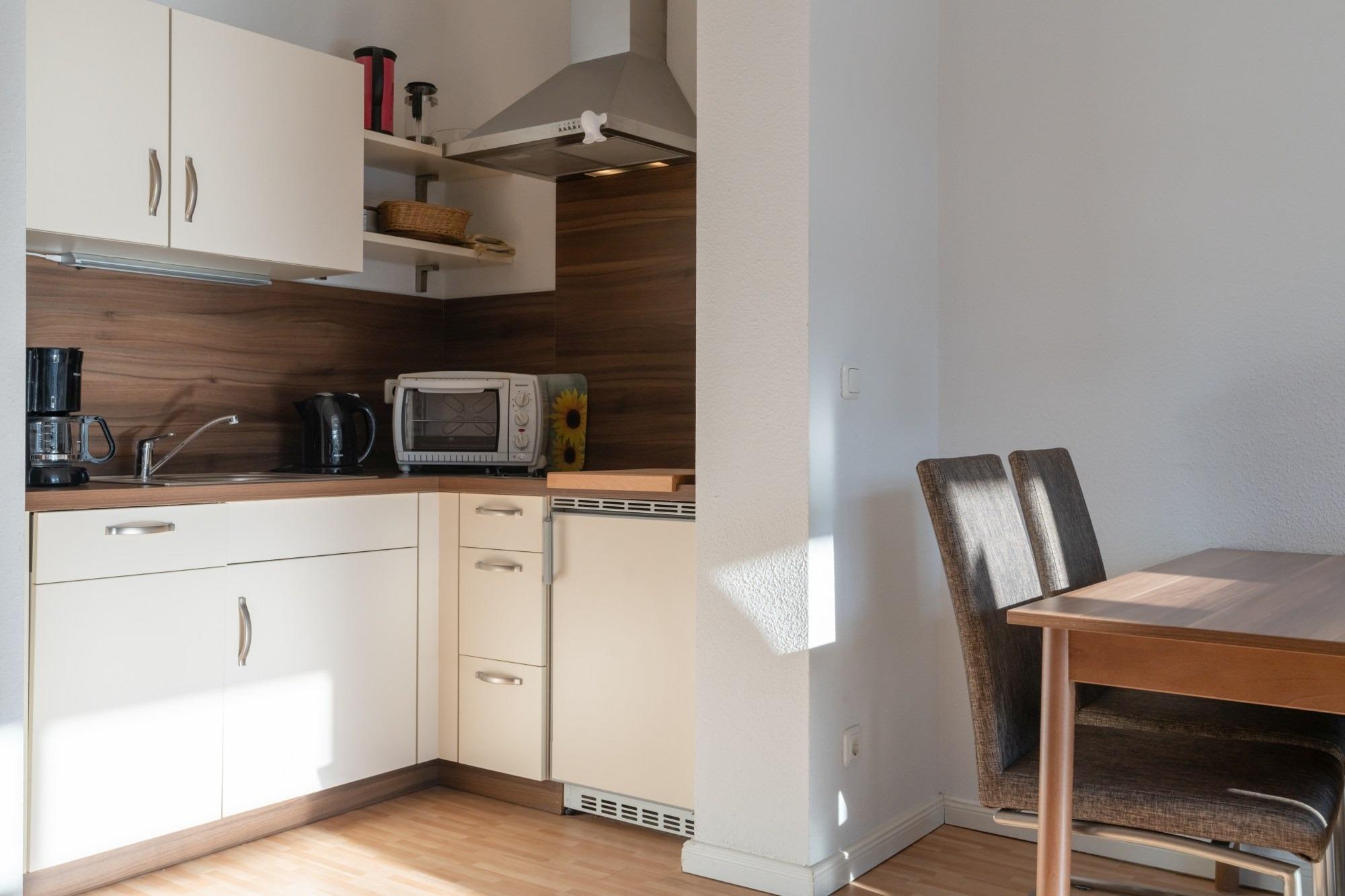Die hier angrenzende Küchenzeile ist mit einem Kühlschrank mit Gefrierfach, einem Geschirrspüler, einer Mikrowelle mit Backofenfunktion und einem Cerankochfeld ausgestattet. Eine Kaffeemaschine, ein Toaster und ein Wasserkocher stehen Ihnen hier selbstverständlich zur Verfügung.