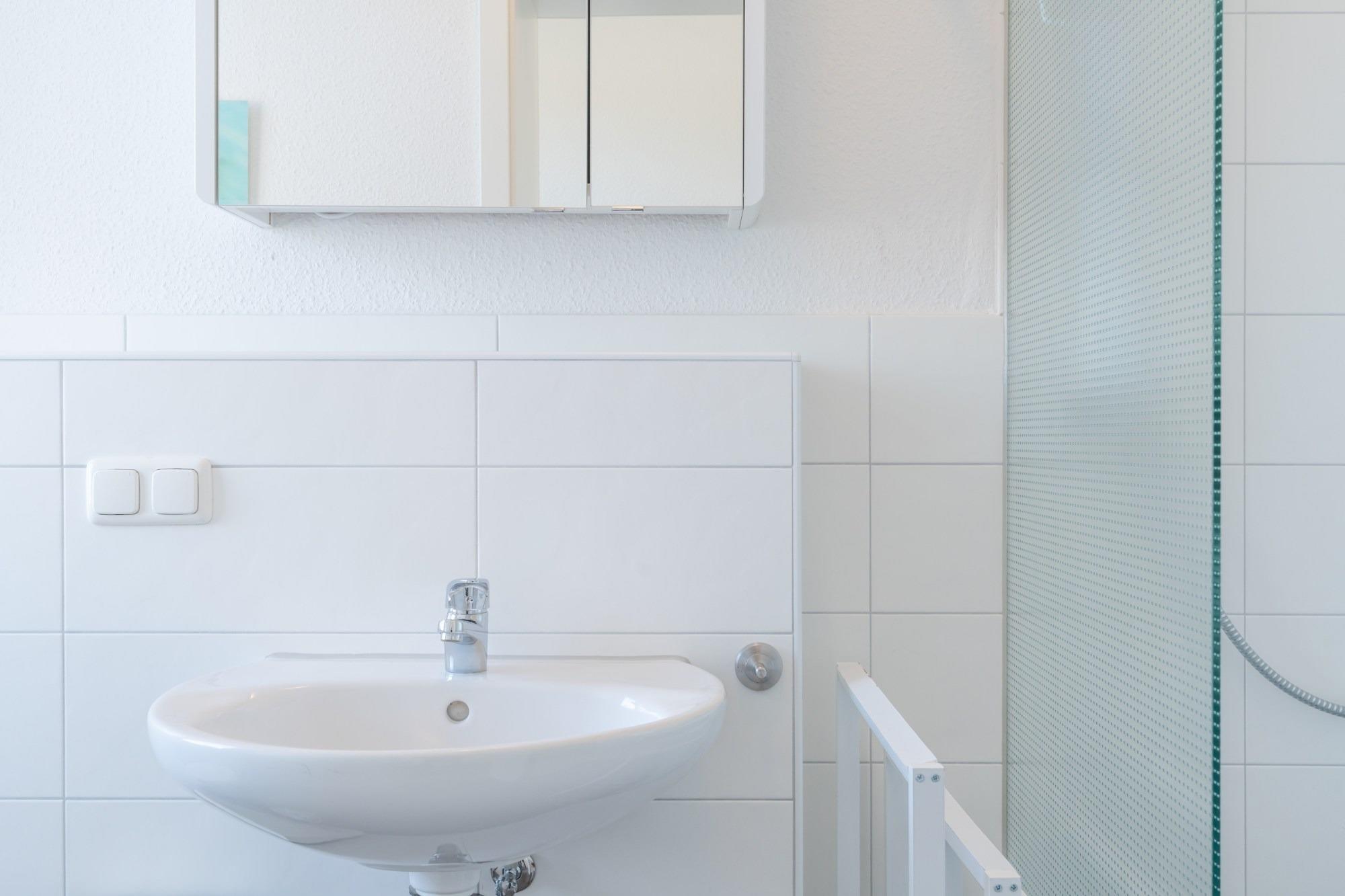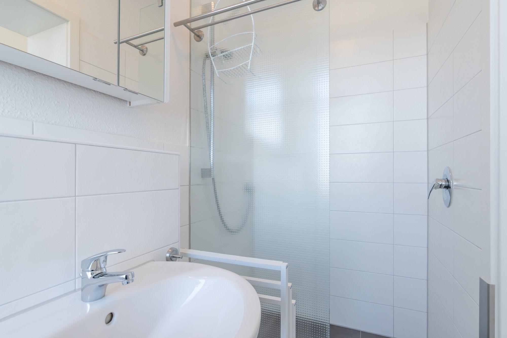 Das Badezimmer verfügt über eine Dusche (mit Absatz) und WC.