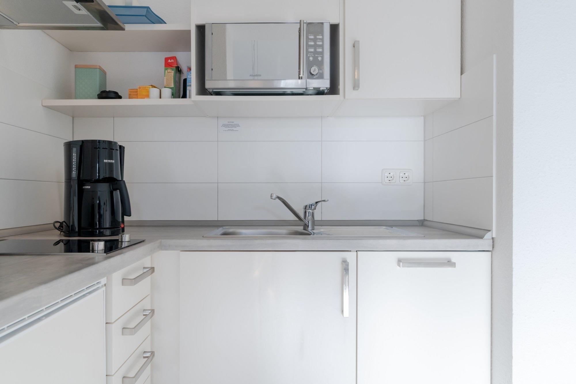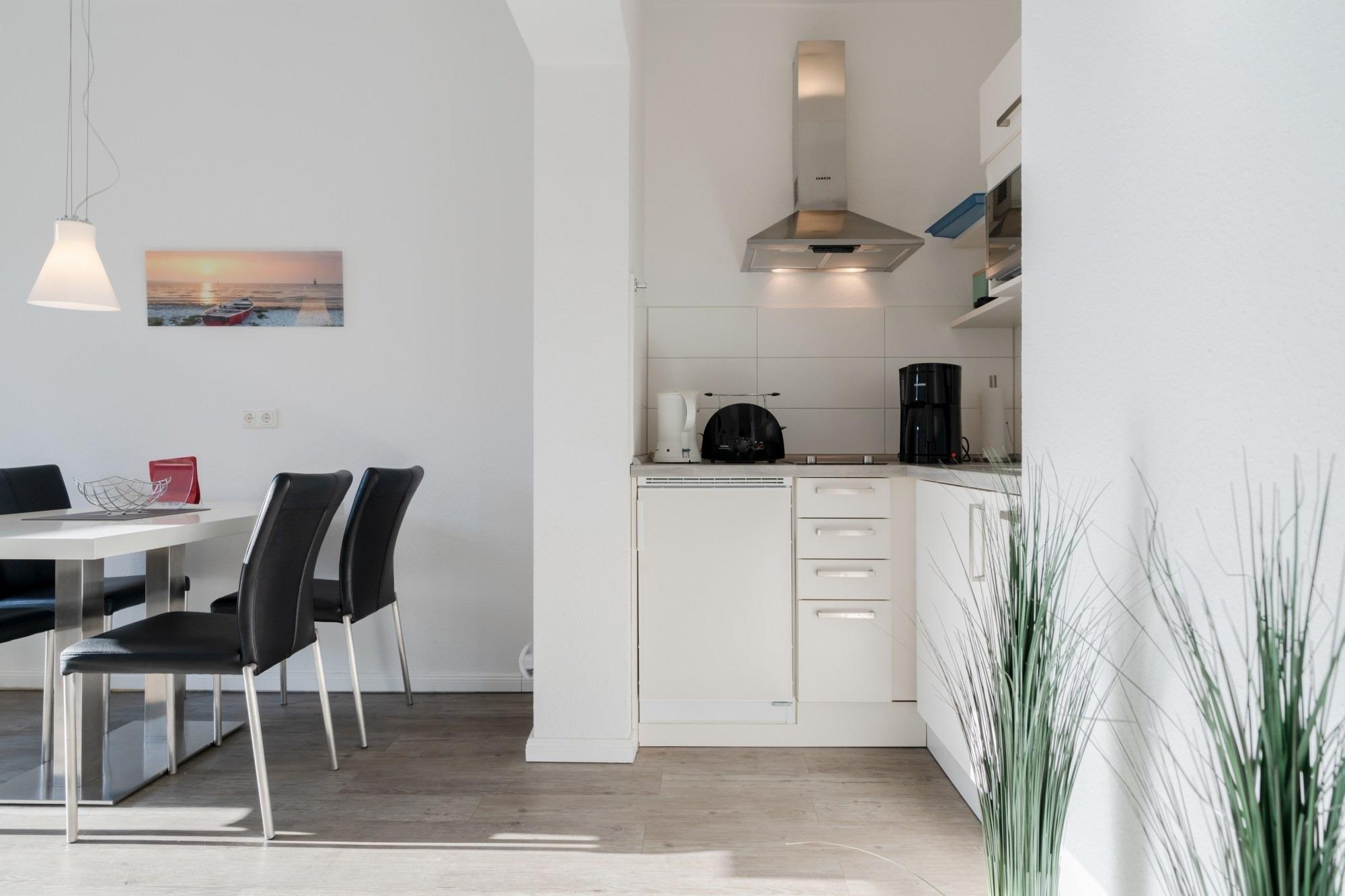 Die hier angrenzende Küchenzeile ist mit einem Kühlschrank mit Gefrierfach, einem Geschirrspüler, einer Mikrowelle mit Backofenfunktion und einem Cerankochfeld ausgestattet. Eine Kaffeemaschine, ein Toaster und ein Wasserkocher stehen Ihnen hier selbstverständlich zur Verfügung.
