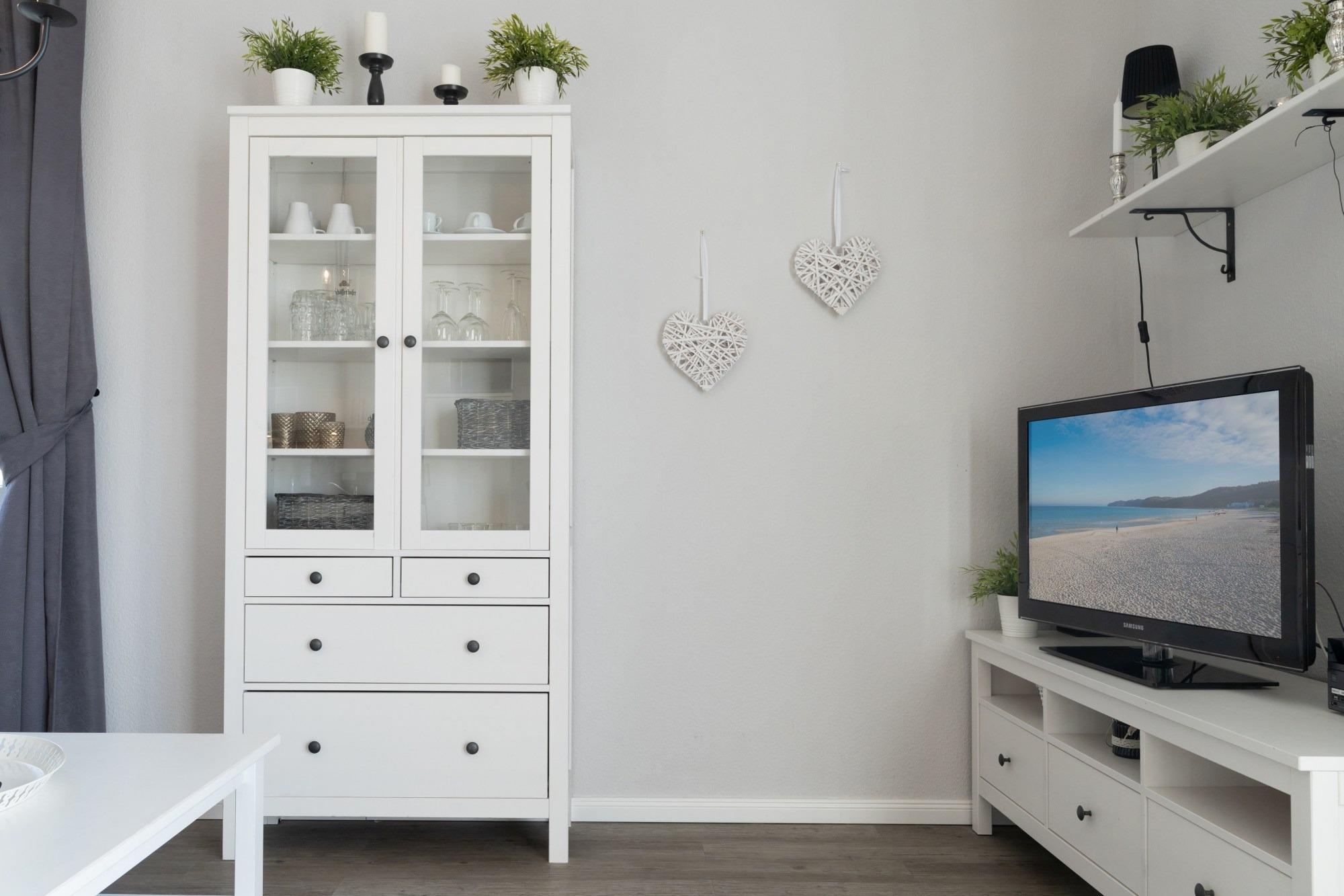 Die hier angrenzende Küchenzeile ist mit einem Kühlschrank mit Gefrierfach, einem Geschirrspüler und einem Backofen mit Cerankochfeld ausgestattet. Eine Kaffeemaschine, ein Toaster und ein Wasserkocher stehen Ihnen hier selbstverständlich zur Verfügung.