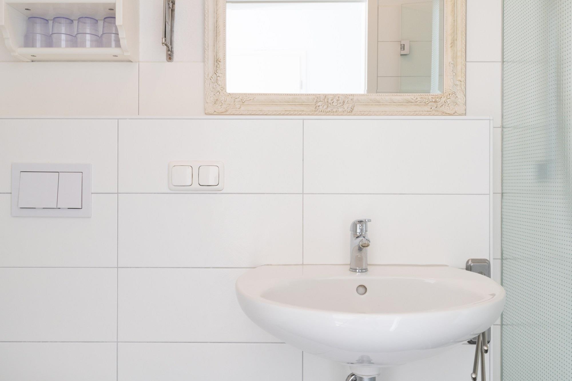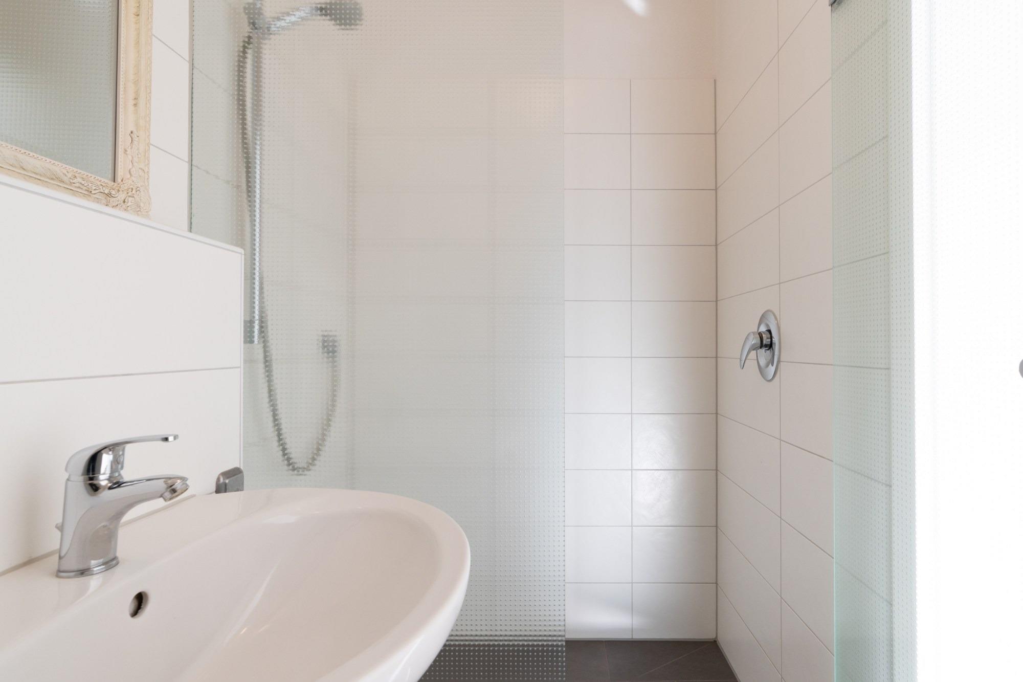 Das Badezimmer verfügt über eine Dusche (mit Absatz) und WC.