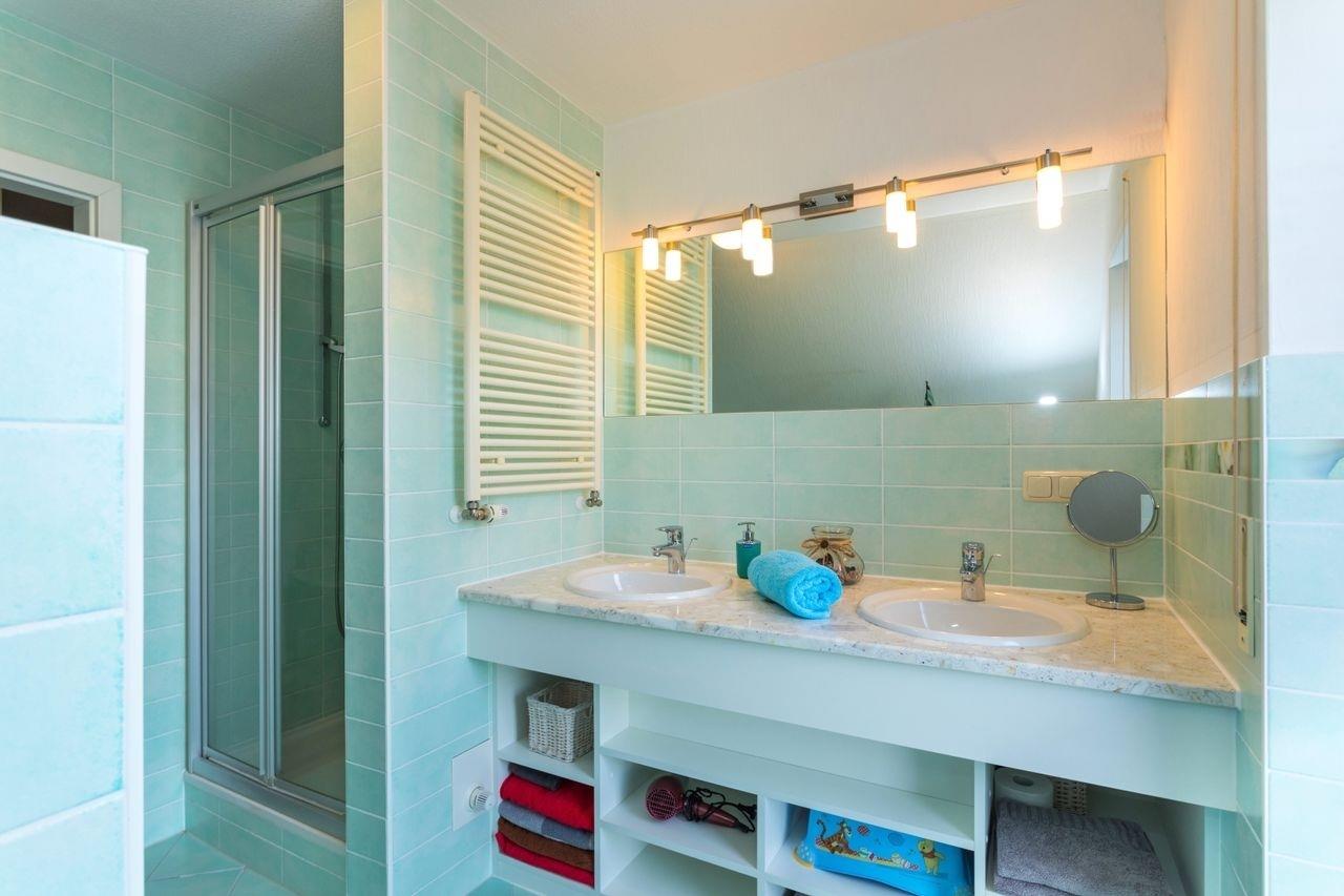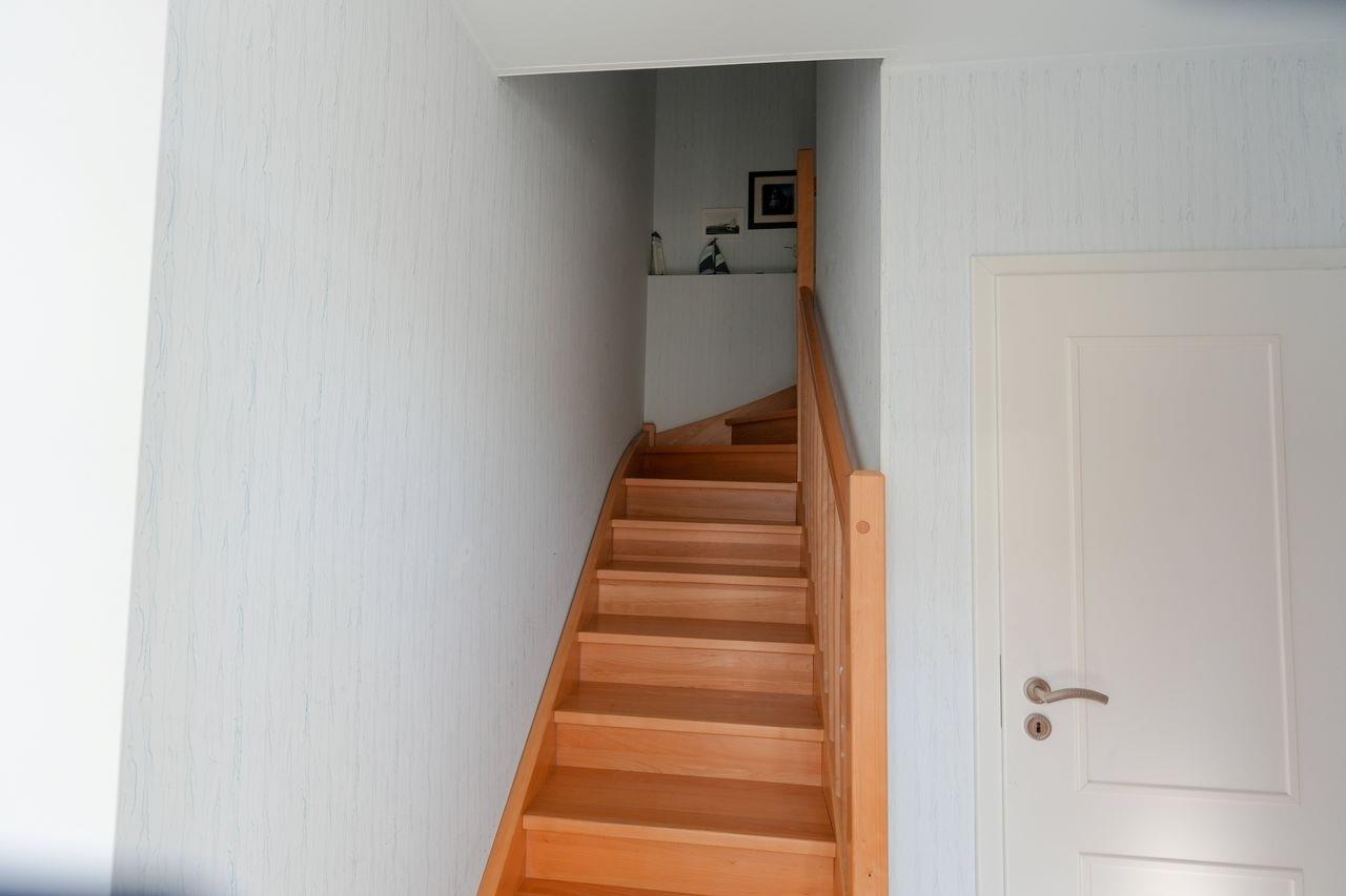 Im Erdgeschoss befindet sich ein HWR. Im Obergeschoss gibt es ein helles und geräumiges Wohnzimmer mit Esstisch, Flachbildfernseher, Kamin, gemütlicher großer Couch und einem Balkon. Außerdem gibt es eine offene und komplett ausgestattete Küche mit 4 Ceranfeldern, Backofen, Geschirrspüler, Kühlschrank, Gefrierschrank und Wasserkocher. Des Weiteren steht ein Badezimmer mit Badewanne, Dusche, WC und Haartrockner zur Verfügung. Ein Kinderzimmer mit Etagenbett (ca. 2,00m x 0,80m) ist ebenfalls vorhanden.
