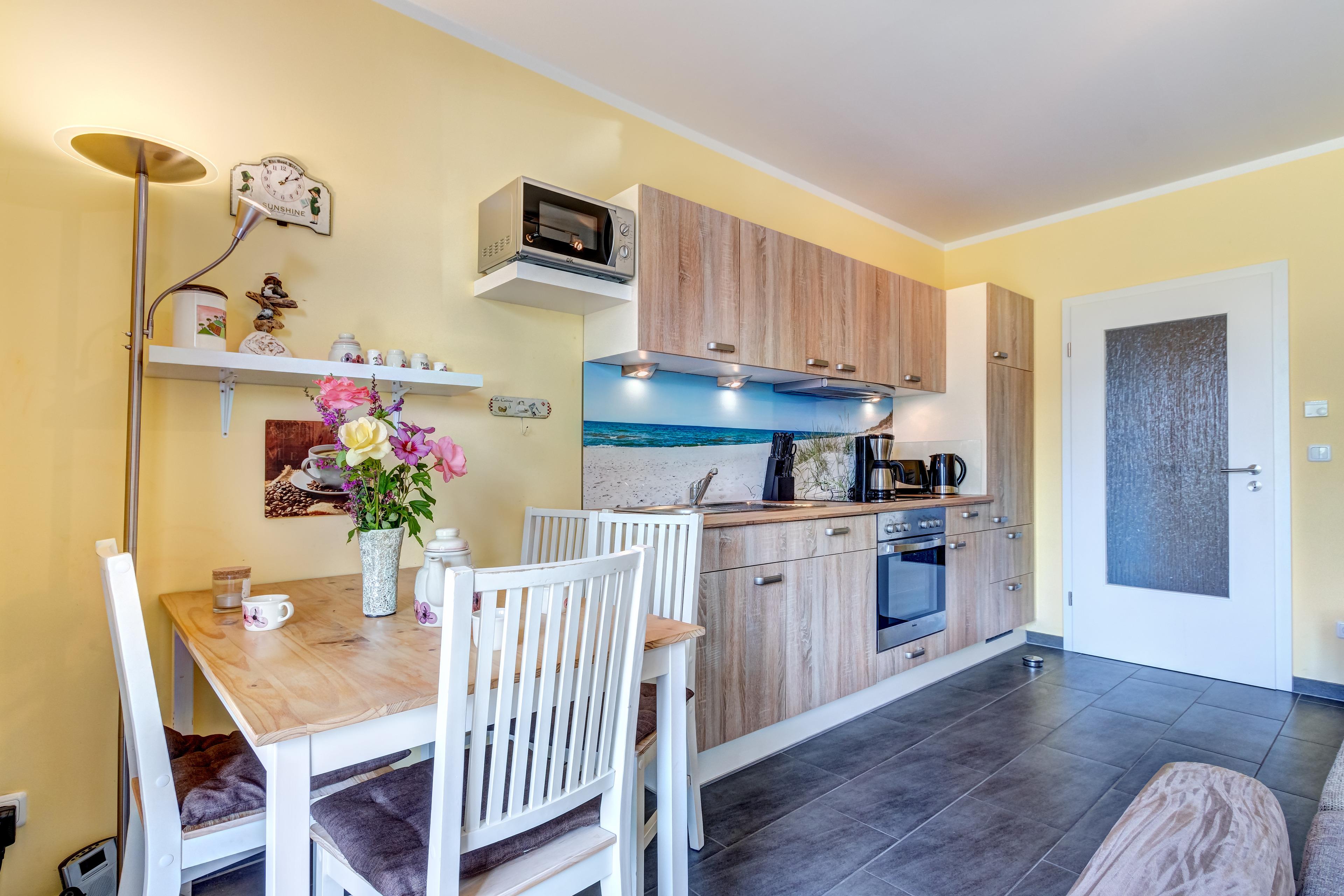 In der Ferienwohnung erwartet Sie eine komfortable Eckcouch, eine offene Küche und eine Terrasse mit Gartenblick. Ein Kaminofen sorgt für behagliche Wärme und die Sauna lädt nach dem Strandbesuch zu entspannten, wohltuenden Stunden ein.