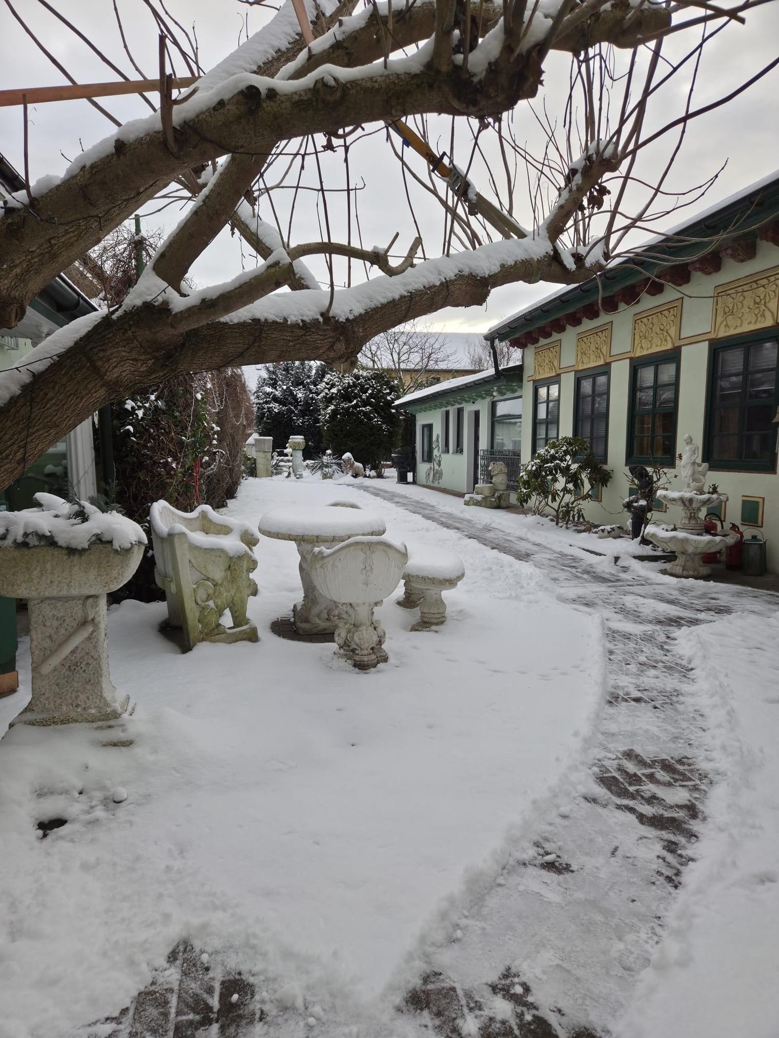 Vor der Wohnung im Freien gibt es eine Sitzguppe.