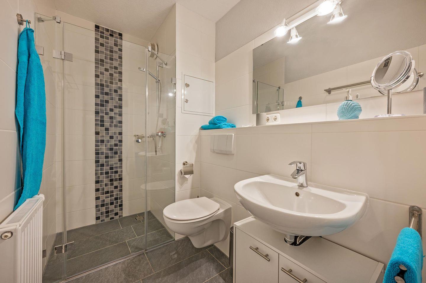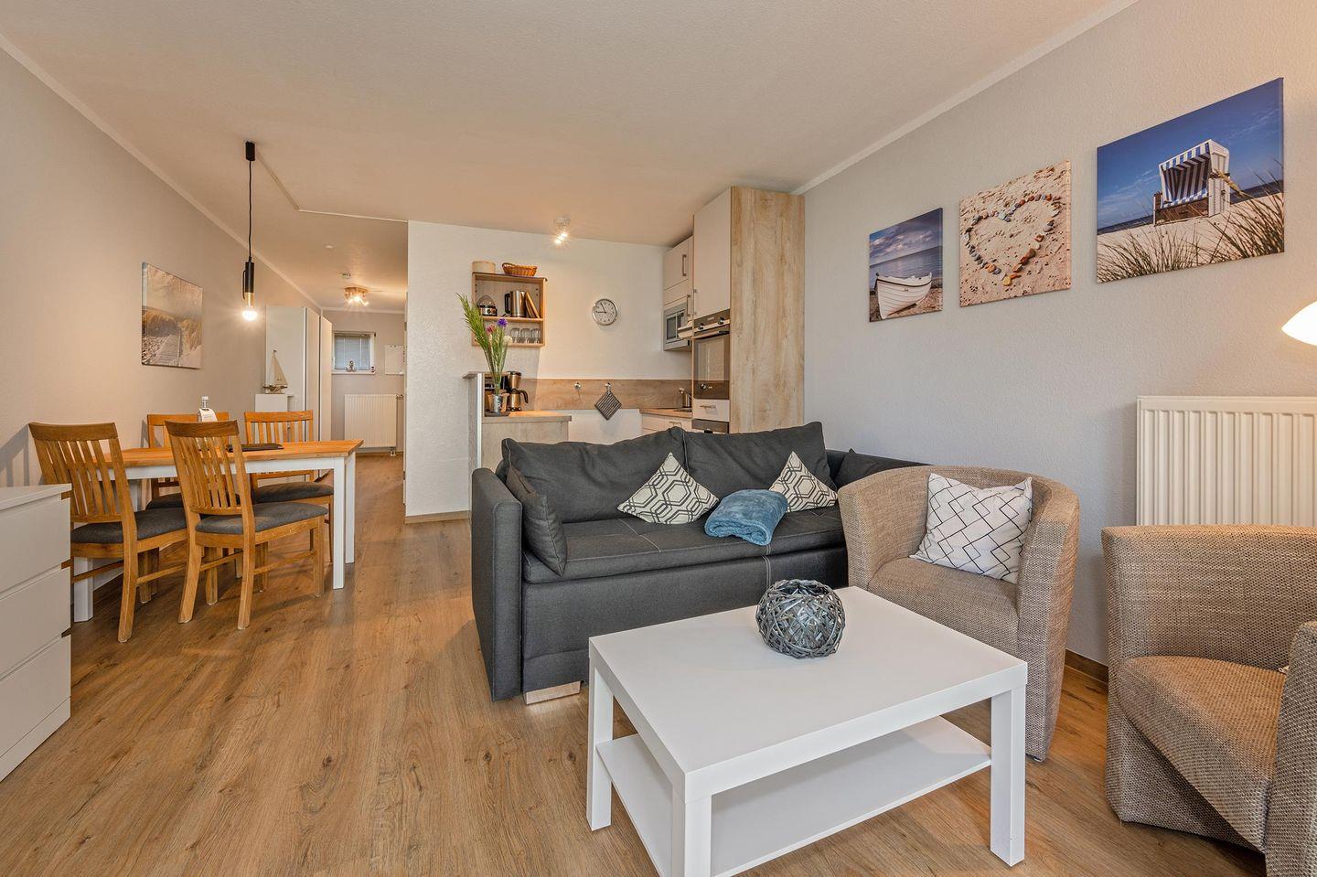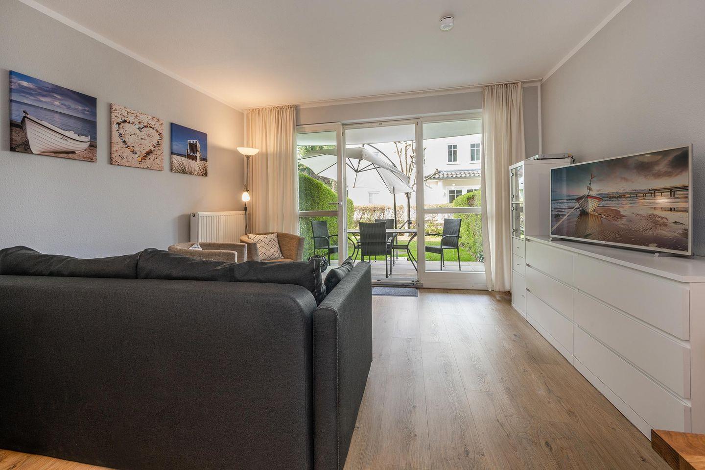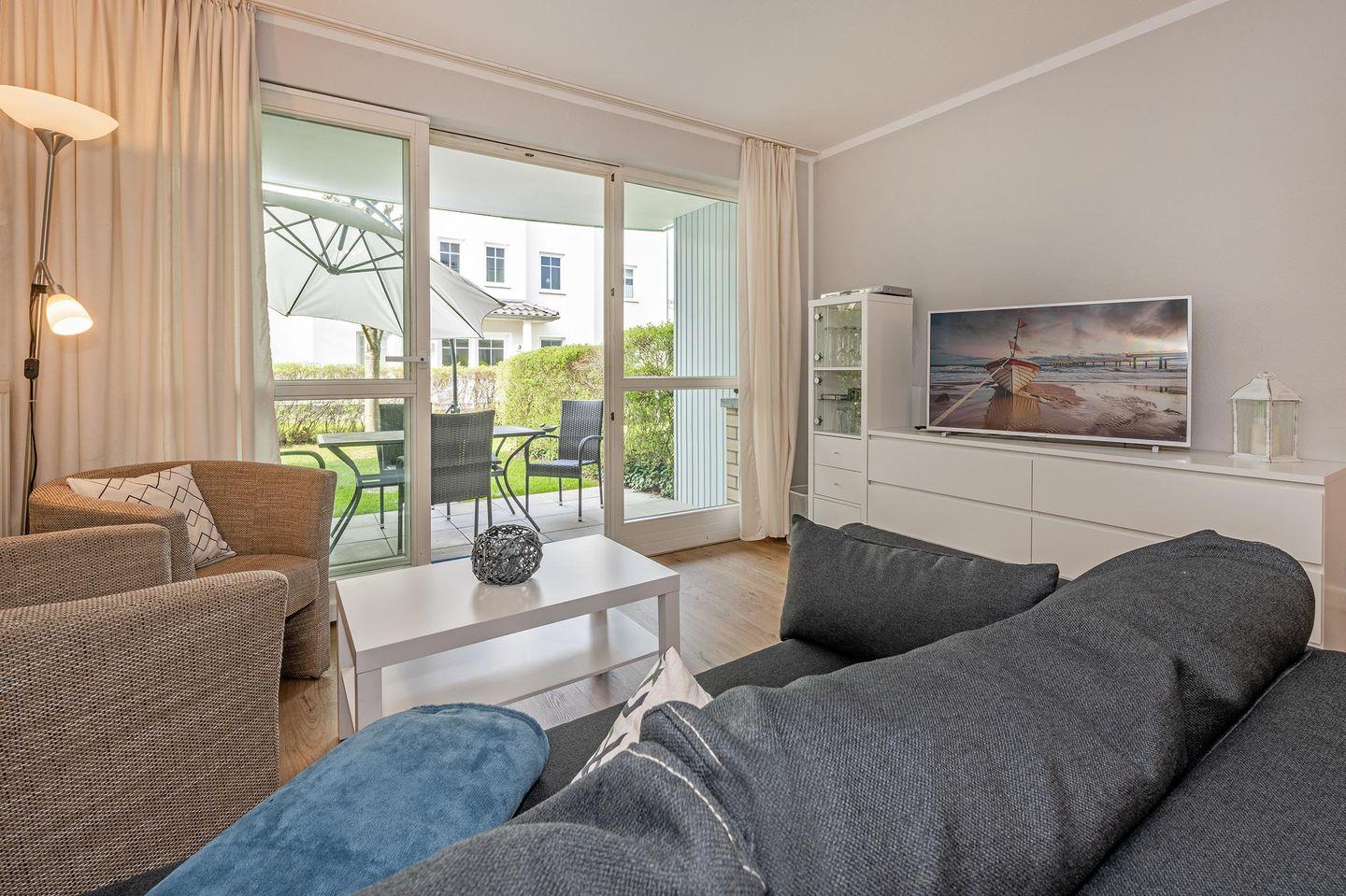 Die Wohnung ist in einem modernen Stil in natürlicher Farbgebung hergerichtet und bietet bis zu zwei Erwachsenen und einem Kind ausreichend Platz. Das Wohnzimmer verfügt über eine gemütliche Wohnlandschaft, bestehend aus einer Couch und zwei Sesseln, und einem TV zu Ihrer Unterhaltung. Genießen Sie einen Kaffee am Nachmittag auf der anliegen Terrasse bei schönstem Wetter oder dinieren Sie gemeinsam am Esstisch im Wohnbereich. Schnelle Mahlzeiten lassen sich fabelhaft in der kleinen Küche zubereiten, welche offen zum Wohnzimmer gestaltet wurde. Sie finden dort praktische Helfer wie einen Zwei-Platten-Herd, Backofen, Mikrowelle, Geschirrspüler und einen Kühlschrank mit Gefrierfach. Das Schlafzimmer ist mit einem Boxspringbett (1,80 x 2,00 Meter), einem Kleiderschrank und einer Kommode ausgestattet. Zusätzlich befindet sich hier ein weiterer Fernseher für hohen Komfort. In der kühleren Jahreszeit lässt sich die Zeit auch wunderbar in dem zum Schlafzimmer angrenzenden Wintergarten verbringen. Das Badezimmer ist mit einem Waschbecken, WC, Handtuchheizung und einer ebenerdigen Dusche eingerichtet.