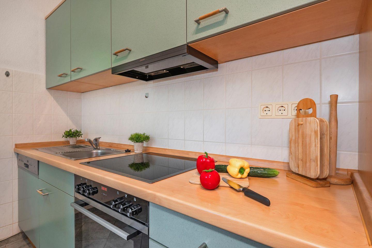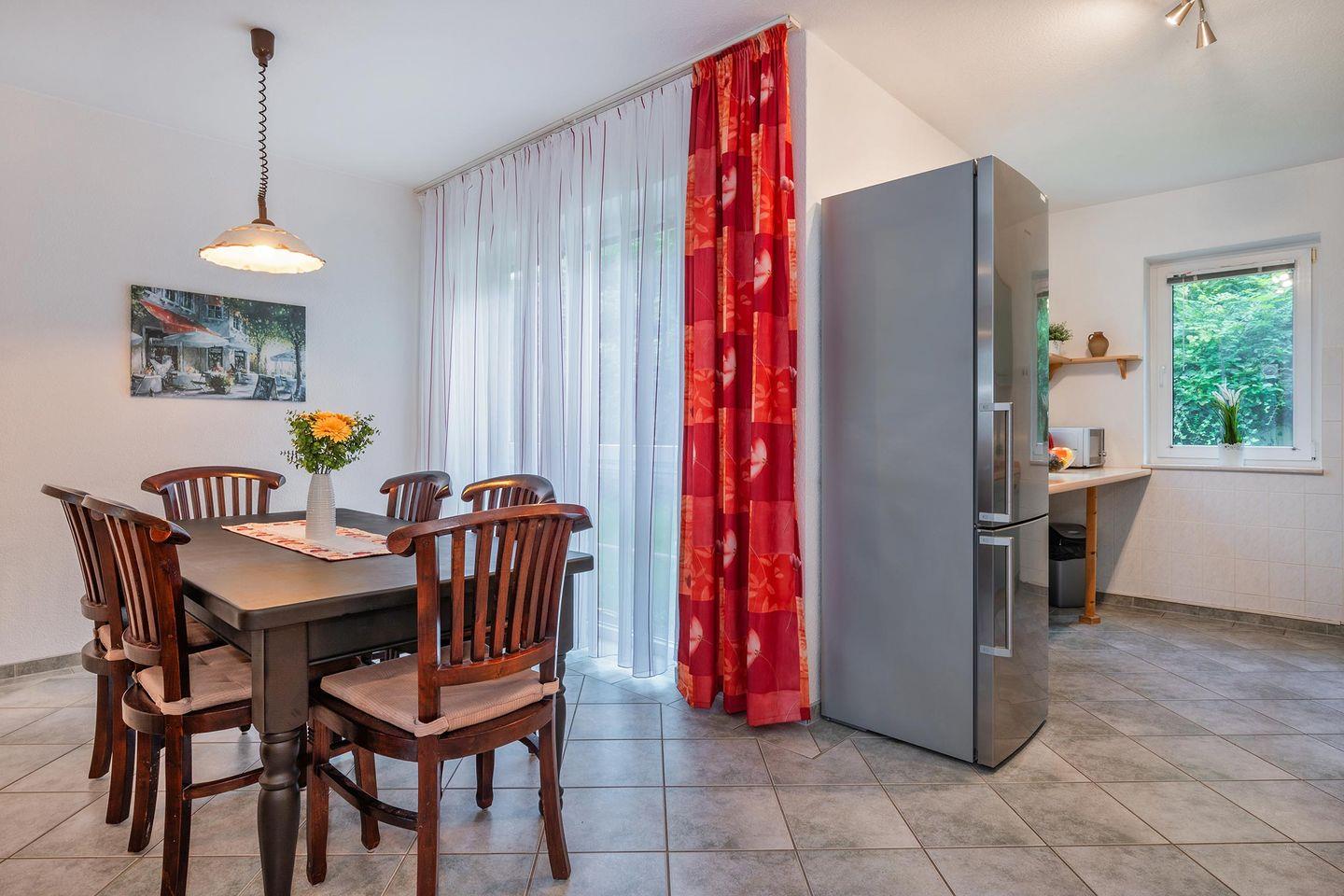 Die separate Küche lädt zu einem gemeinsamen Familienessen an dem großen Esstisch ein. Viel Arbeitsfläche und wichtige Küchengeräte wie ein 4-Platten-Herd mit Backofen, Geschirrspülmaschine, Kühlschrank und weitere relevante Utensilien ermöglichen Ihnen das Zubereiten vielfältiger Mahlzeiten – auch im Urlaub.
