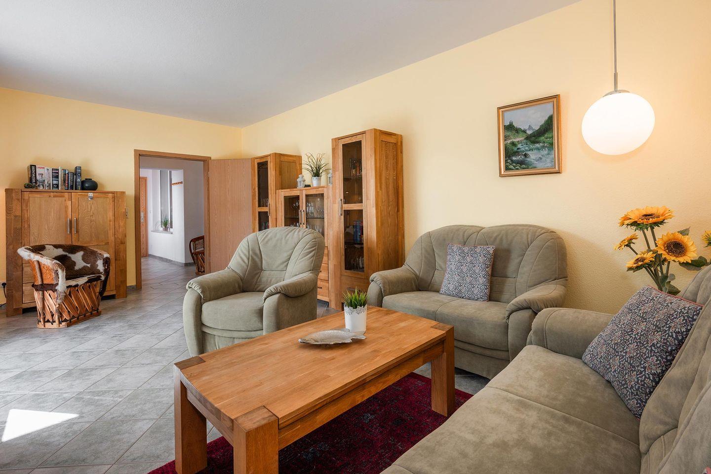 Im Wohnzimmer befindet sich eine Gruppe aus bequemen Polstermöbeln, die der ganzen Familie ausreichen Platz für einen entspannten Filmeabend beschert. Ein Flat-TV darf hierbei natürlich nicht fehlen. Zudem sind zwei Kommoden Bestandteil der Raumausstattung. Zusätzliche Unterhaltung bieten diverse Bücher und eine Spielesammlung. Vom Wohnbereich aus erreichen Sie die teilüberdachte Terrasse. Dank der südöstlichen Ausrichtung lässt es sich hier bei bestem Sonnenscheinwetter hervorragend frühstücken.