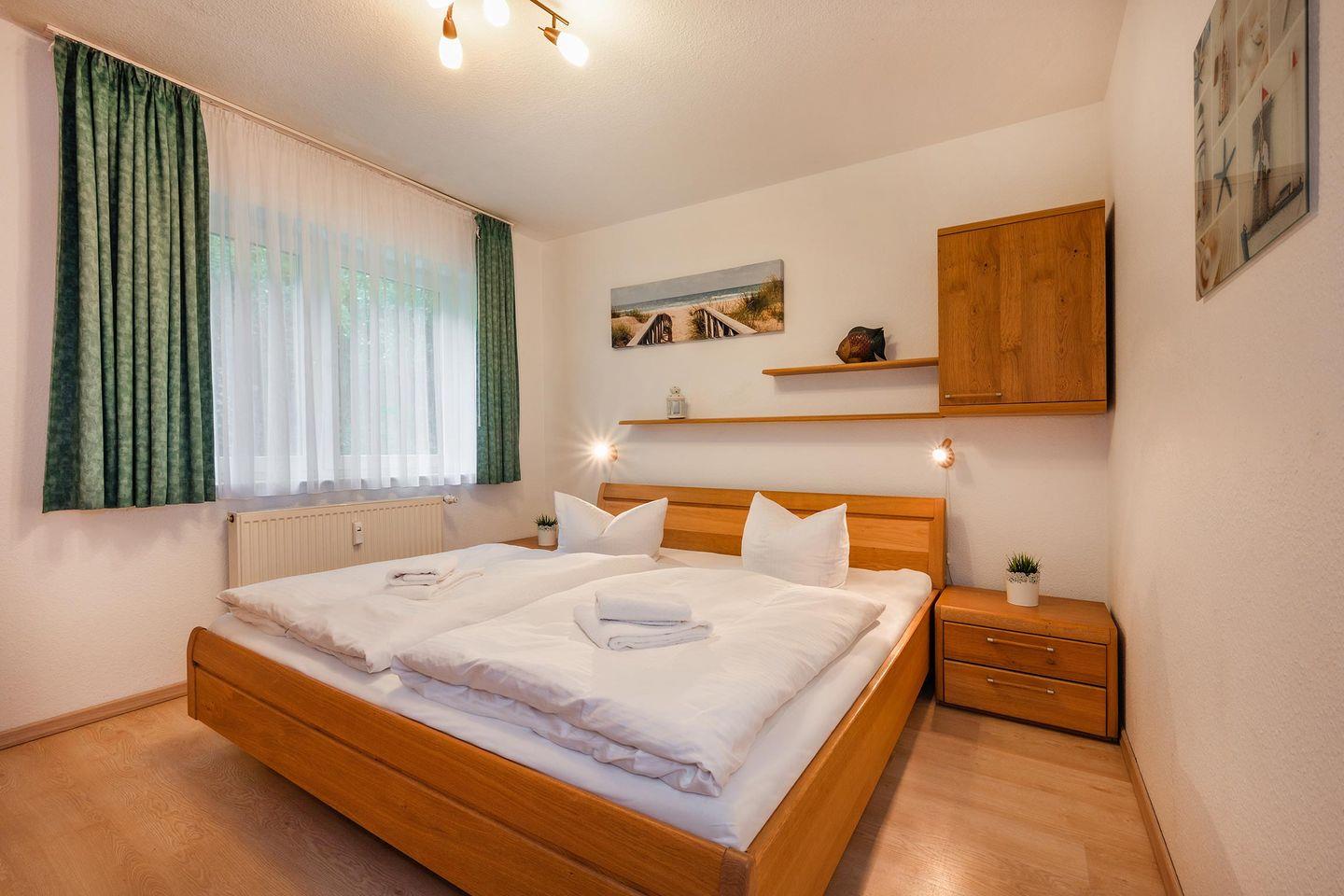 Im Elternschlafzimmer befindet sich ein großzügig bemessenes Doppelbett (Liegefläche 2,00 x 2,00 Meter) und ein Kleiderschrank. Das zweite Schlafzimmer verfügt über zwei Einzelbetten und für zusätzlichen Stauraum auch eine Kommode.