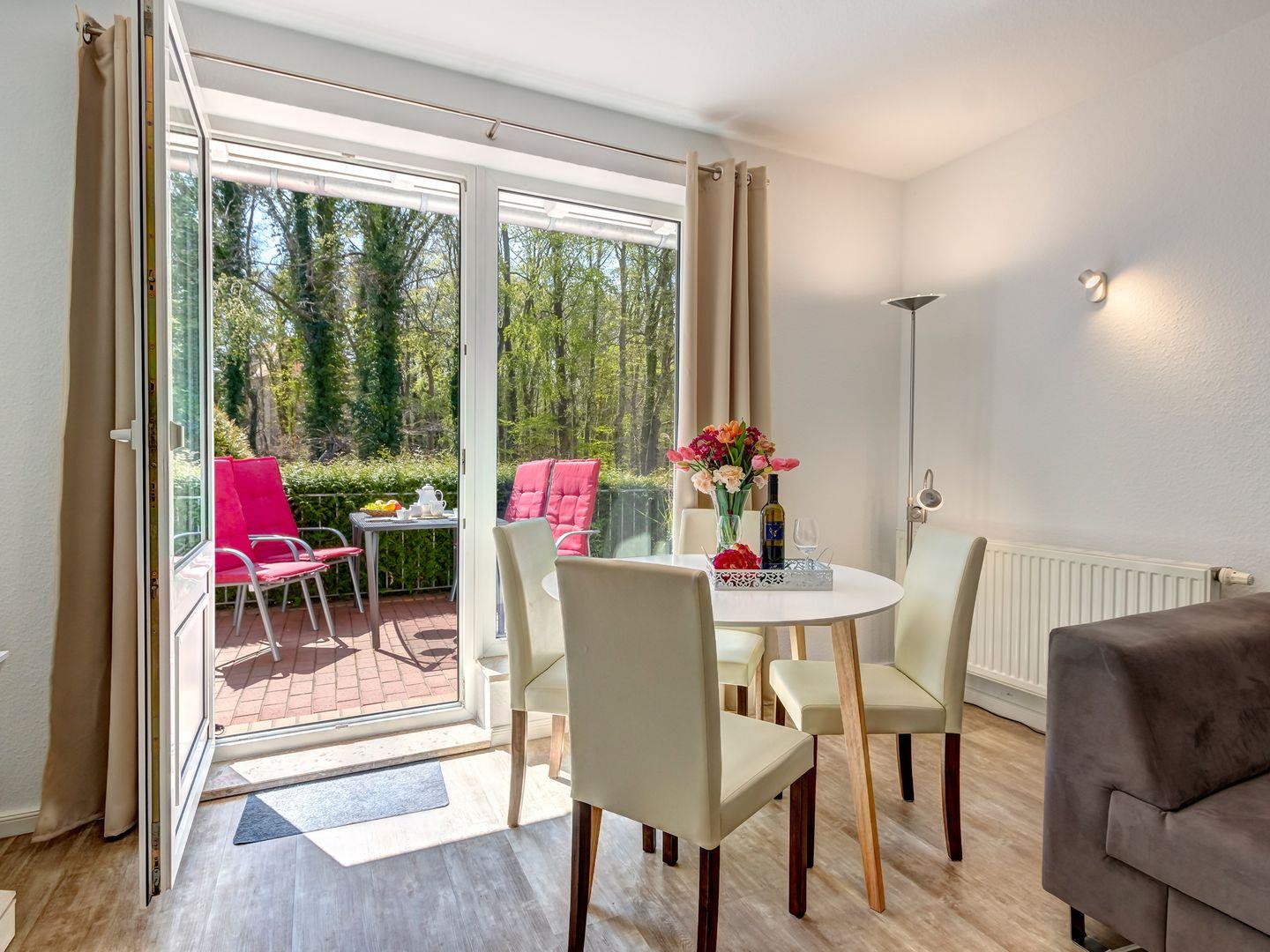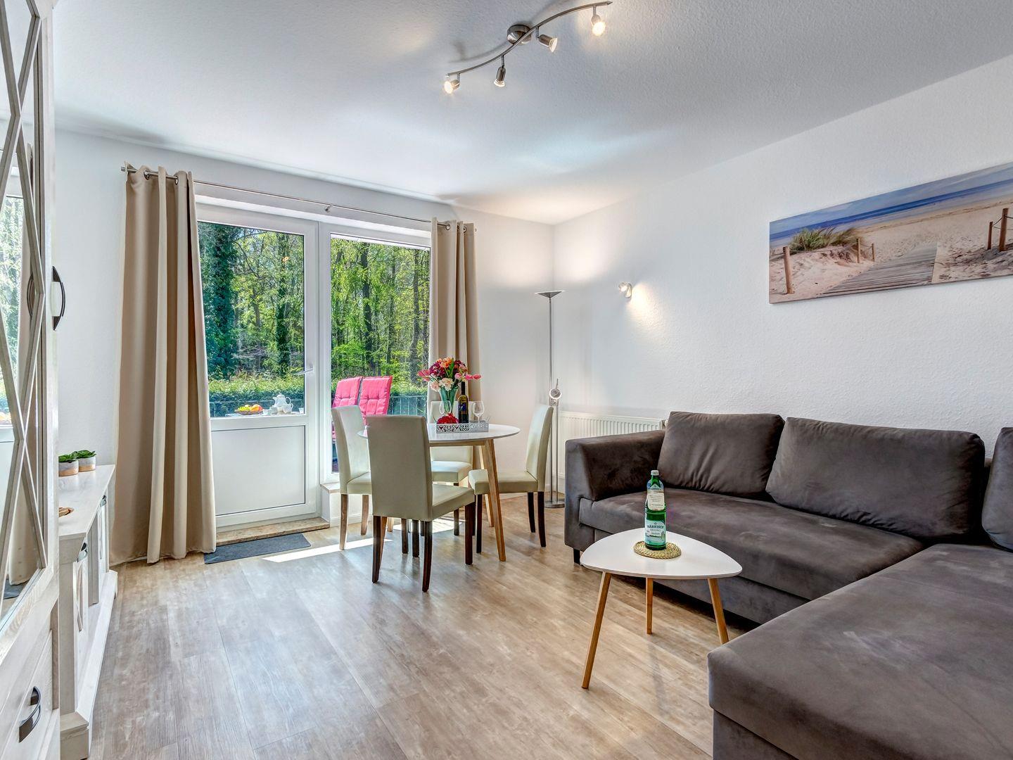 Unsere 60 qm große 2-Zimmer-Wohnung vereint durchdachtes Design mit einer behaglichen Atmosphäre. Das helle Wohnzimmer öffnet sich zu einer sonnigen Terrasse mit Gartenmöbeln, auf der Sie die frische Meeresluft genießen und zur Ruhe kommen können. Die voll ausgestattete Küche ermöglicht Ihnen eine flexible und unkomplizierte Selbstversorgung.