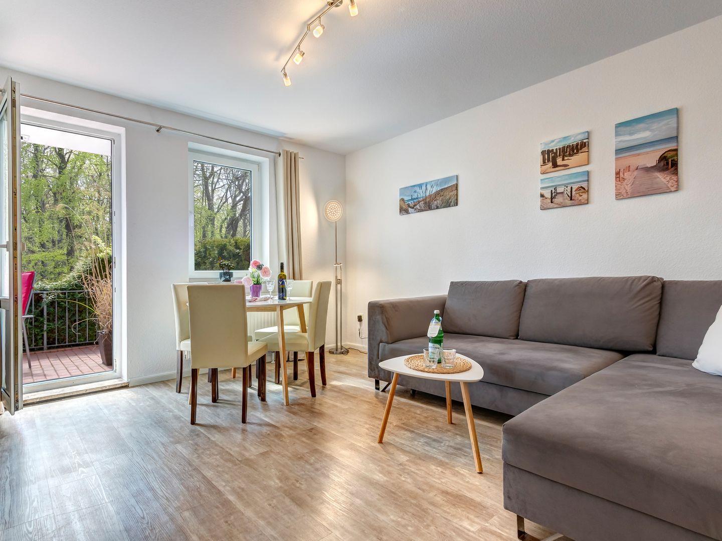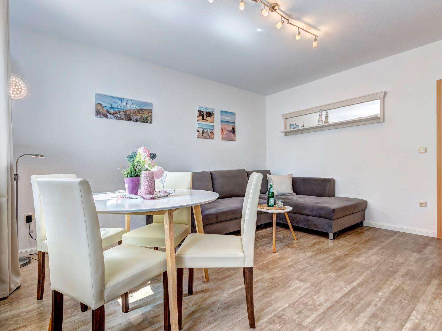 Unsere 60 qm große 2-Zimmer-Wohnung vereint durchdachtes Design mit einer behaglichen Atmosphäre. Das helle Wohnzimmer öffnet sich zu einer sonnigen Terrasse mit Gartenmöbeln, auf der Sie die frische Meeresluft genießen und zur Ruhe kommen können. Die voll ausgestattete Küche ermöglicht Ihnen eine flexible und unkomplizierte Selbstversorgung.