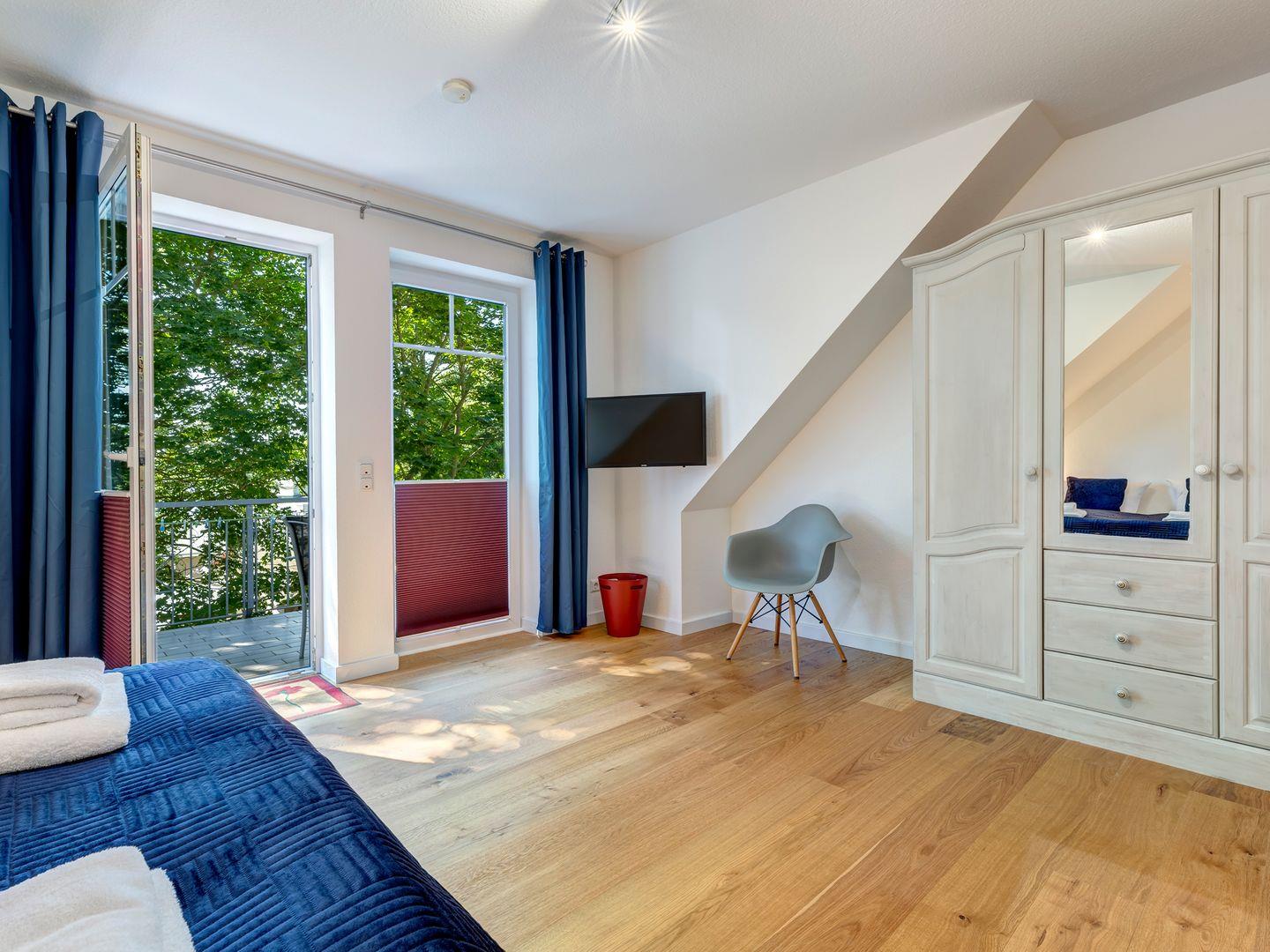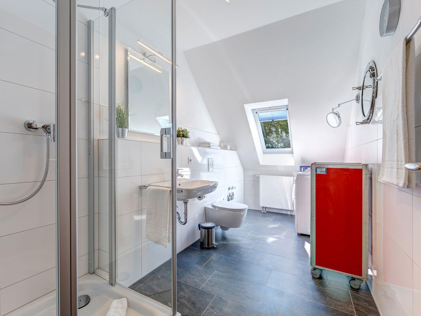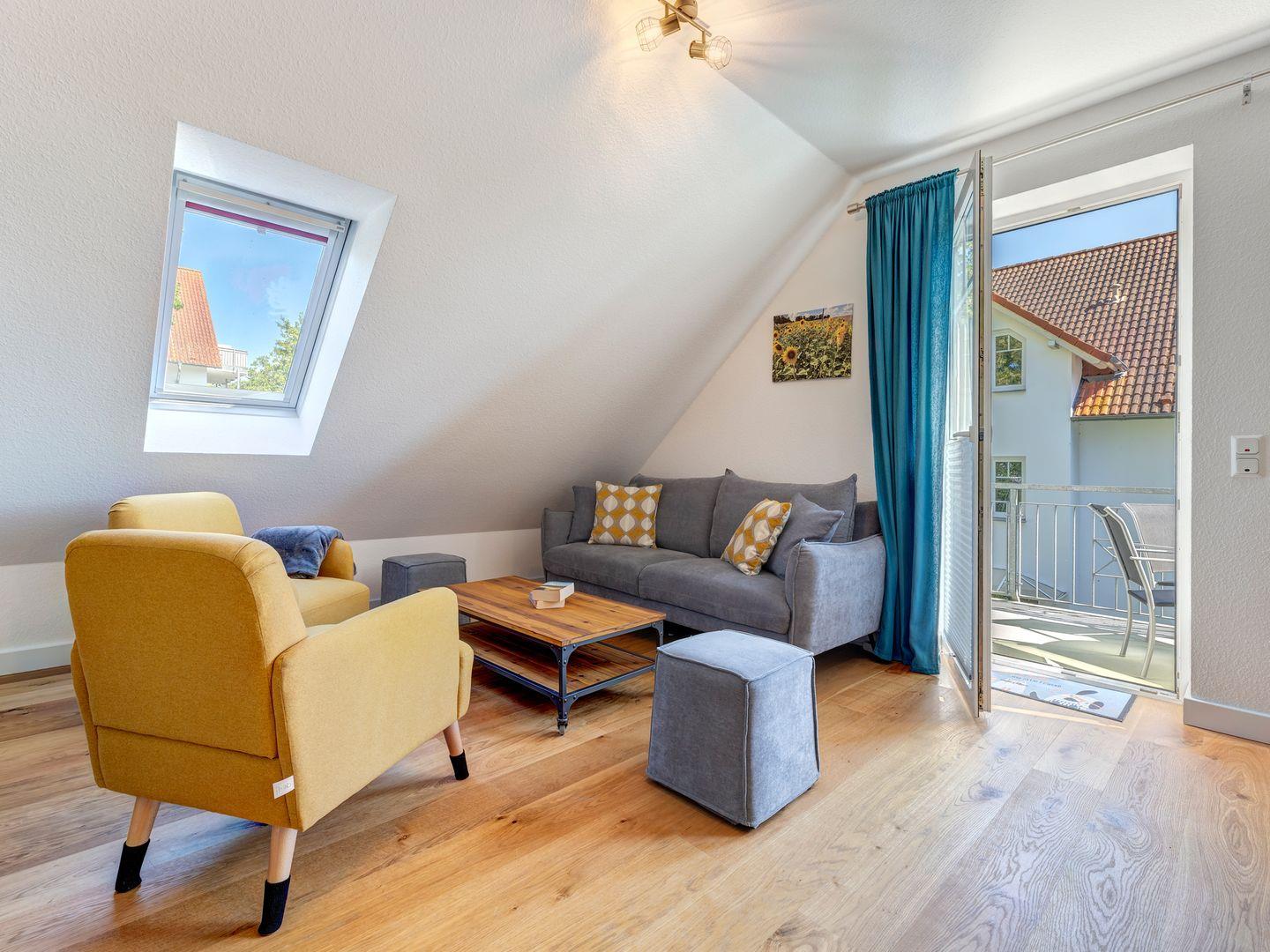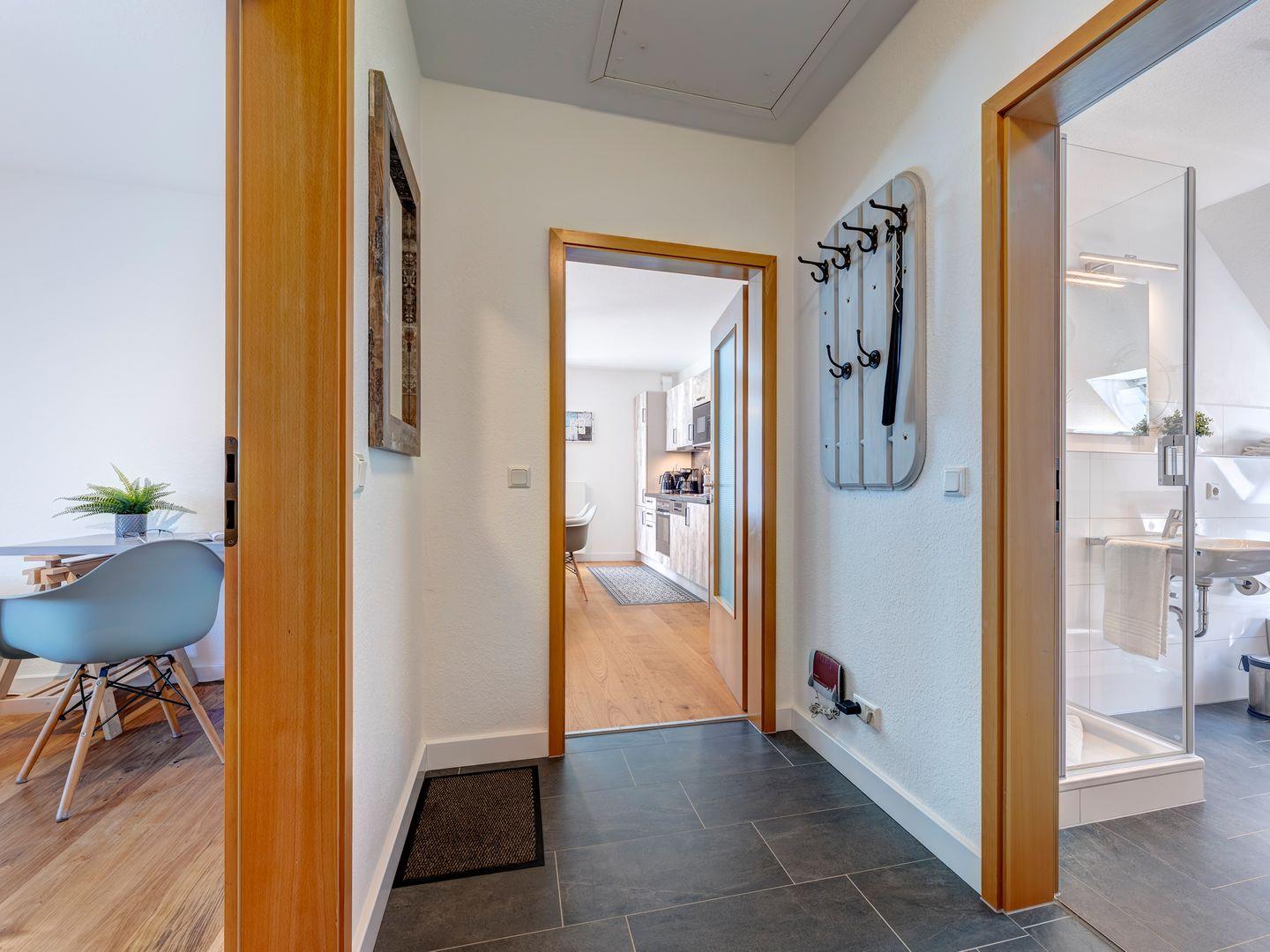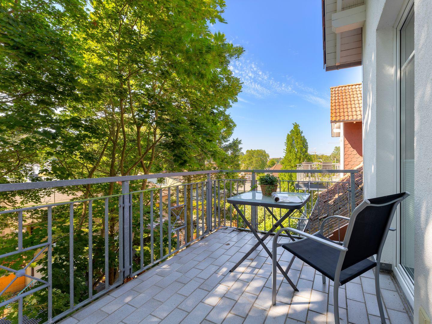 Die beiden Balkone, mit Südausrichtung oder auch Westausrichtung, ist über das Wohnzimmer zugänglich und bietet einen schönen Platz zum Entspannen. Das großzügige Duschbad ist mit einem Waschbecken, WC, einer geräumigen Dusche sowie einem beleuchteten Trapezspiegel ausgestattet und rundet den Komfort der Ferienwohnung ab.