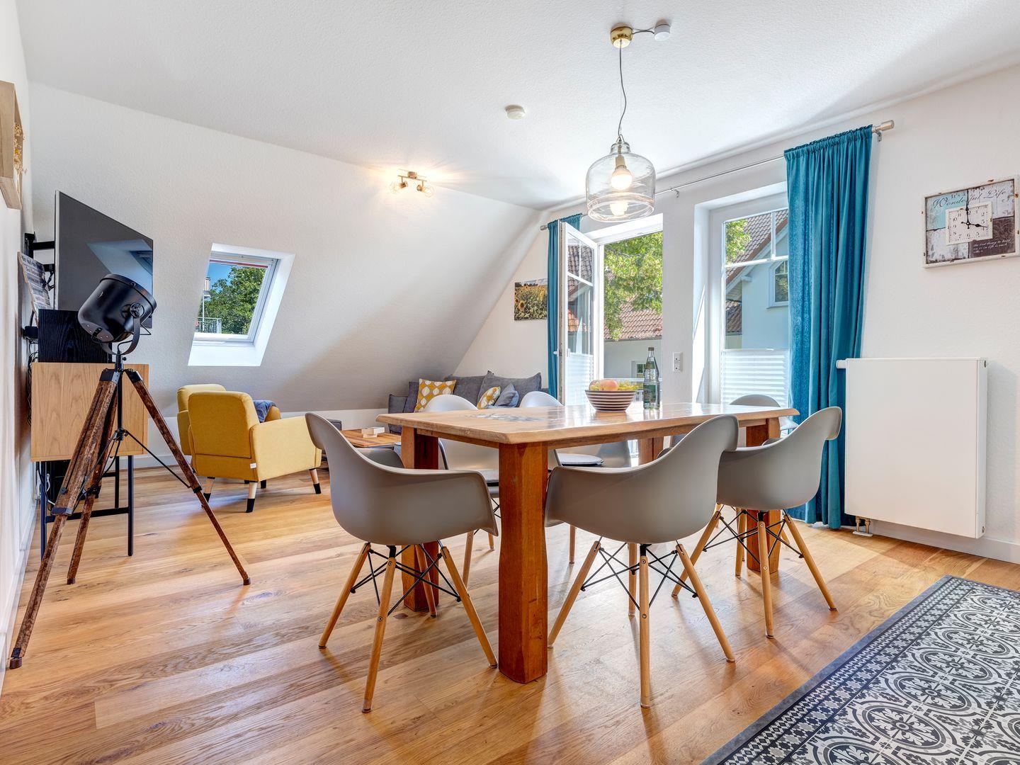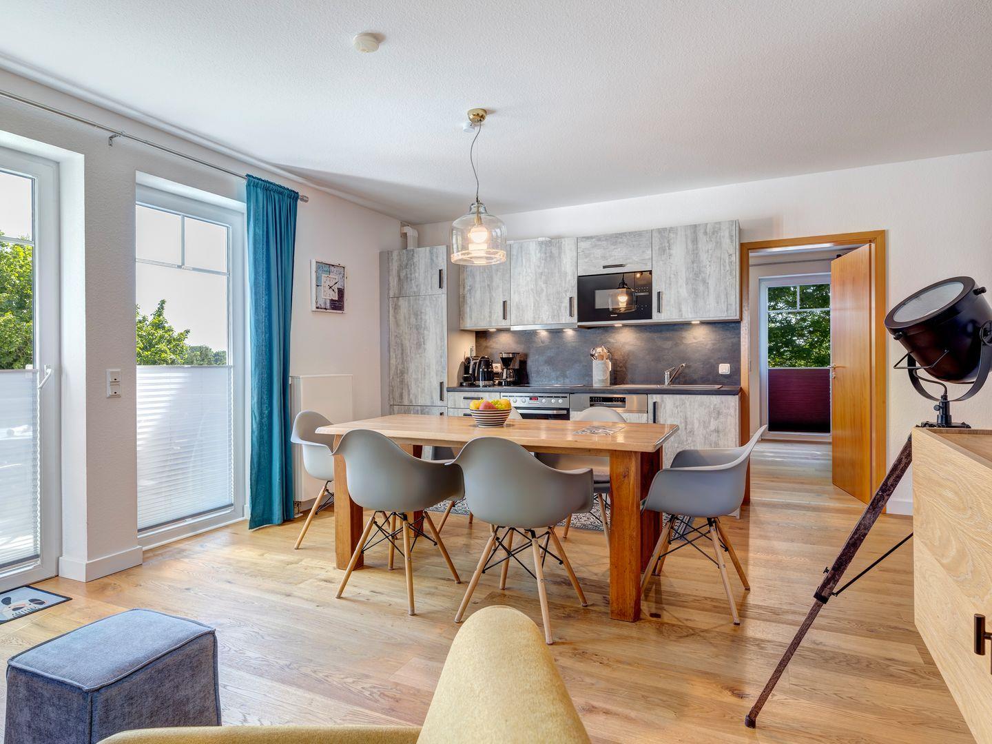 Die Ferienwohnung 7 im Ostseequartett bietet drei Zimmer, darunter zwei einladende Schlafzimmer und ein lichtdurchflutetes Wohn-/Esszimmer mit einer voll ausgestatteten Küchenzeile. Die moderne Küche lässt keine Wünsche offen und ist ideal für gemeinsame Kochabende.