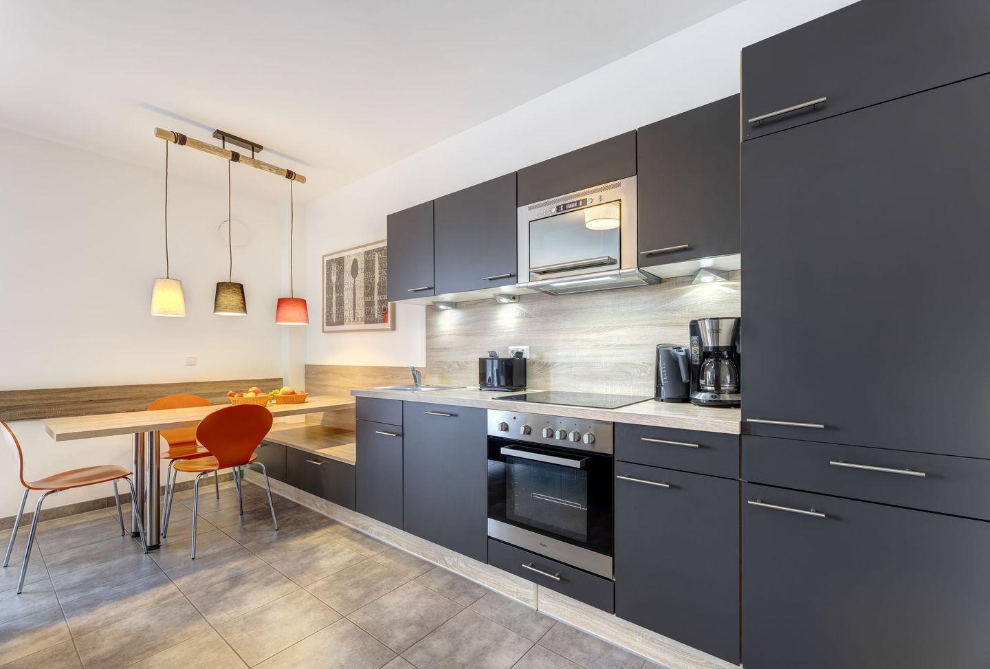 Die Küchenzeile ist mit allerhand relevanten Küchengeräten ausgestattet. So verfügt diese über eine Mikrowelle, einen Geschirrspüler, ein Herd mit Backofen, sowie selbstverständlich einen Kühlschrank mit Gefrierfach. Viele weitere wichtige Helfer ermöglichen das Kochen Ihrer Lieblingsgerichte – auch im Urlaub. Gleich nebendran befindet sich der Esstisch.