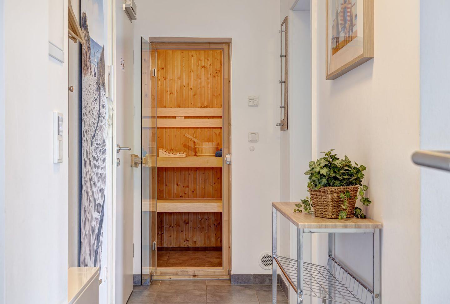 Ein weiteres Highlight dieses schönen Domizils ist die eigene Sauna. Wenn das Wetter einmal nicht Ihr Freund ist, so genießen Sie die wohlige Wärme dieser Sauna.
