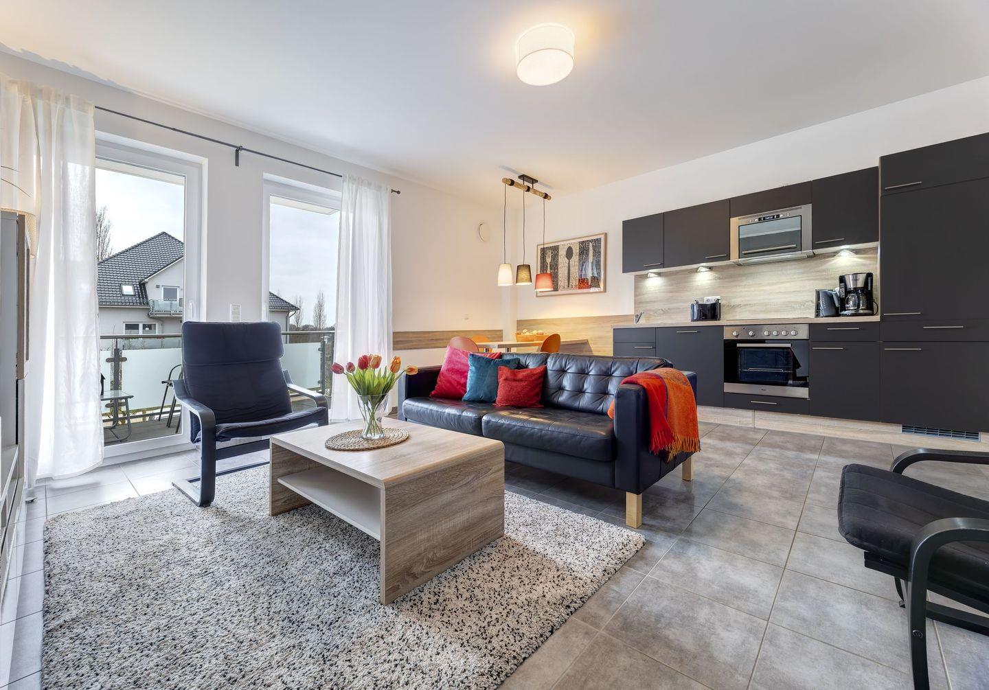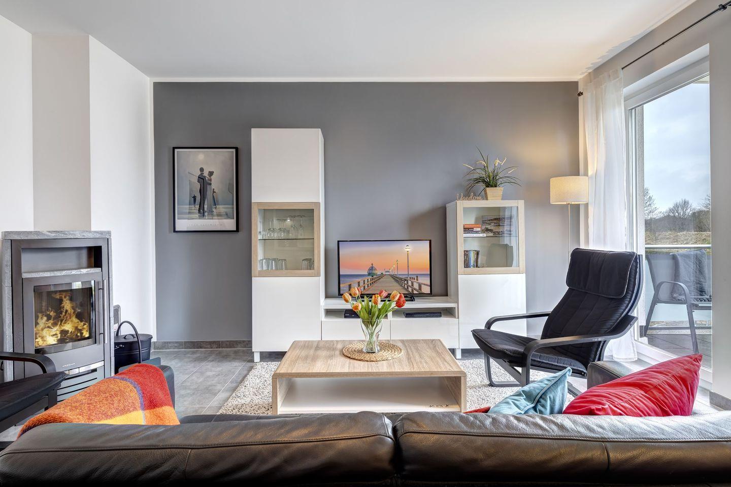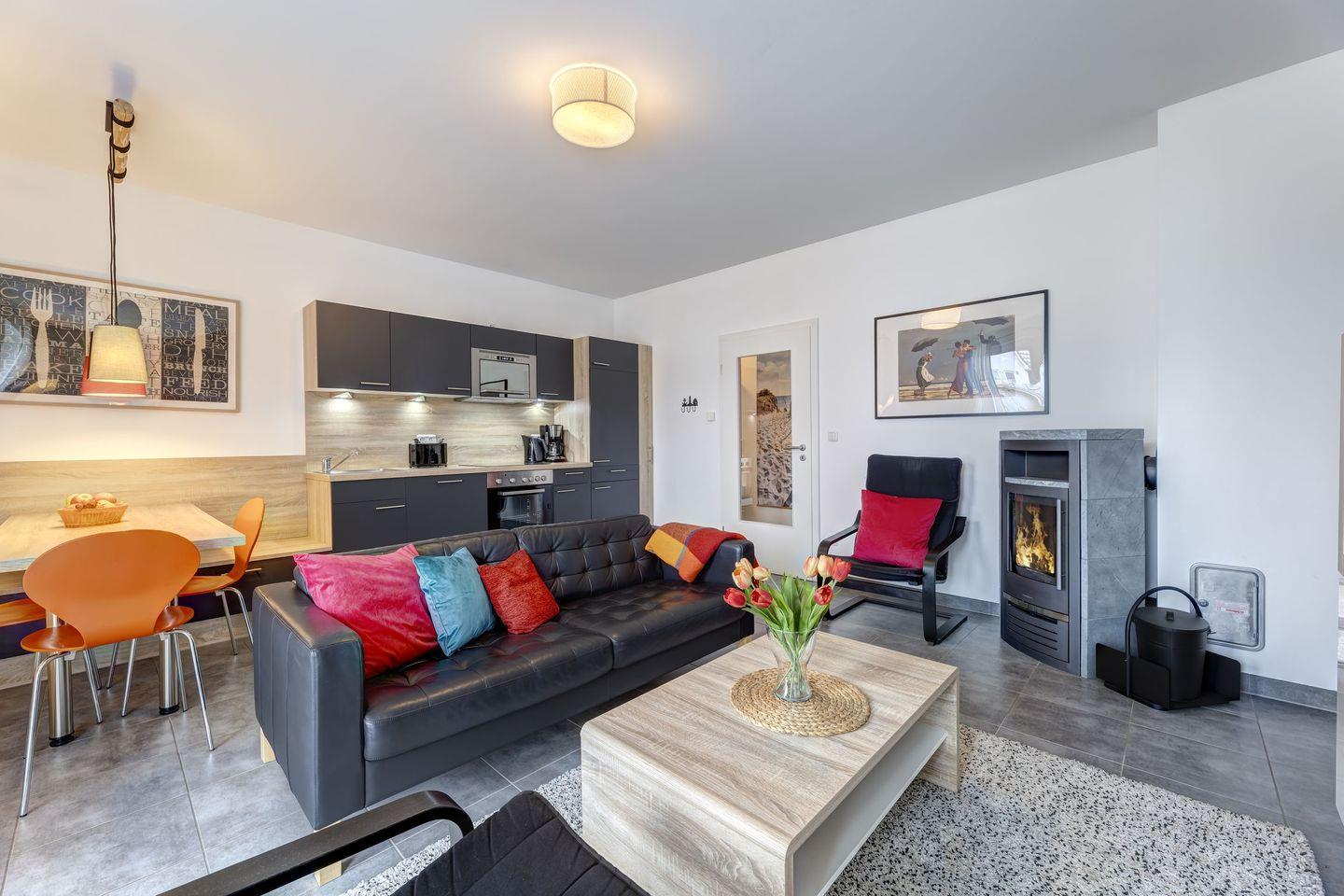 Stillvoll und modern wurde dieses Domizil hergerichtet. Durch warmtonige Farbakzente wird im Wohnraum mit offener Küche eine gemütliche Atmosphäre geschaffen. So findet sich hier eine Ledercouch mit zwei Sessel und ein Smart-TV mit einem zusätzlichen Blu-ray-Player. Ein absolutes Highlight, besonders an kühleren Tagen, stellt der Kaminofen in diesem Raum dar. Machen Sie es sich unter einer kuscheligen Decke mit Ihren Liebsten bequem und genießen bei knisternden Feuerschein einen Film im Fernseher.