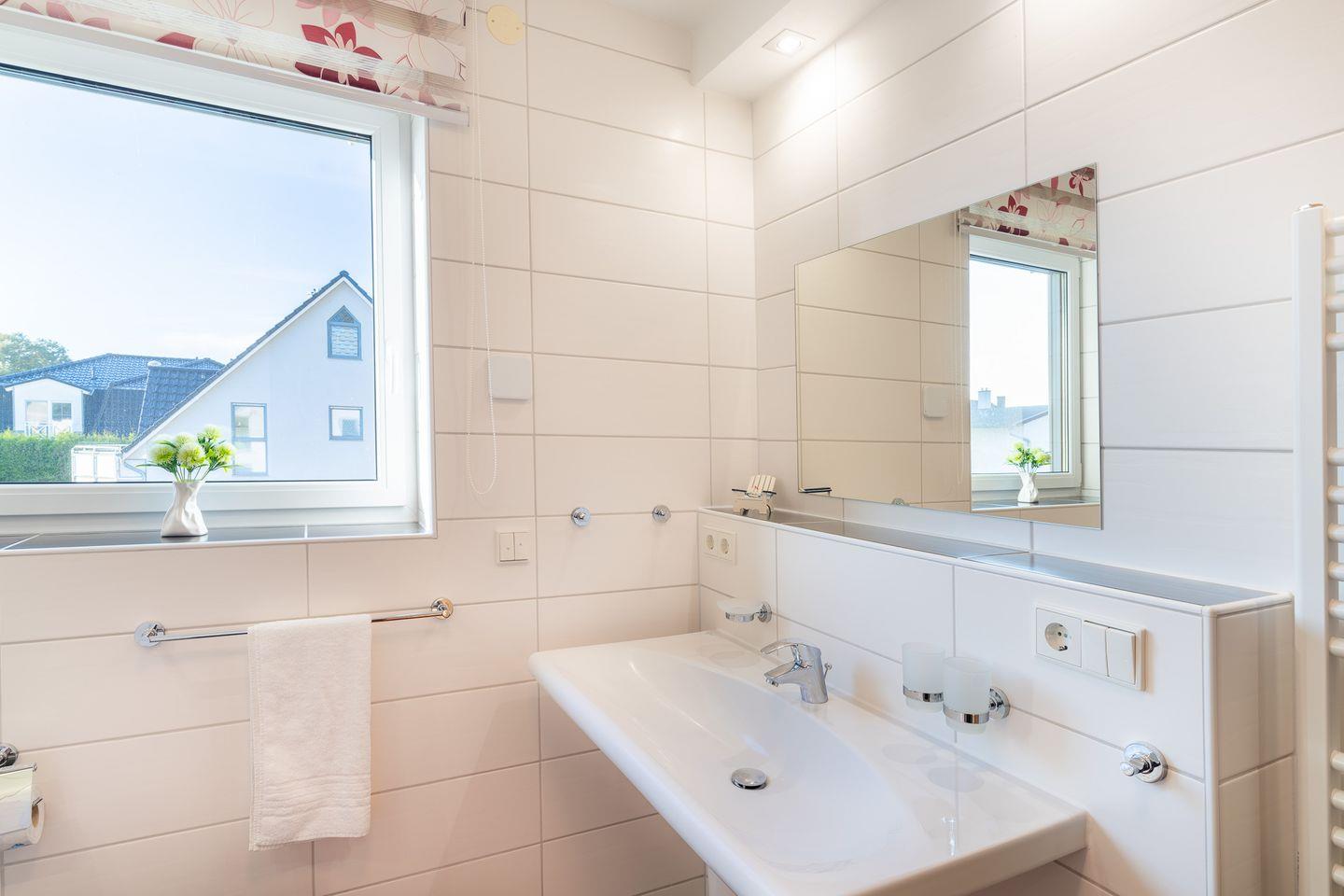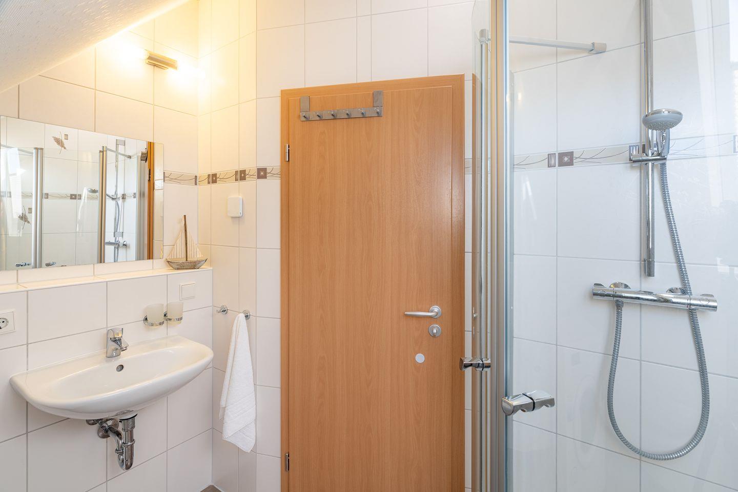 Zwei moderne Bäder stehen Ihnen zur Verfügung, beide mit ebenerdiger Dusche, Fenster und Spiegel, sodass Sie Ihren Tag stets frisch und entspannt beginnen können. Ein TV-Gerät im Wohnbereich sorgt für gemütliche Stunden und Unterhaltung, während ein abschließbarer Fahrradraum Ihnen ermöglicht, Ihr Fahrrad sicher zu verwahren. Ein reservierter Stellplatz direkt vor der Tür erleichtert zudem die Anreise, sodass Sie Ihren Aufenthalt ohne zusätzliche Sorgen genießen können.