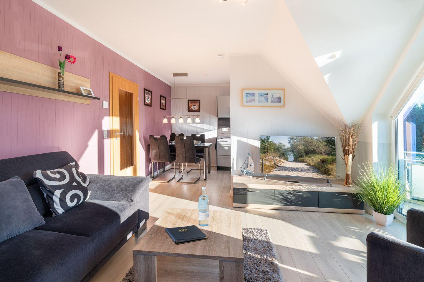 Die Ferienwohnung Haus Buchenweg 07, eine charmante Maisonette-Wohnung im Ostseebad Zinnowitz, verspricht einen erholsamen und komfortablen Urlaub auf der idyllischen Insel Usedom. Mit 83 m² Wohnfläche, verteilt auf zwei Etagen und gelegen in der ersten Etage eines gepflegten Gebäudes, bietet diese Wohnung modernen Komfort in einem maritimen Ambiente. Zwei liebevoll eingerichtete Schlafzimmer sorgen für ruhige Nächte und erholsamen Schlaf – ideal für Familien, Paare oder kleine Gruppen. Das geräumige Wohnzimmer, das nahtlos mit der offenen Küche verbunden ist, präsentiert sich lichtdurchflutet und einladend. Die Küche ist vollständig ausgestattet und lässt mit Geräten wie Backofen, Spülmaschine, Ceranfeld und Mikrowelle keine Wünsche offen. Von hier aus gelangen Sie direkt auf den Balkon, der dazu einlädt, laue Abende in frischer Meeresluft ausklingen zu lassen.