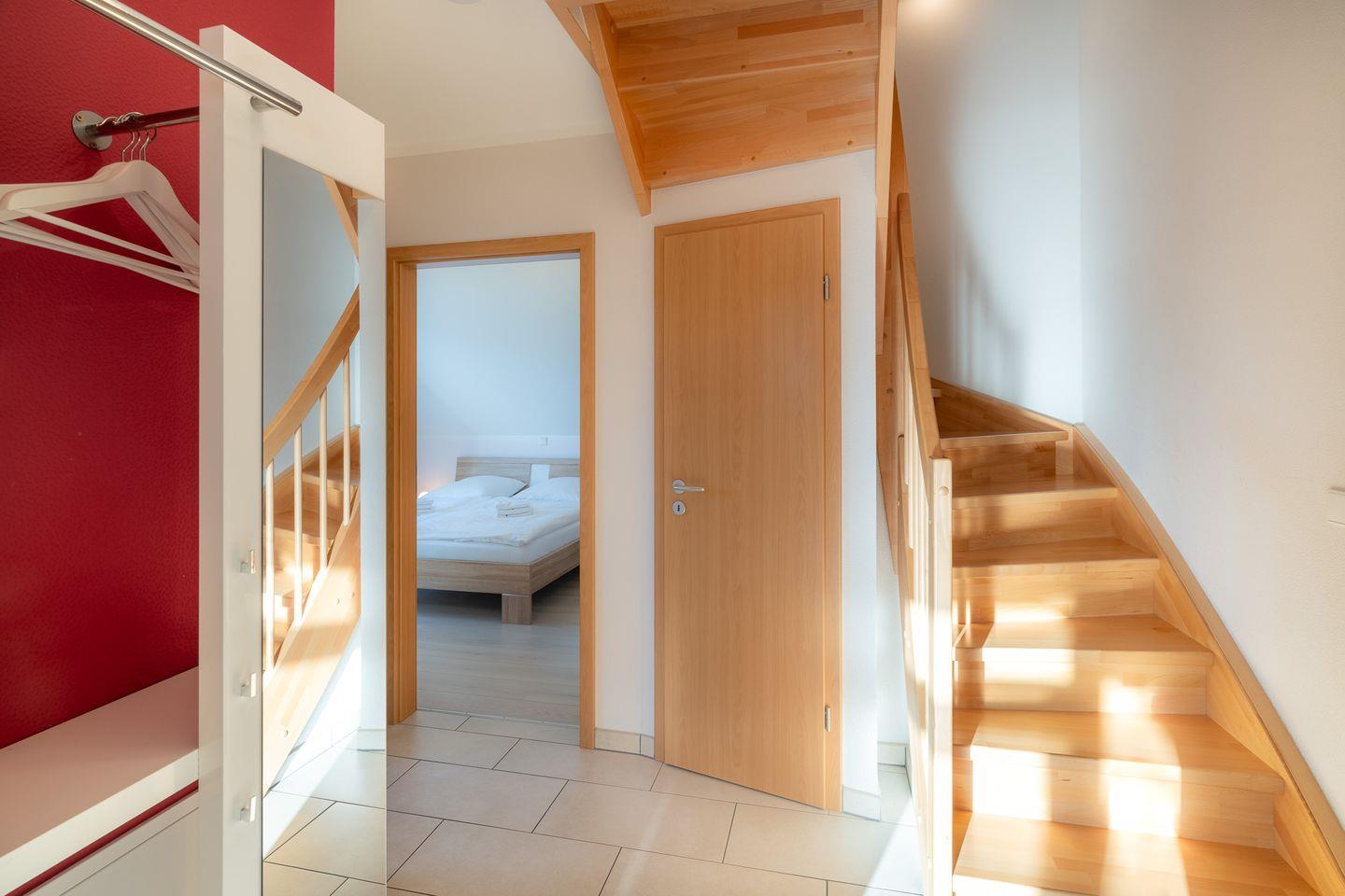 Der Wohnraum bietet Ihnen eine große Couchecke mit Flatscreen-TV, Radio und bodentiefen Balkonfenstern. In der Küche werden Sie neben unverzichtbaren Küchengeräten, wie Herd mit Backofen, Spülmaschine, Kühlschrank und Mikrowelle, auch hilfreiche Utensilien, wie einen Eierkocher und eine Senseo Pad Maschine vorfinden. Vom Wohnbereich aus erreichen Sie den großen möblierten Balkon. Auf der gleichen Ebene befindet sich das Schlafzimmer mit Doppelbett und Sideboard.