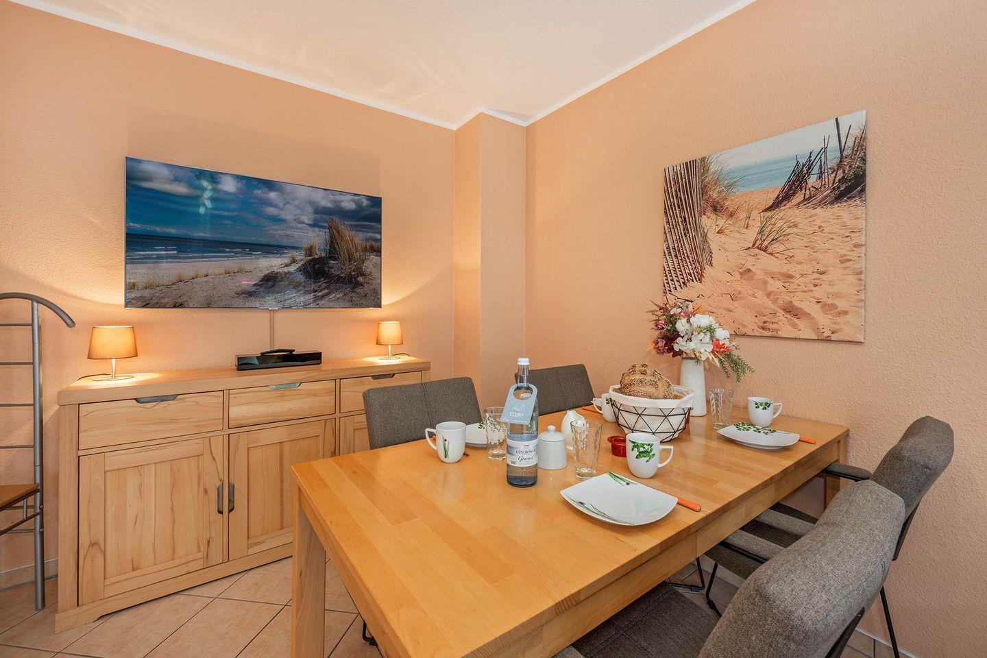 Das Quartier am Kirchberg bietet ruhesuchenden Gästen, welche dennoch die zentrale Lage schätzen, den perfekten Ausgangspunkt. Einkaufsmöglichkeiten, Restaurants, Bäckereien und natürlich auch die öffentlichen Verkehrsmittel und den Strand erreichen Sie von hier aus in wenigen Minuten. Im Erdgeschoss dieser Wohnanlage befindet sich die 65 Quadratmeter große Drei-Raum-Wohnung.