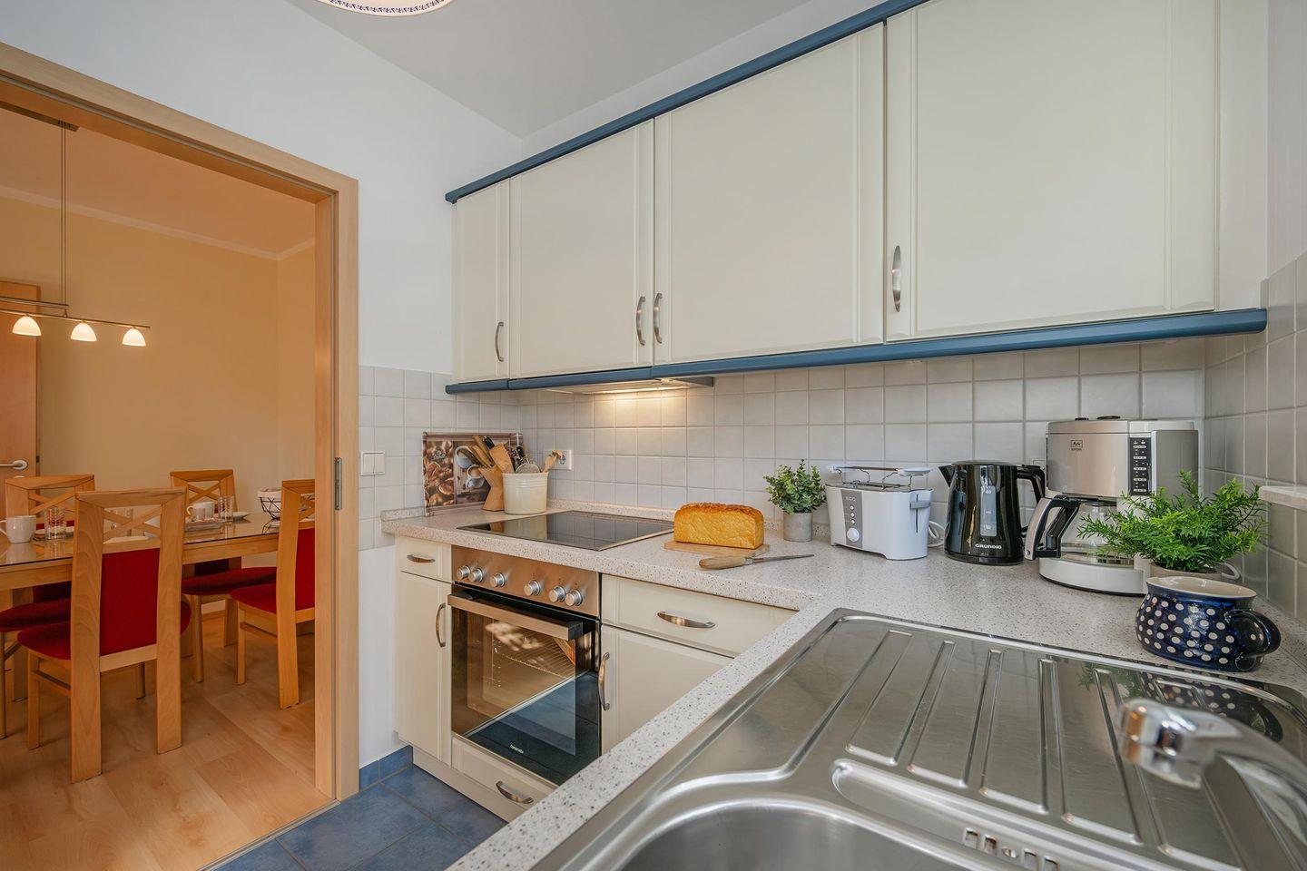 Die separate Küche, die alle Funktionen moderner Küchengeräte wie Backofen, Spülmaschine, Ceranfeld und Mikrowelle bietet, ist offen zum angrenzenden Wohnraum gestaltet. So können Sie in Ruhe Ihre Lieblingsgerichte zubereiten und gleichzeitig den Blick in den gemütlichen Aufenthaltsbereich genießen. Der angrenzende Essbereich lädt zu geselligen Mahlzeiten ein, während die angrenzende Terrasse einen herrlichen Außenbereich bietet, in dem Sie bei einer Tasse Kaffee oder einem Glas Wein die frische Seeluft genießen können.