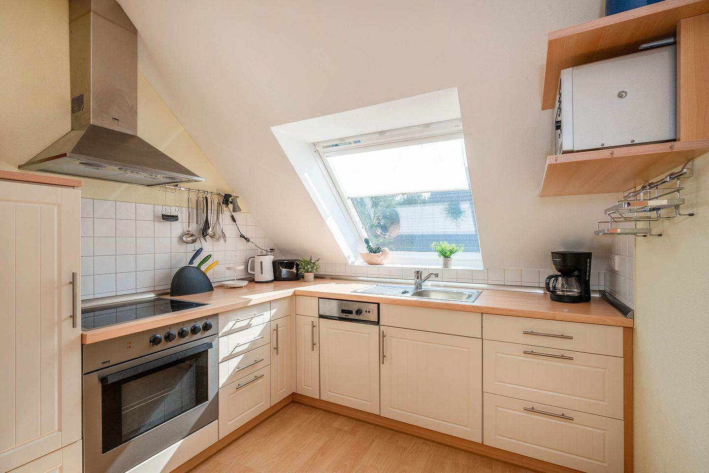 Die Ferienwohnung Nummer 11 erstreckt sich auf 86 Quadratmetern im Dachgeschoss des Hauses und bietet Platz für bis zu vier Personen. Der Wohn- & Küchenbereich ist komfortabel gestaltet und verfügt über ein Sofa, Sessel und einen TV. Die Küche ist offen zum Wohnbereich, jedoch durch die durchdachte Raumaufteilung klar abgegrenzt. Sie verfügt über eine vollwertige Ausstattung mit den wichtigsten Küchenhelfern, wie ein Herd mit Backofen, Kühlschrank und einer Spülmaschine. Der Essbereich befindet sich unmittelbar davor. Vom Wohnbereich erreichen Sie den großzügig geschnittenen Balkon.