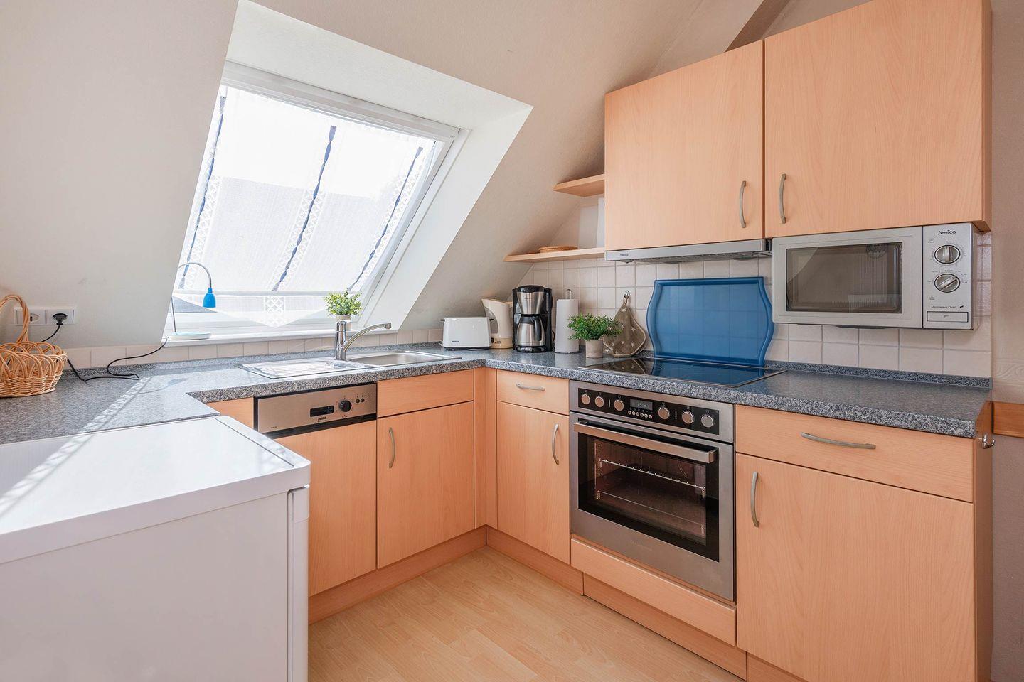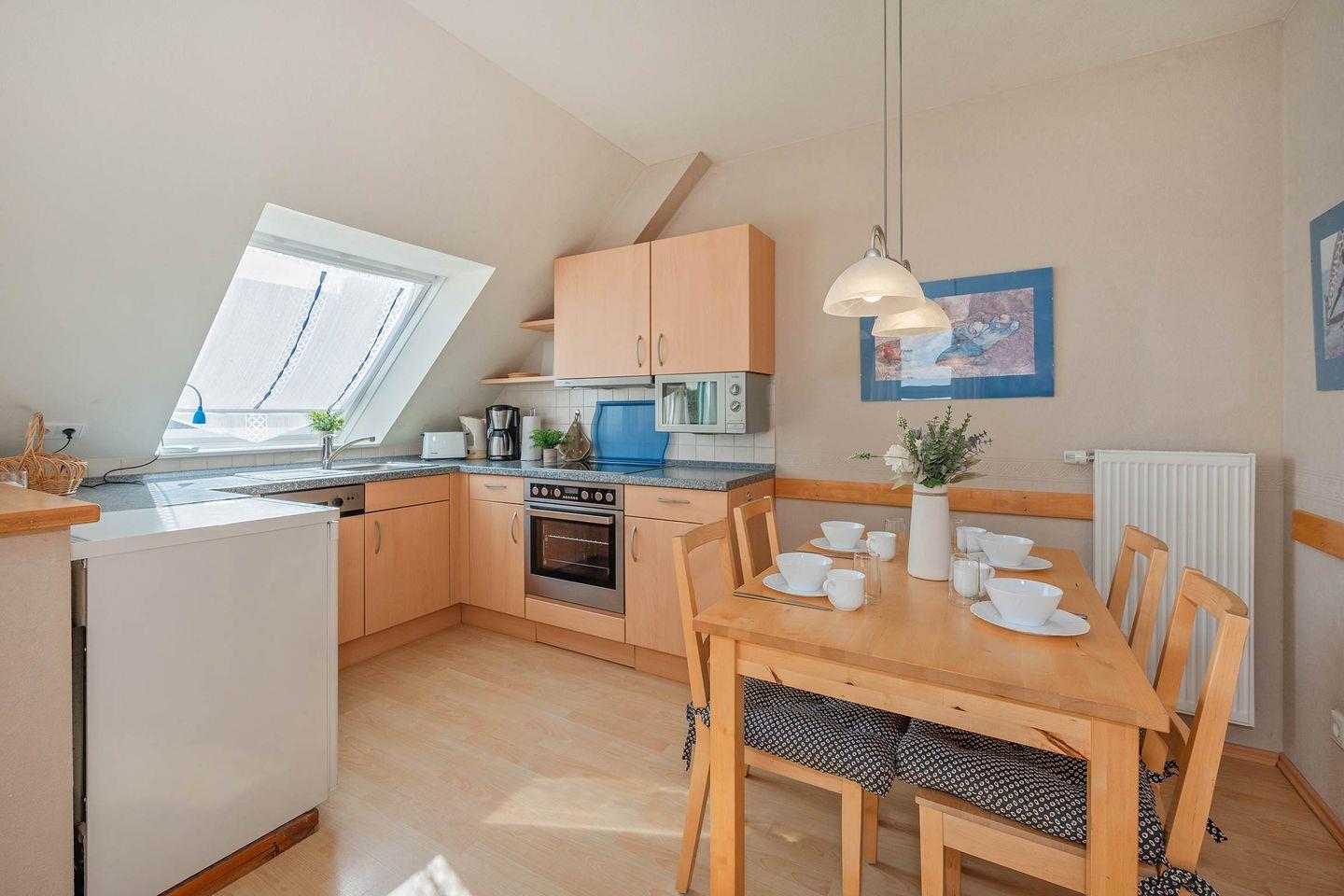 Im offenen Wohn- und Essbereich erwartet Sie eine voll ausgestattete Küche mit Backofen, Ceranfeld, Spülmaschine und Mikrowelle - perfekt für gemütliche Kochabende oder einen schnellen Snack zwischendurch. Der angrenzende Wohnbereich lädt mit gemütlichen Sitzmöbeln und einem TV-Gerät zu entspannten Stunden ein. Der Zugang zum Süd-West-Balkon ermöglicht es Ihnen, die frische Ostseeluft direkt zu genießen.