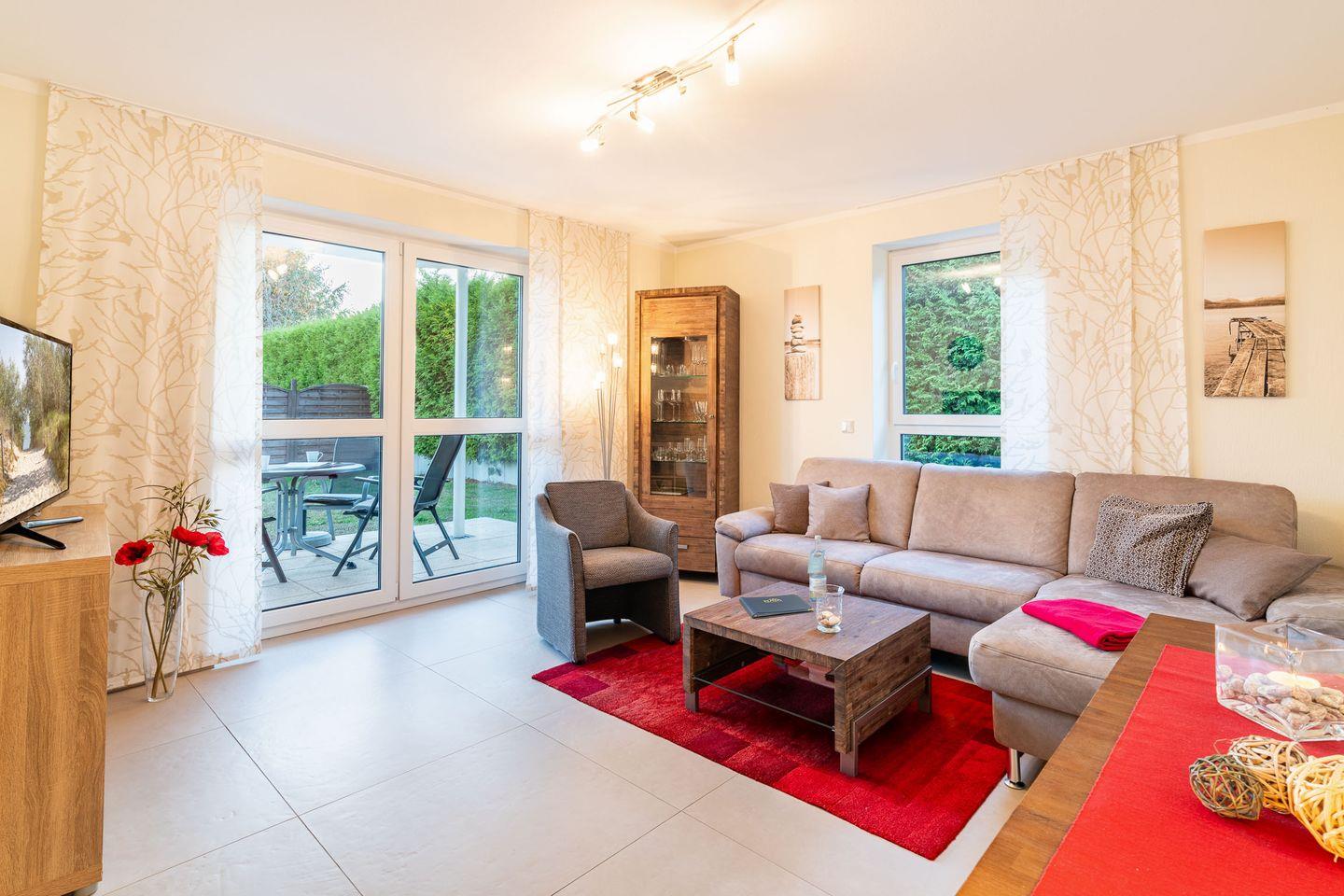 Der offene Wohnbereich, der durch seine klare Raumaufteilung besticht, verbindet den Ess- und Wohnbereich harmonisch miteinander. Von hier aus gelangen Sie direkt auf die großzügige Terrasse, die sich perfekt zum Frühstücken, für gemütliche Abende oder zum Entspannen in der frischen Seeluft eignet. Kinder sind hier herzlich willkommen, da die Umgebung sowohl sicher als auch einladend ist.