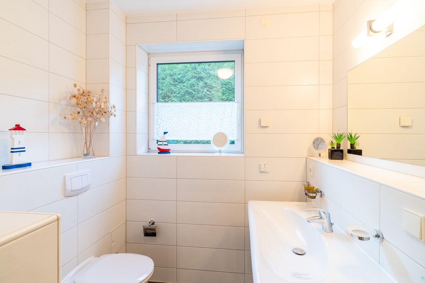 Das moderne Badezimmer verfügt über eine ebenerdige Dusche, ein Fenster, das für angenehmes Tageslicht sorgt, sowie einen großzügigen Spiegel. Diese Ausstattung sorgt für ein erfrischendes Startgefühl in den Tag und rundet den Wohnkomfort ab. Ein TV-Gerät im Wohnbereich bietet zusätzliche Unterhaltung, während elektrische Verdunklungsrollos für ungestörte Ruhe in den privaten Rückzugsbereichen sorgen.